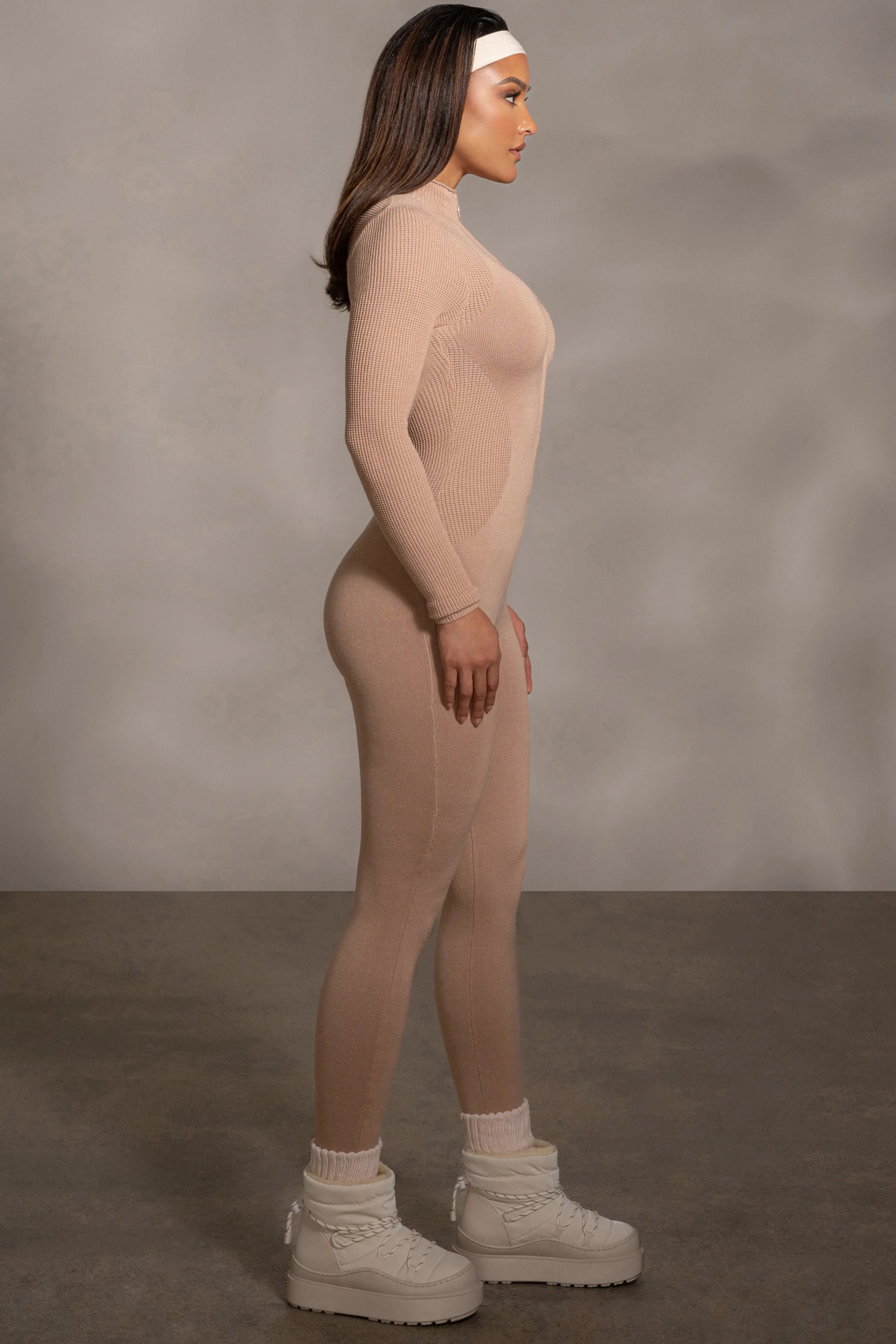 A winter favorite, the Beige Kris Front Zipper Jumpsuit takes center stage. Boasting a mock neckline with a front zipper design, long sleeves for added warmth, and waffle detailing on both sides for a touch of texture. The perfect combination of style and comfort. Stretchy. Single lined.