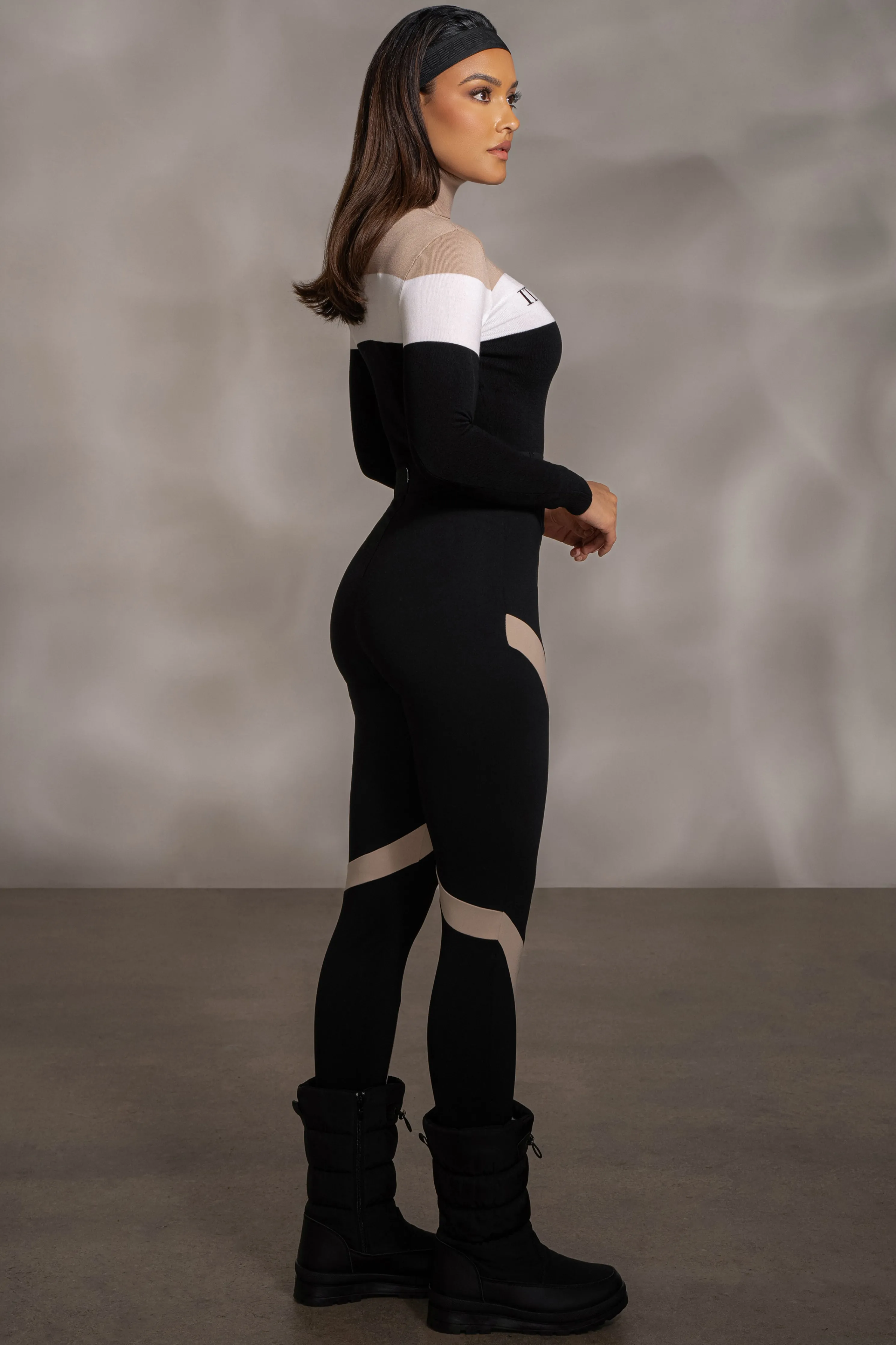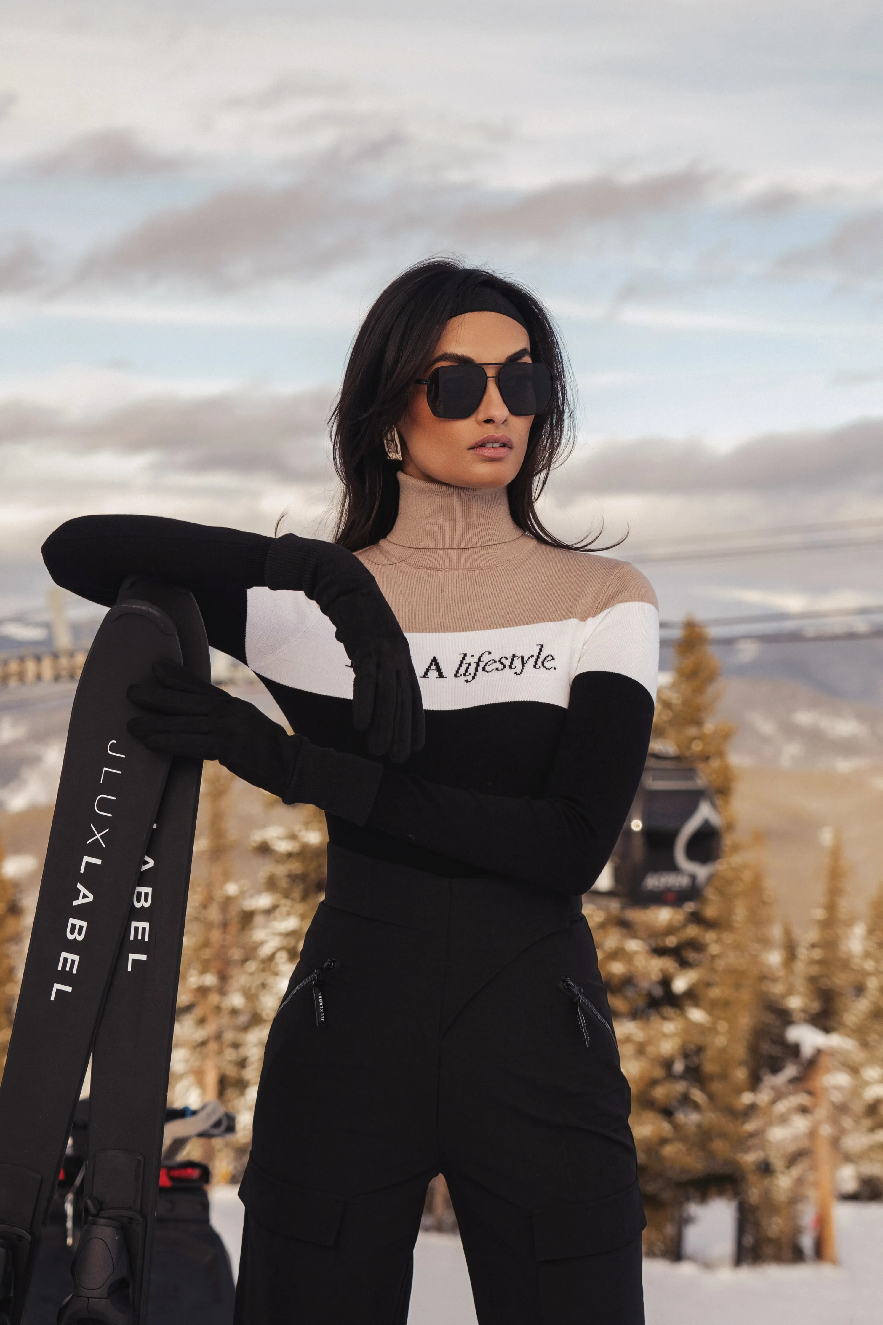 Experience cold weather luxury with our Beige Lifestyle Knit Bodysuit. This turtleneck piece showcases a stylish color block design, adorned with our signature ‘IT’S A LIFESTYLE’ logo at the center. Crafted from soft rib-knit fabric, it offers a stretchy, comfortable fit, complete with a thong back and double snap closure. Pair with our Nyah Nylon Utility Pants for the full look. Single lined.