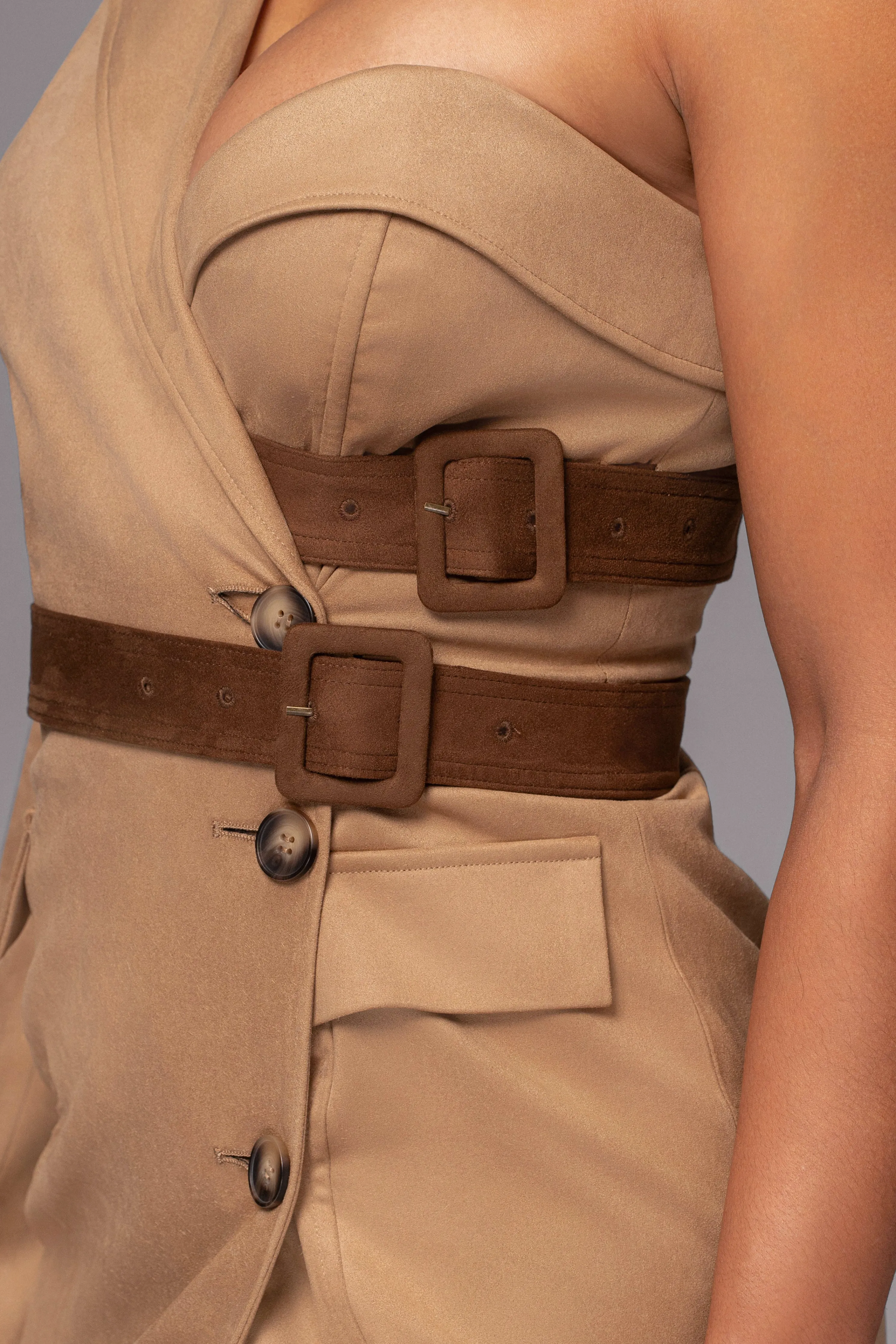 Introducing our most coveted piece this season, our Beige One-Shoulder Suede Blazer Dress. Featuring a blazer inspired design, this one shoulder mini dress exudes tailored sophistication with shoulder padding and boning for a structured fit. Details include a front button closure with a sleek slit, non-functional flap pockets, and chocolate suede waist belts with squared buckles. Crafted from a ultra rich suede fabric, making this piece the ultimate statement of winter style. Double lined. No stretch.