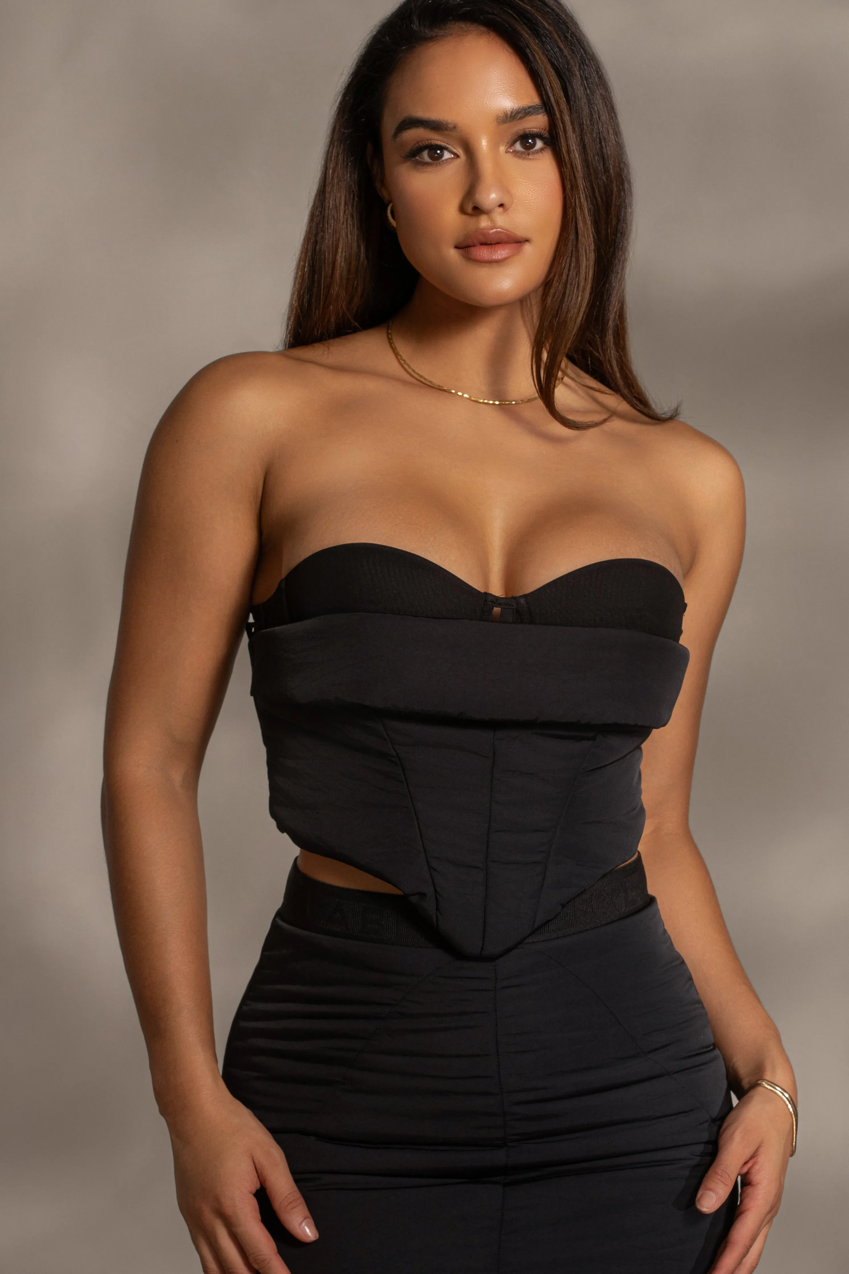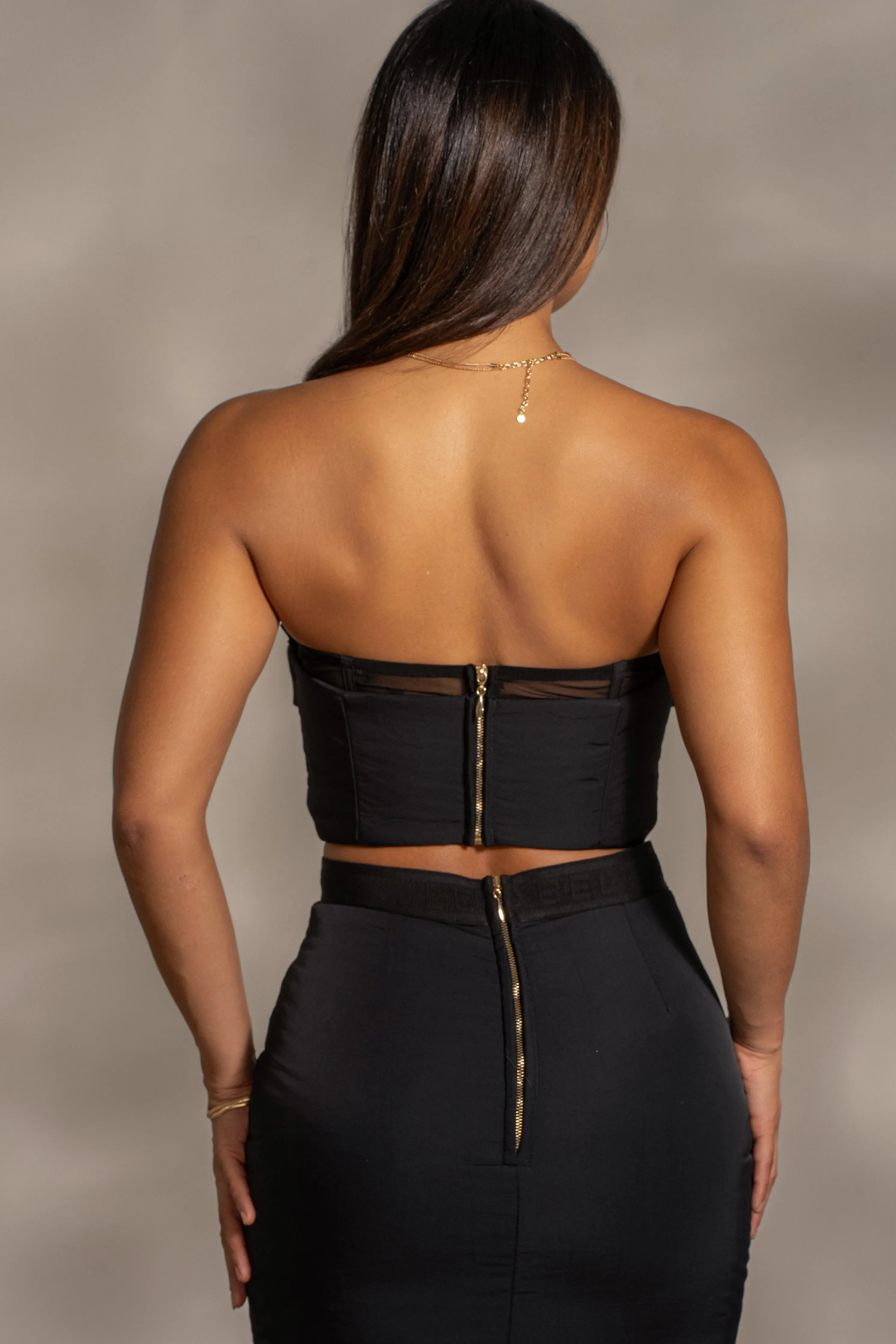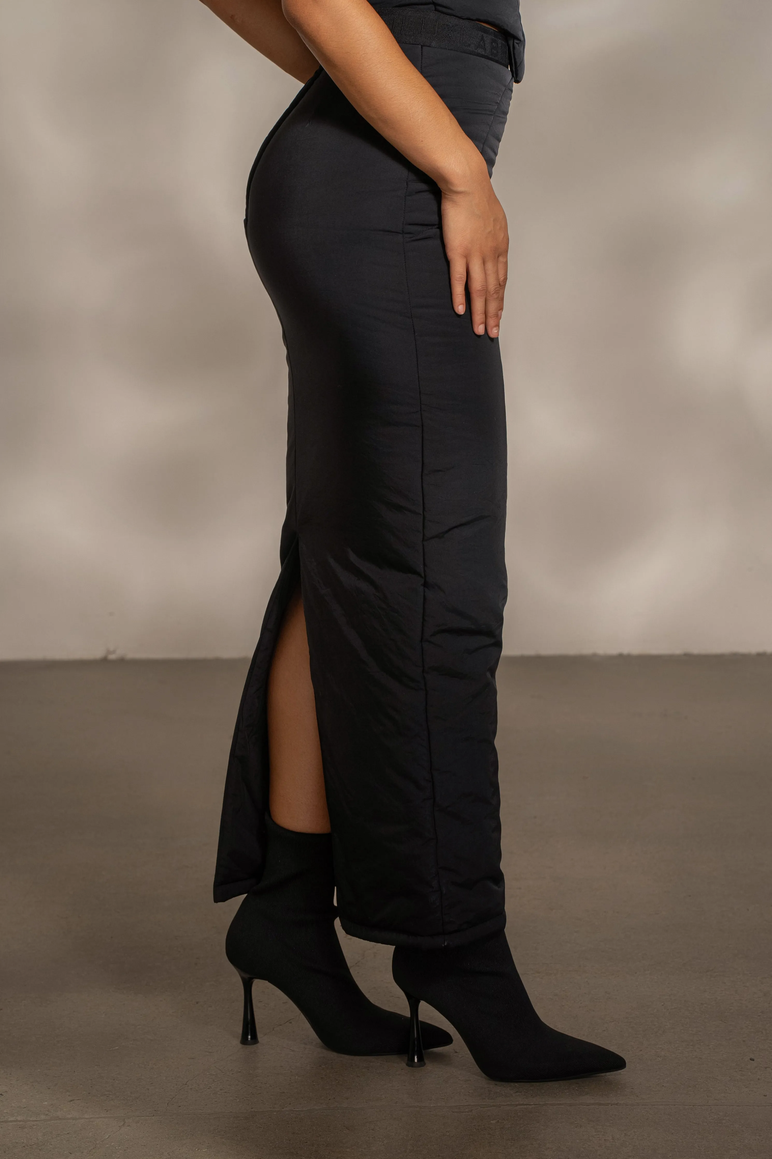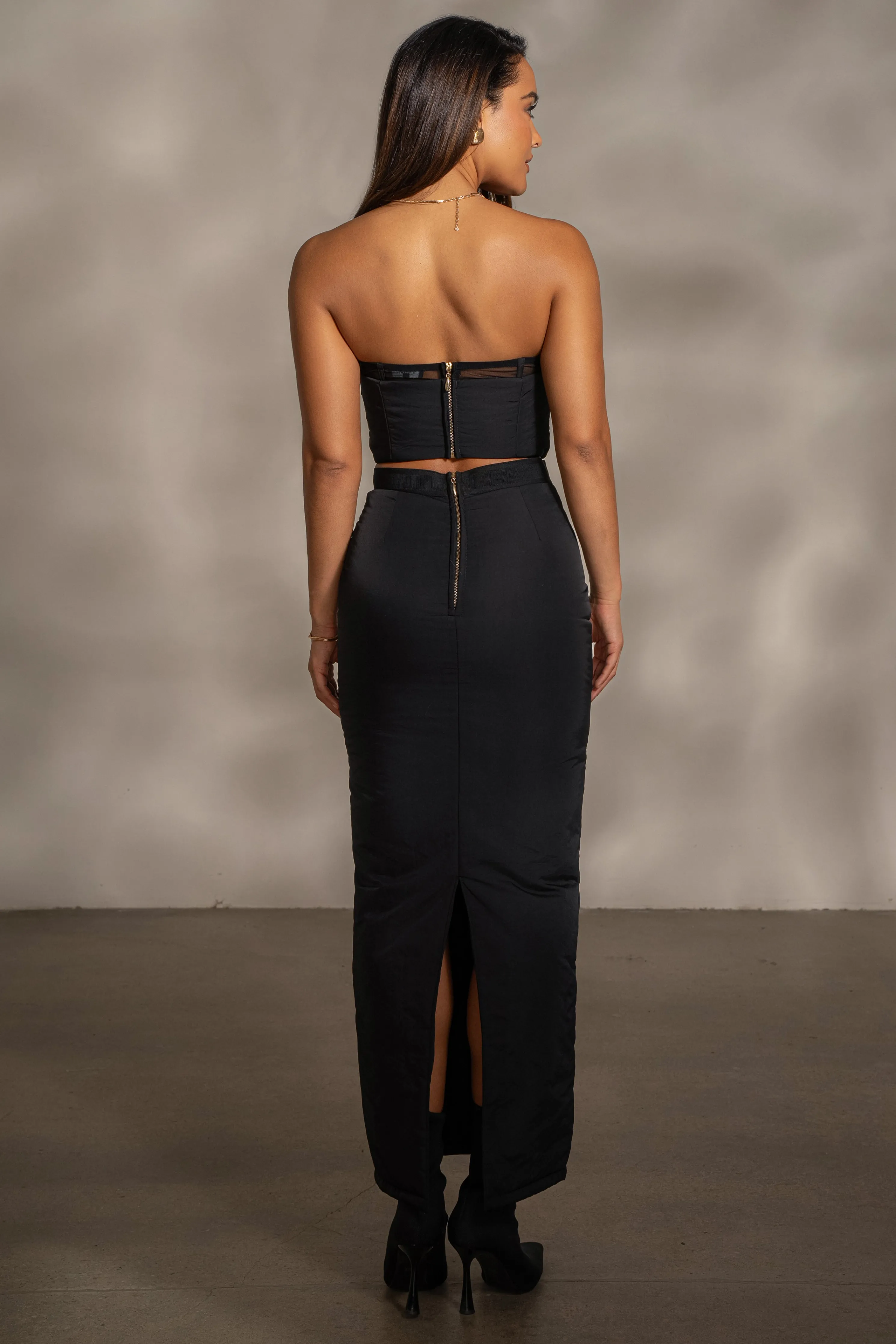Our Black Addyson Skirt Set is a cold weather must have This all-weather puffer ensemble features a corset-inspired top with wired/padded cups and boning for structure. The matching skirt showcases a high waist and an elastic waistband adorned with our Jluxlabel logo. Made from insulated puffer fabric, this skirt set guarantees warmth with its quilted layers, providing comfort in any weather. Water resistant. Sold as a set.