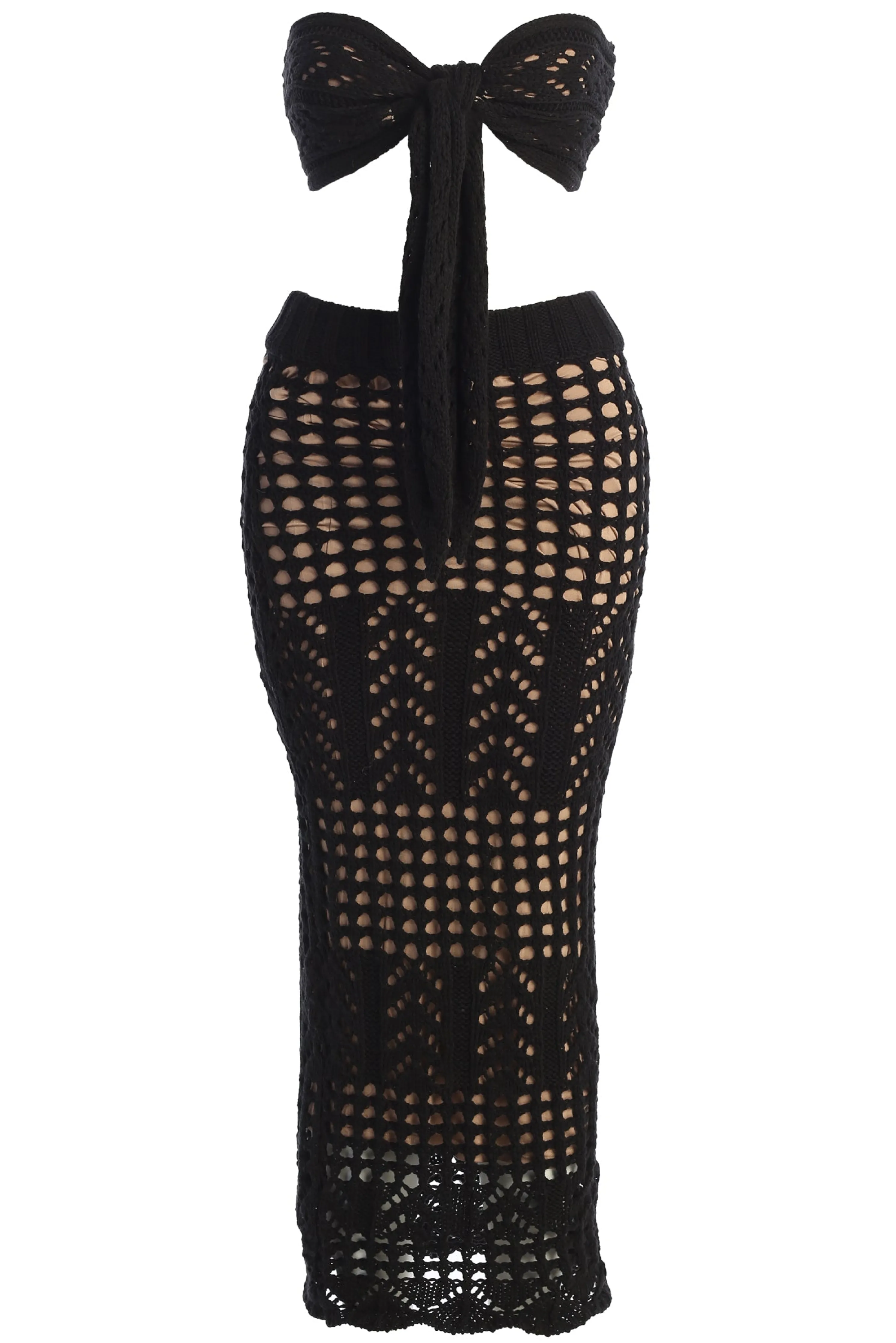 Embrace warmer days in the Noir Caribbean Skies Skirt Set. Crafted in a custom designed airy crochet material, our newest skirt set features a sweet crochet bandeau style top with tie front design and interior lining for coverage. The matching skirt features a pencil silhouette withscallop trim hem and nude interior lining for coverage. Elastic band. Stretchy. Sold as set. Double Lined.