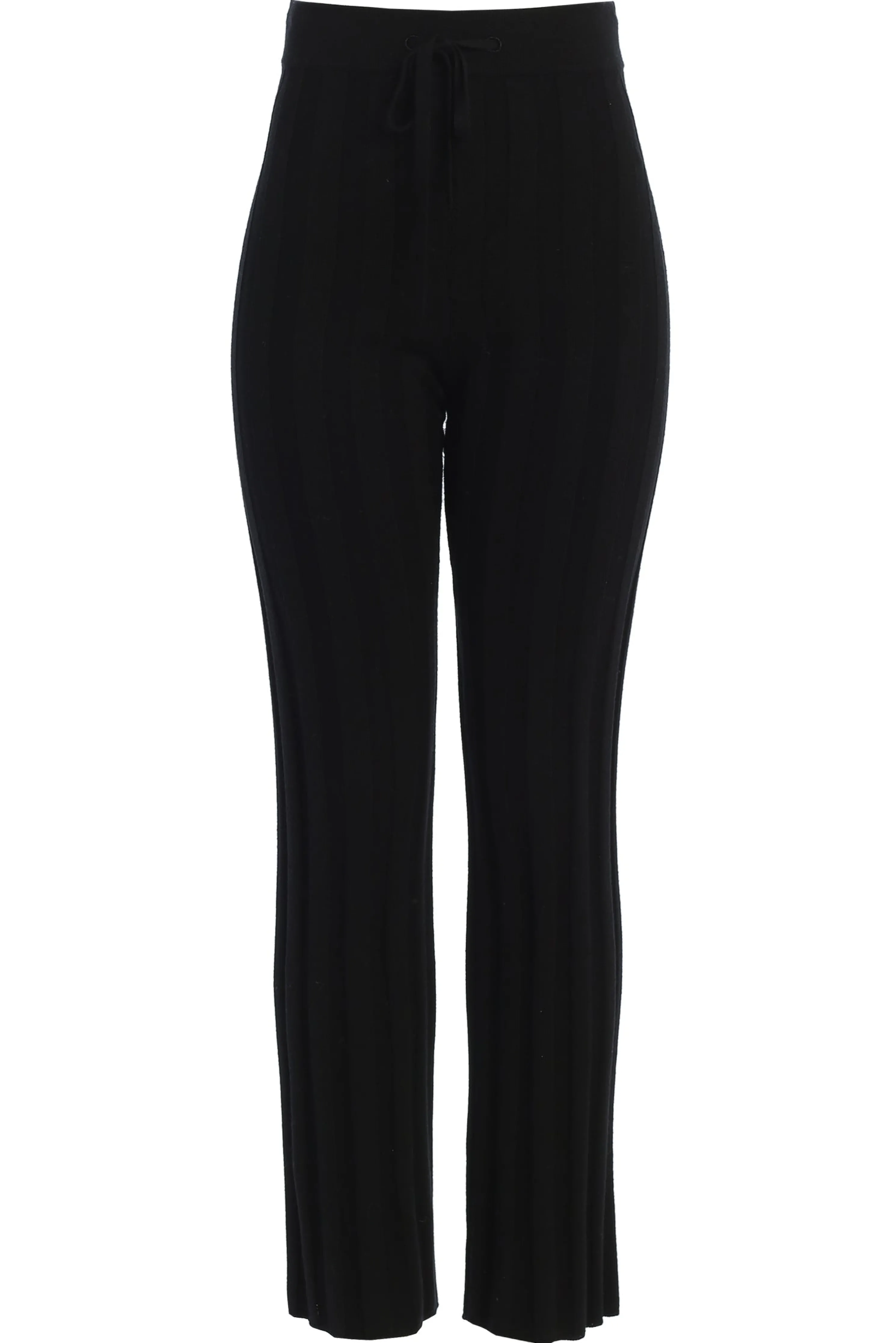 Experience comfort with our Black Darcey Ribbed Pants. Adorned with thick ribbed panels, these textured straight leg pants feature an elastic waistband and drawstring ties to ensure a perfect fit. Pair with our Lori Sheer Knit Bodysuitfor the full look. Stretchy. Single lined.
