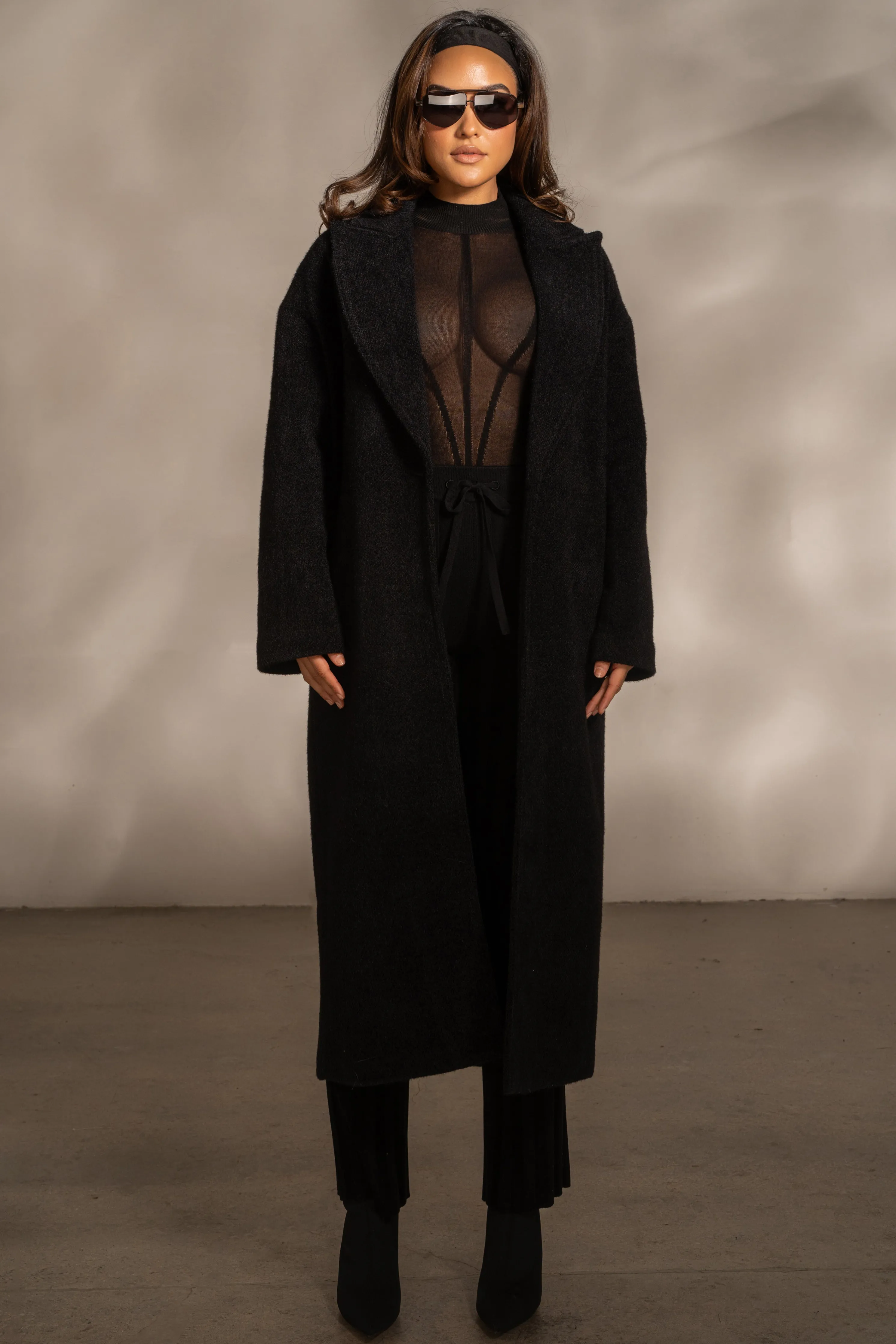 TheBlackDion Oversized Coat is the most elegant layering piece of the moment. This elevated coat is designed in soft knit fuzzy fabric and features stylish notch lapels, long-sleeve arms, and a double-breasted front with two functional side pockets. Pair with our Lori Sheer Knit Bodysuit andDarcey Ribbed Pants for the full look. Lined interior. Oversized.