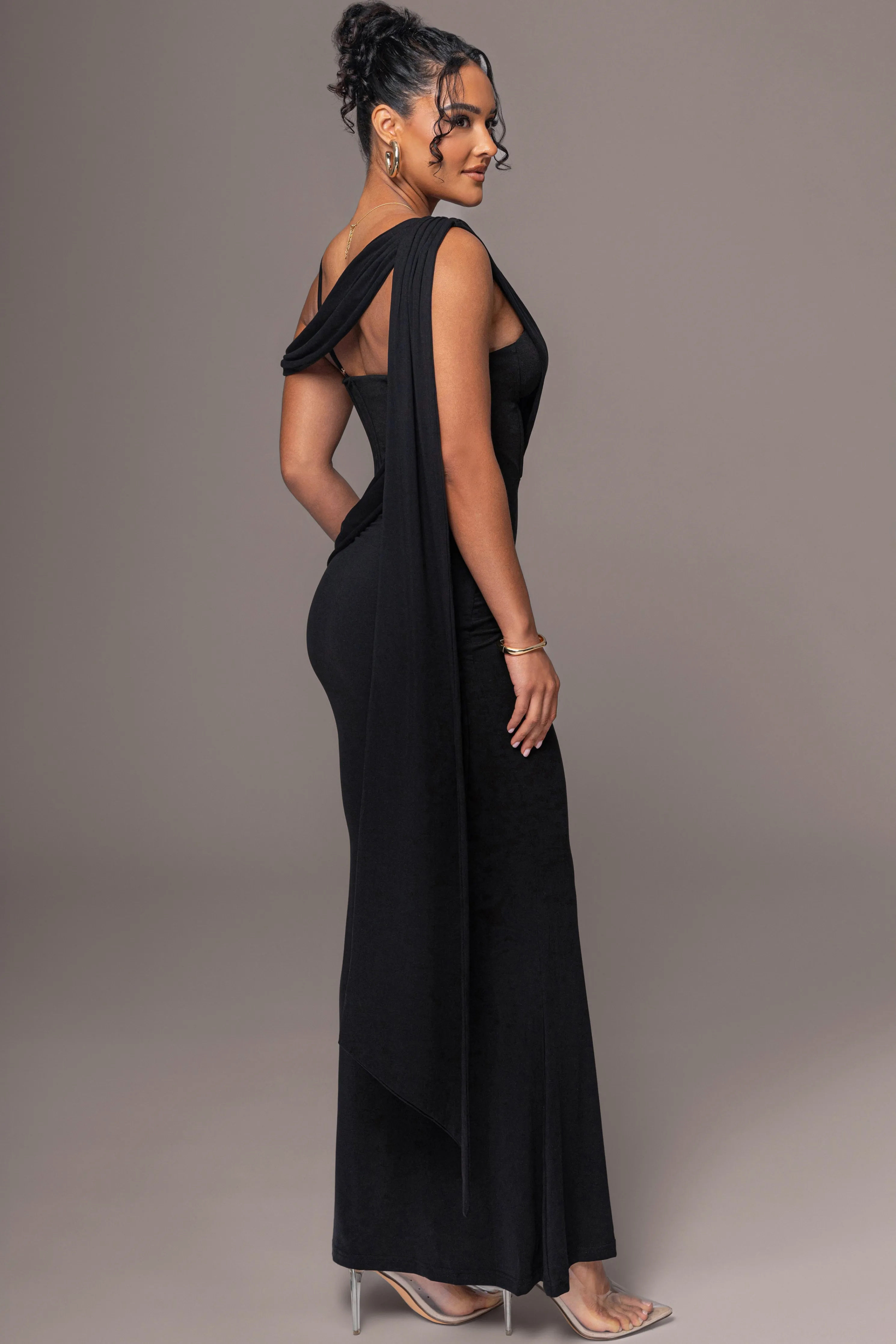 Introducing the Black Grand Entrance Drape Dress, a show-stopping maxi designed to turn heads. Featuring a built-in corset with adjustable/removable shoulder straps, a non-slip gel grip at the bust, and a flared hem. Elegant front and back drapes attach at the shoulders, creating a graceful, draped silhouette. Made from ultra-soft, double-lined modal with a hidden side zipper. Stretchy.