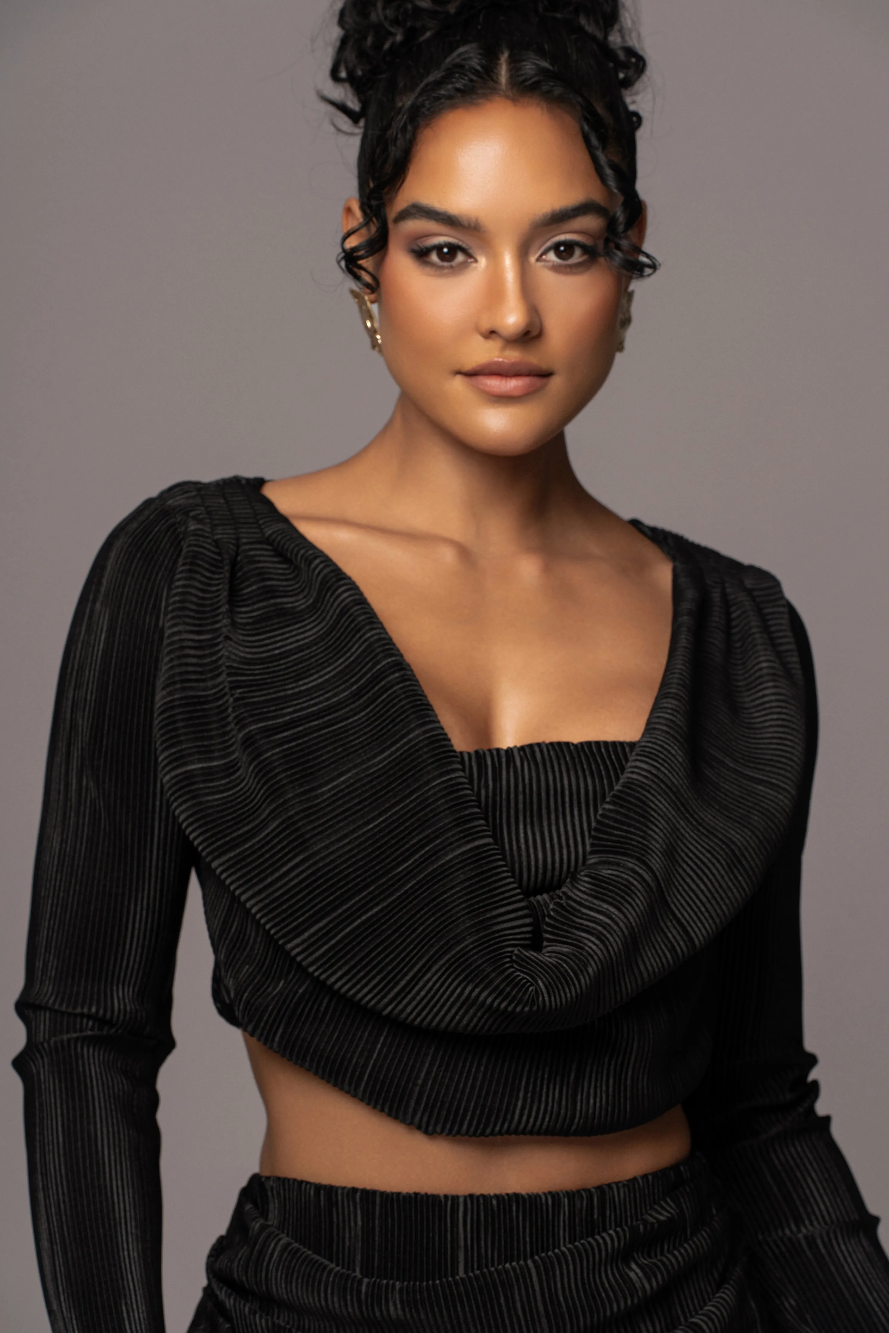 Step into elegance with our Black Haidyn Skirt Set. This summer skirt set features a stylish crop top with long sleeve arms and a draped cowl neck with hidden side zipper closure. The matching maxi skirt highlights draping at the waistline with curve-hugging silhouette and side zipper closure. Style together or separate, both pieces are designed in a pleated fabric with double-lined interior. Stretchy. Sold as set.