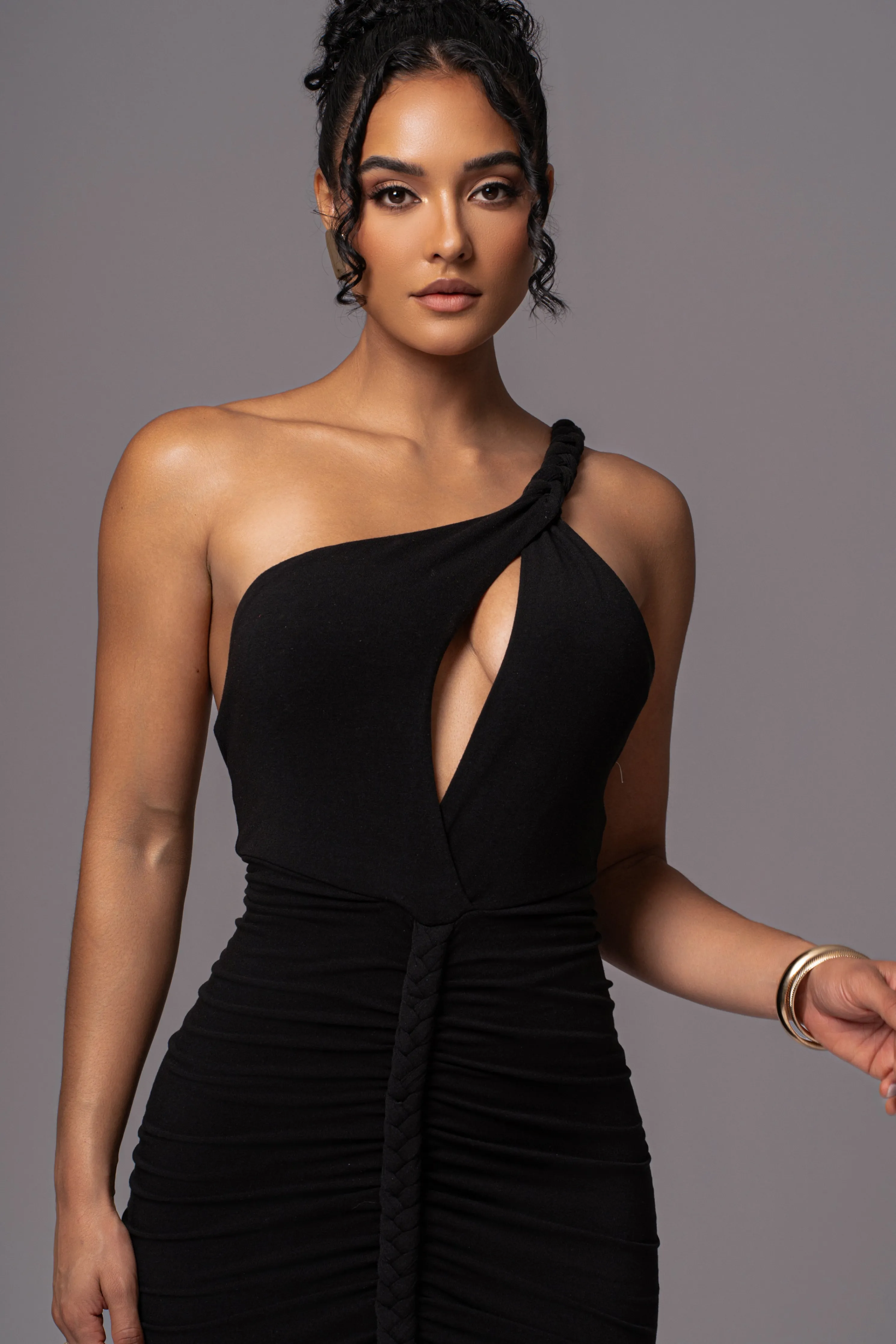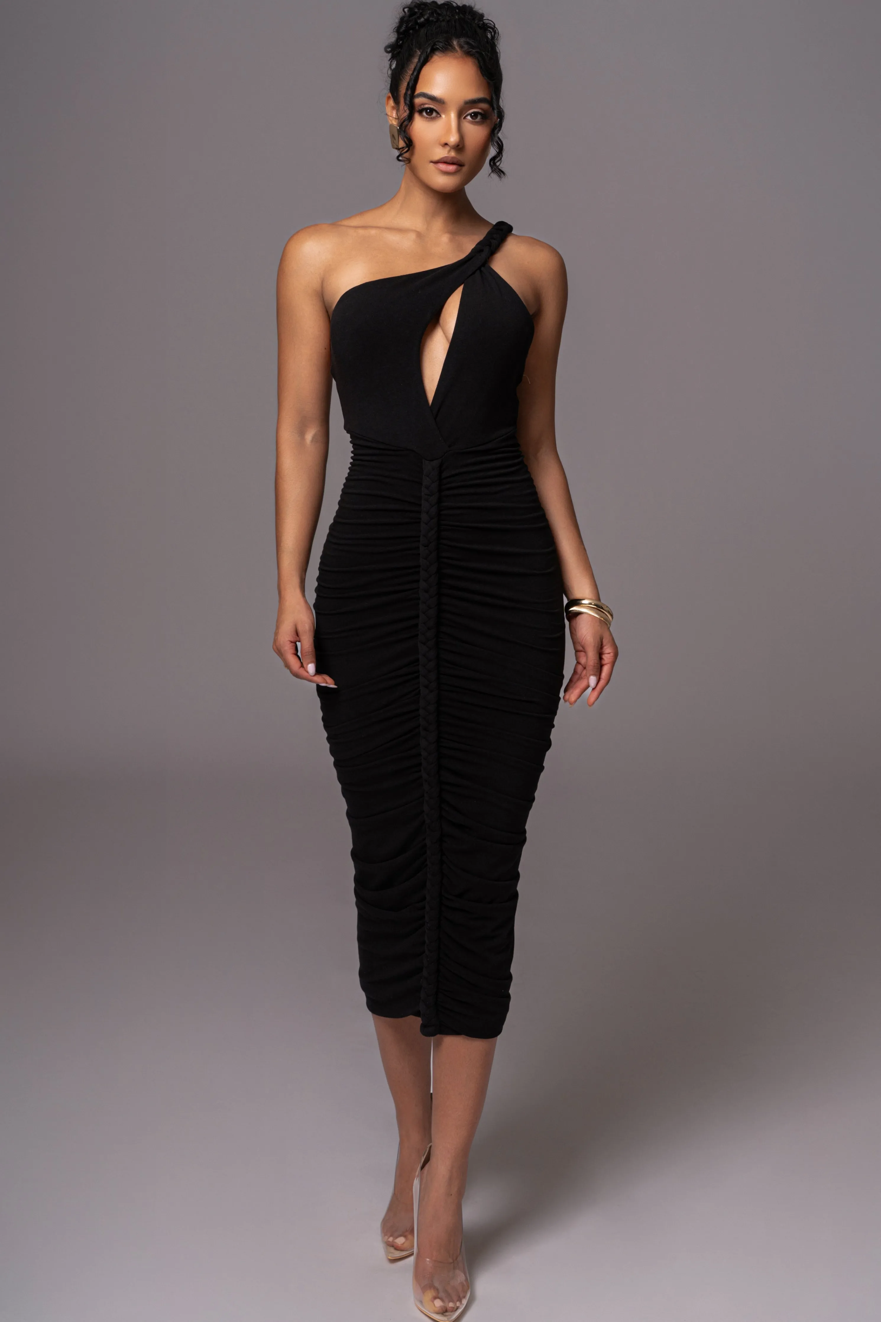Elevate your elegance with our Black Jess Ruched Midi Dress. Featuring a solid black shade, fitted silhouette, and one-shoulder design with a braided strap and cutout chest detail. Double-lined and stretchy for comfort.