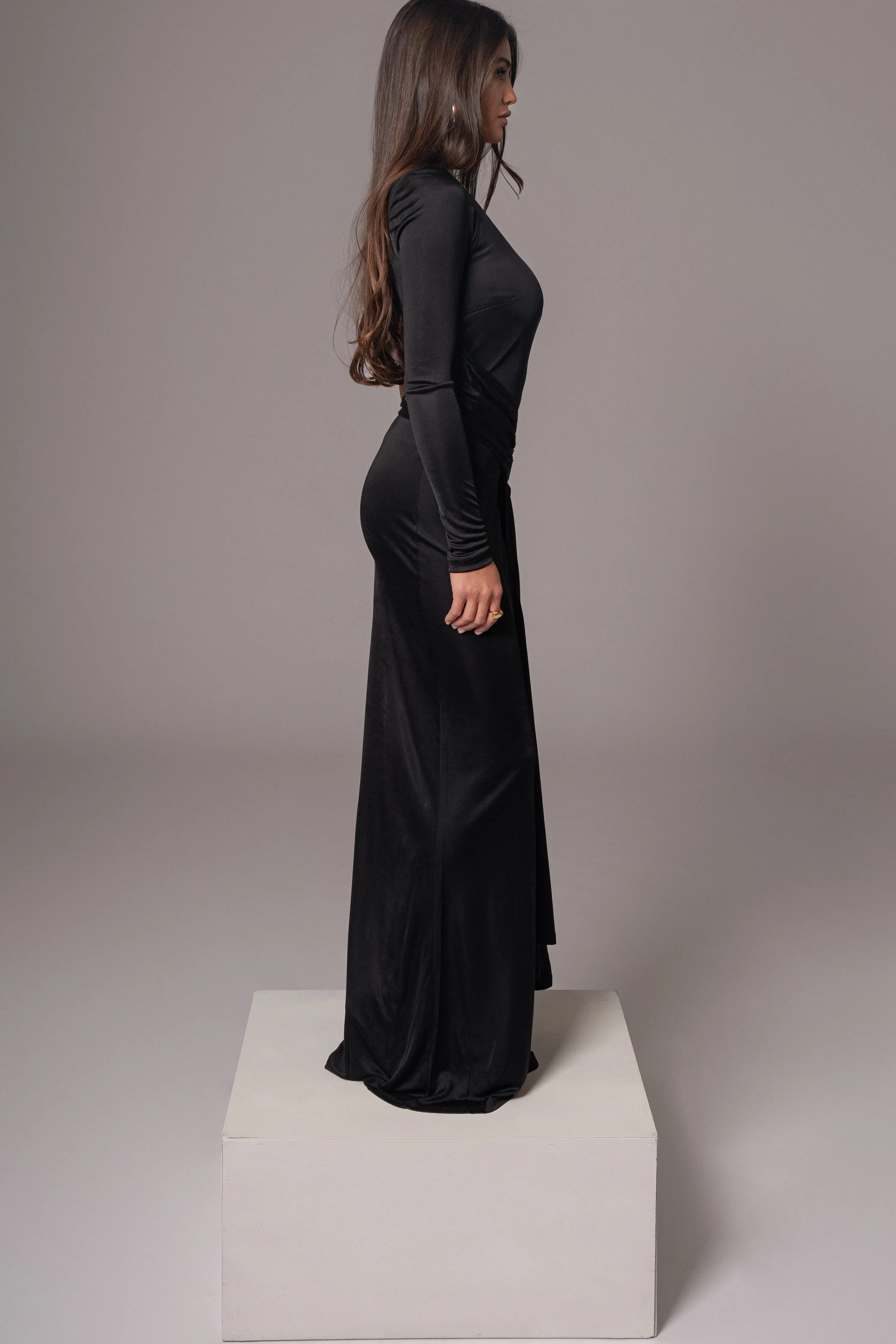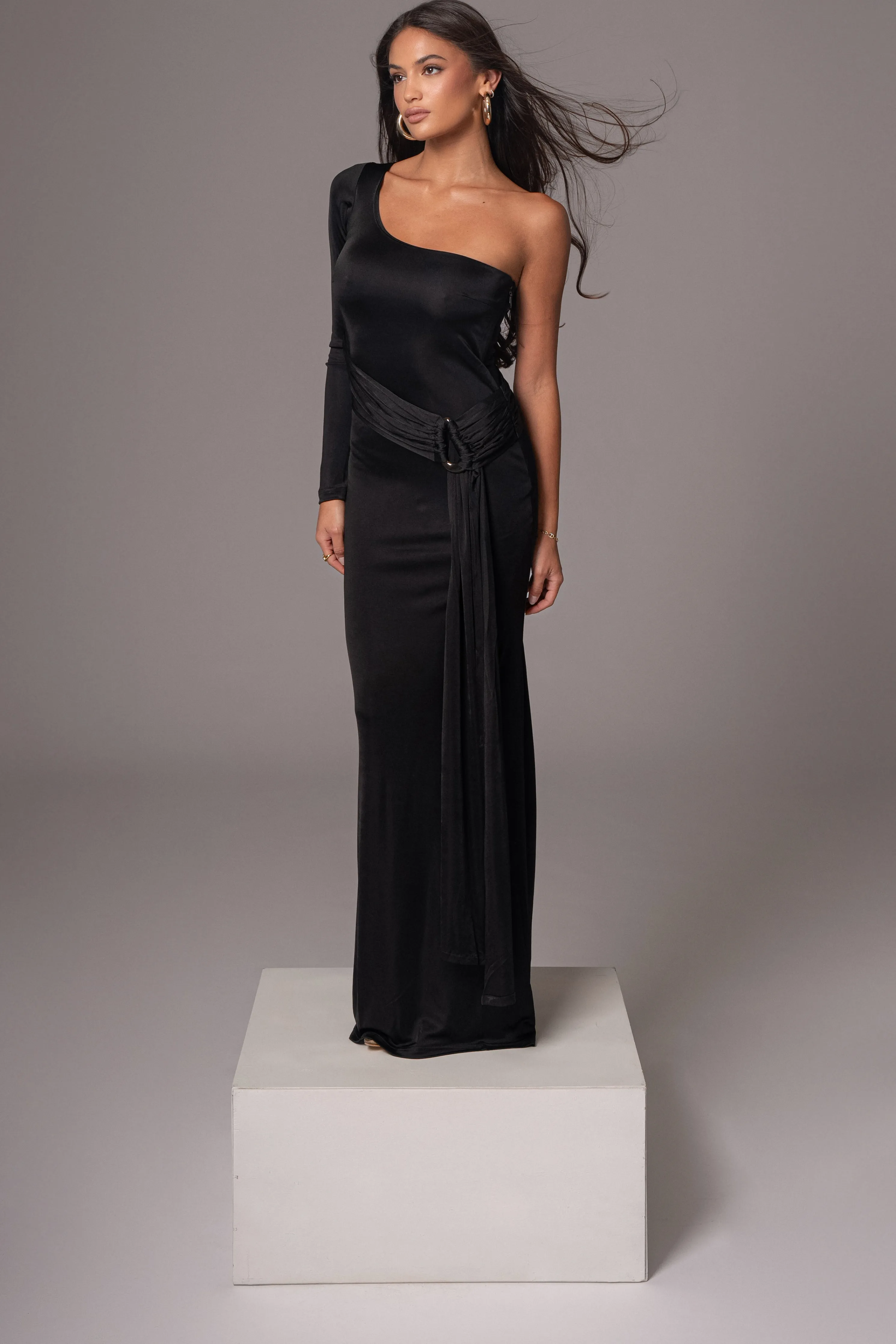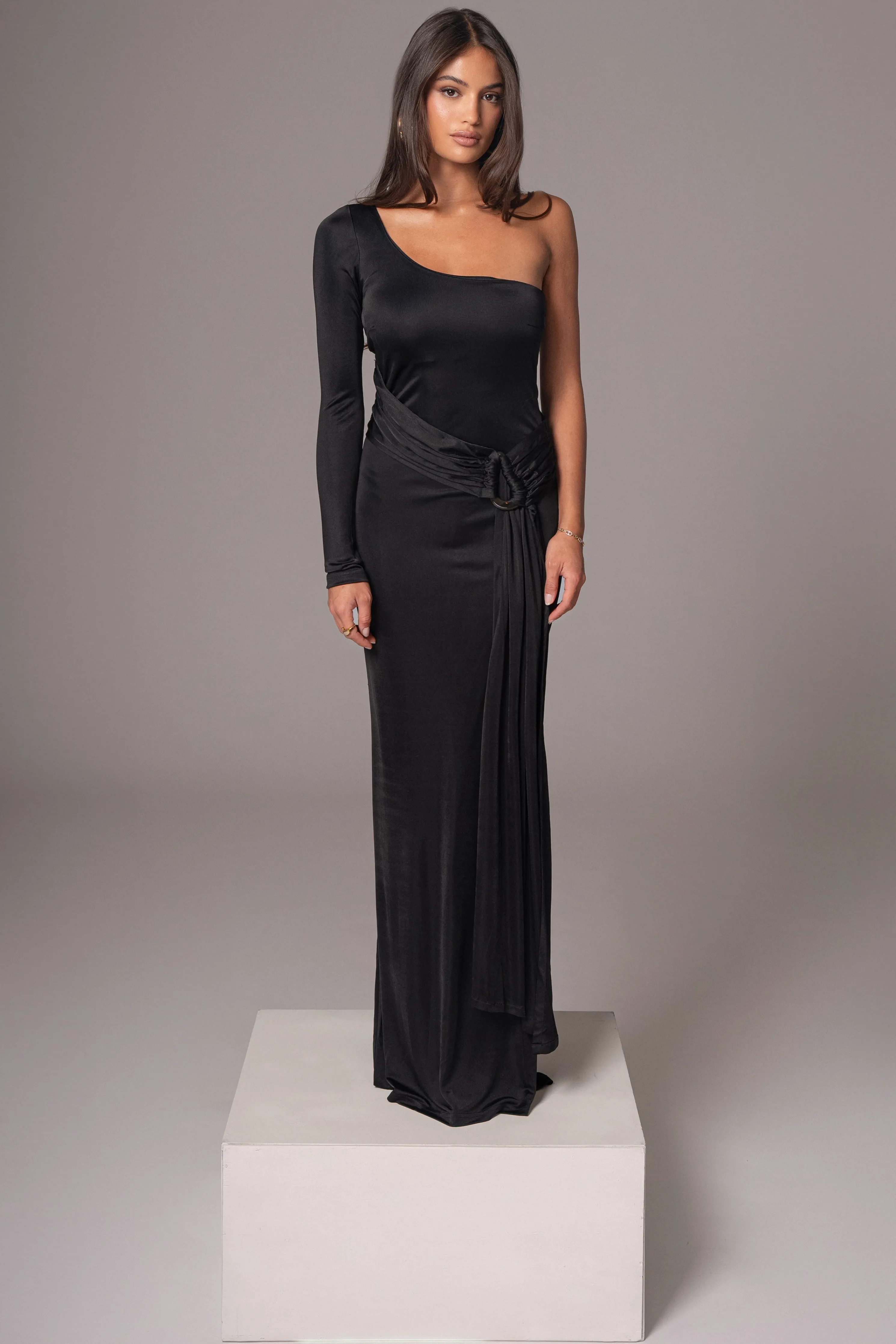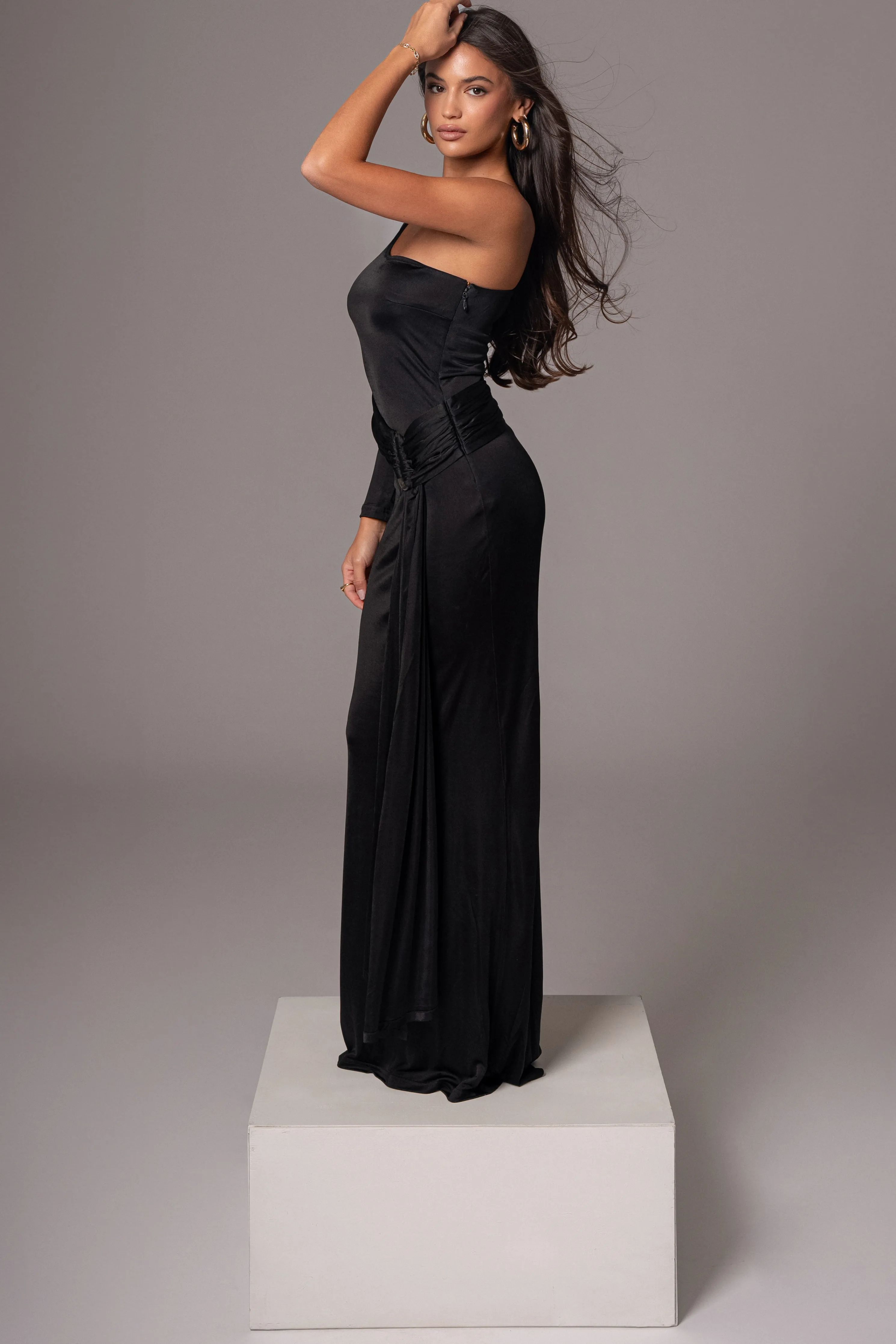 Our timeless original pieces reimagined for today in the JAIDE Collection. Step into elegance with our Black Muoi Maxi Dress, a signature favorite now reimagined with a modern twist. Featuring an elegant one shoulder neckline, shirring at the waist, a flared hem, and beautiful drape adorned with an acrylic accent. Crafted from a smooth fabric for comfort. Side zipper closure.