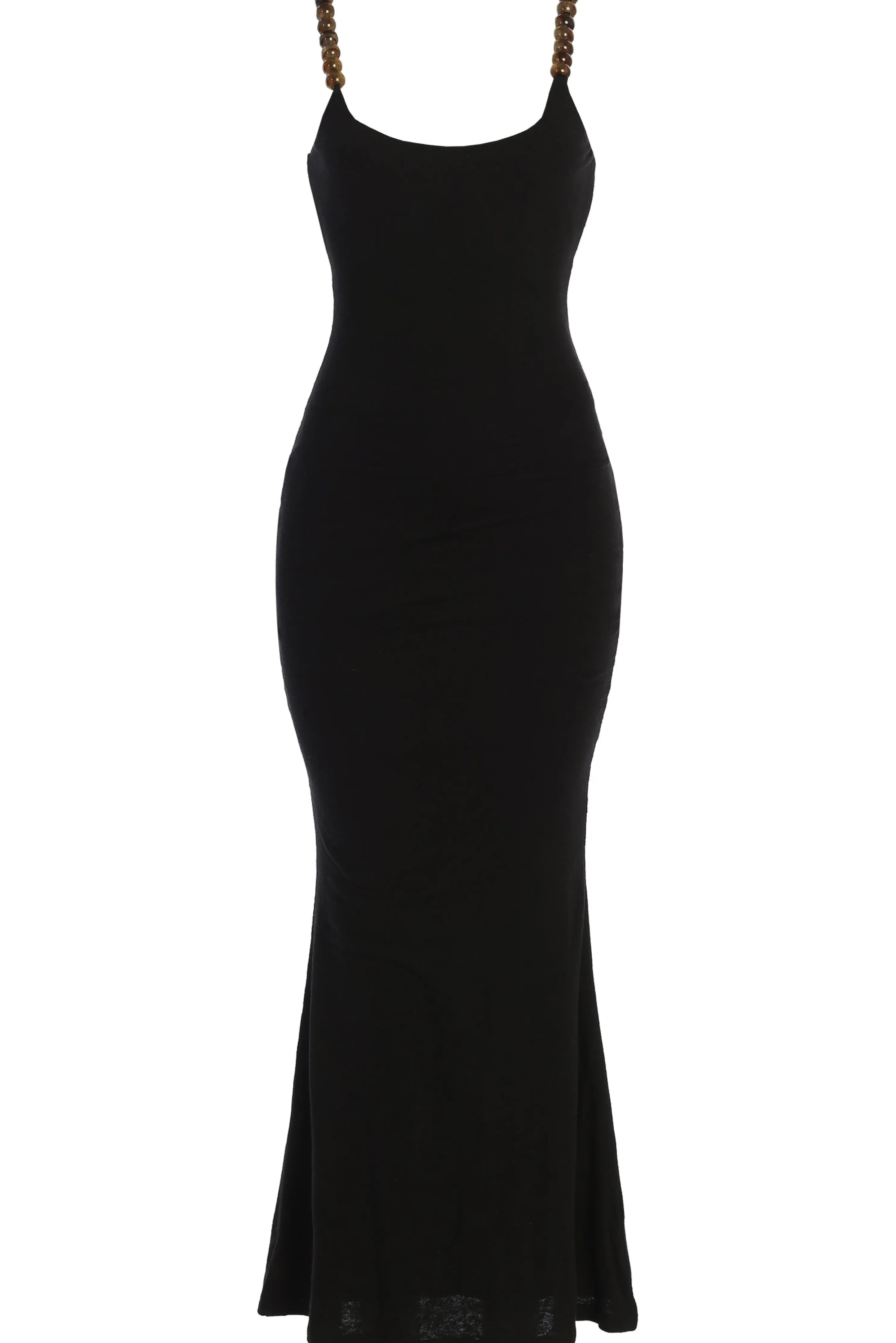 Sail away in style with our Black Nautical Escape Maxi Dress. This stunning maxi dress features a round neckline and twisted straps adorned with marble beads, giving it an elegant touch. Crafted from a lightweight fabric, this dress is perfect for a day at the beach or a night out on the town. Double lined. Stretchy.