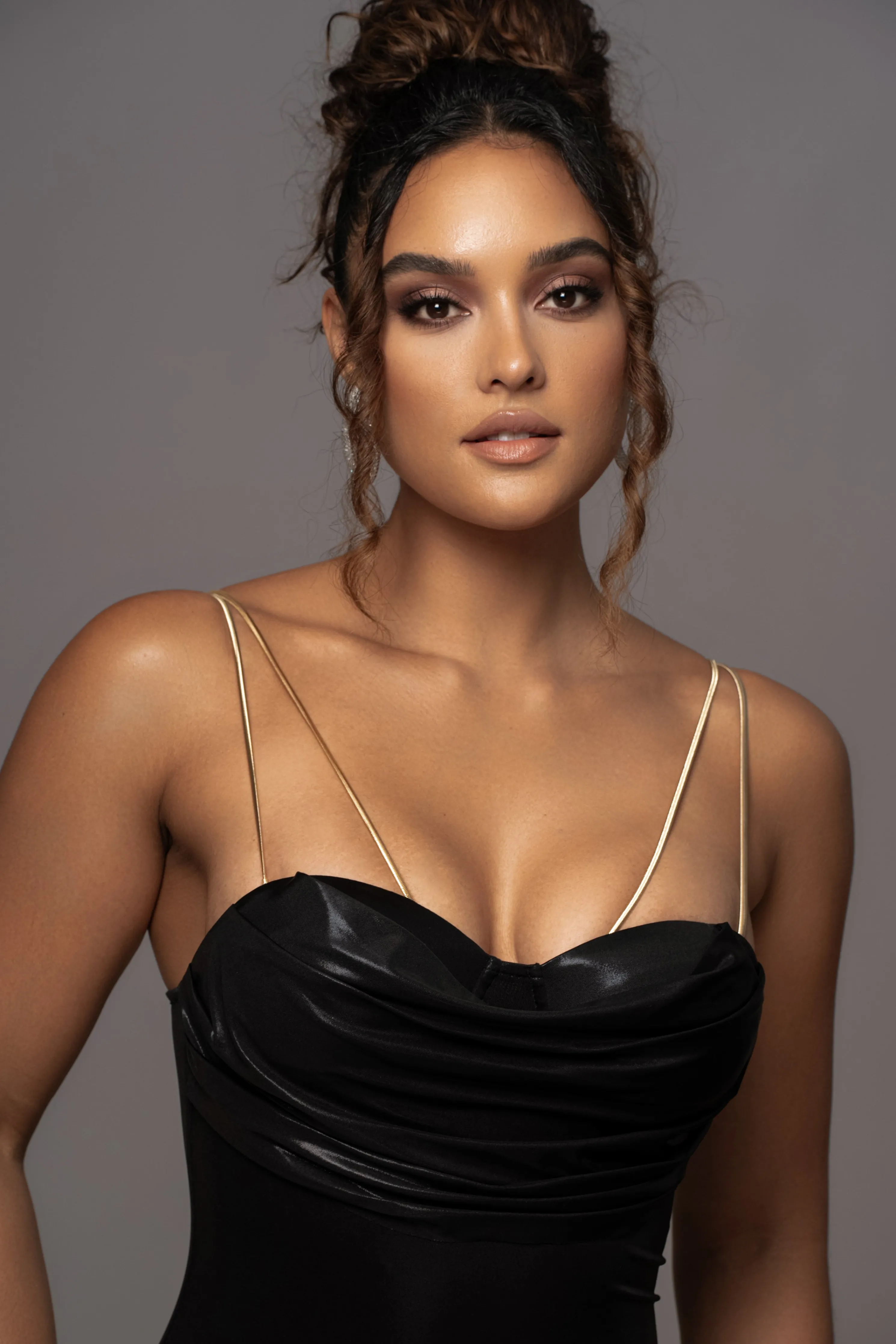 Our BlackVisions Of You Midi Dress is a statement on its own. This form-fitting midi design is crafted in a rich metallic fabrication radiating shine from all angles! Featuring a sweetheart neckline with cowl detail, padded cup support, and elegant gold-metallic straps that can be removed for an optional strapless look. Complete with grip silicone gel at the bust for a secure hold. Back zipper for closure with split hem. Stretchy.
