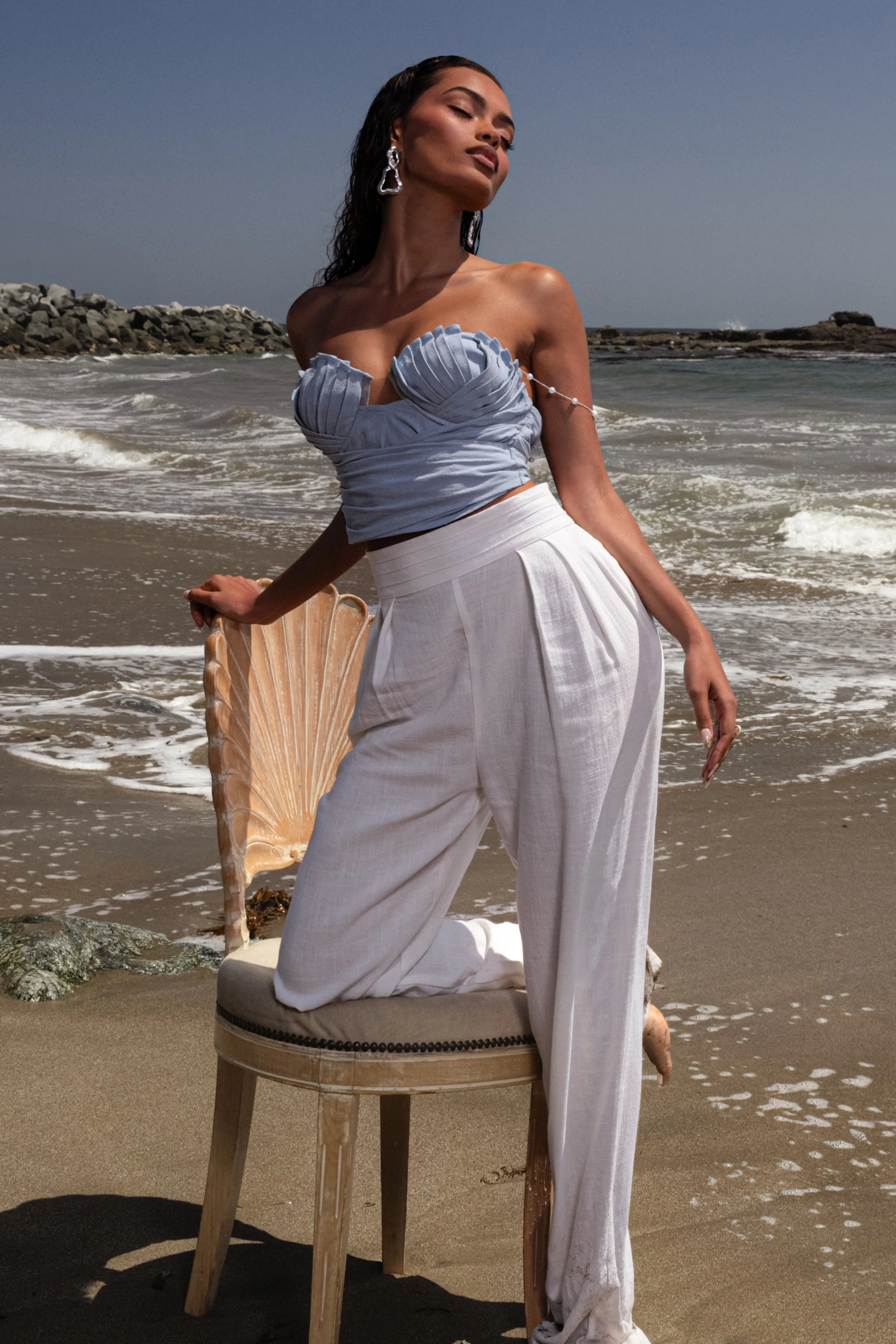 Channel your inner mermaid all summer long with our Blue Arielle Bustier Top. Made from a breathable linen blend, this unique top features delicate pearl chain straps that drape off the shoulders with seashell-inspired pleating at the bust, insert netting, an elastic back band, and self-tying back straps. Complete with padded cups, boning for structure, and two styles of removable shoulder straps for more than one styling option. Pair with our Villa Views LinenTrousers for the full look. No stretch. Single lined.