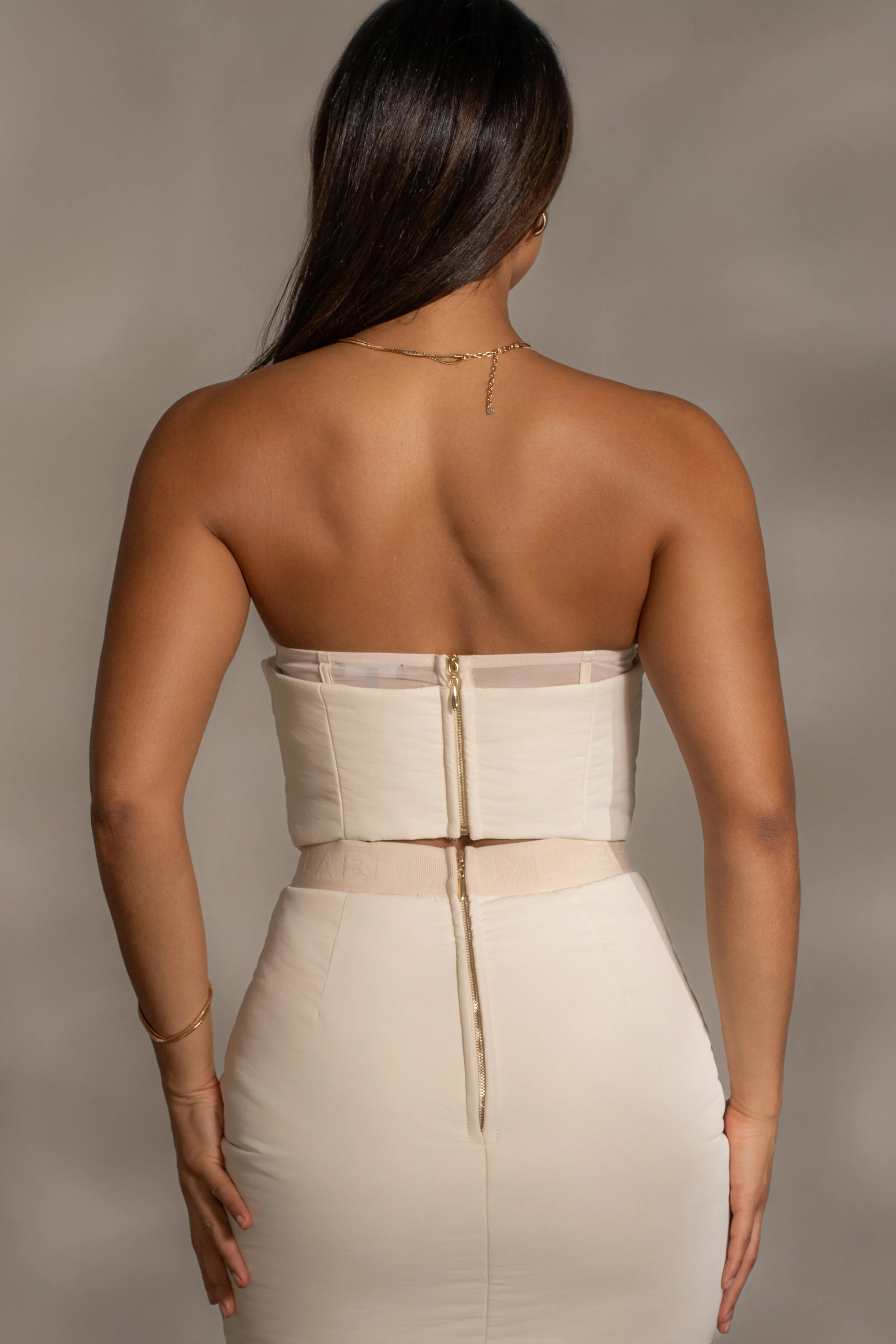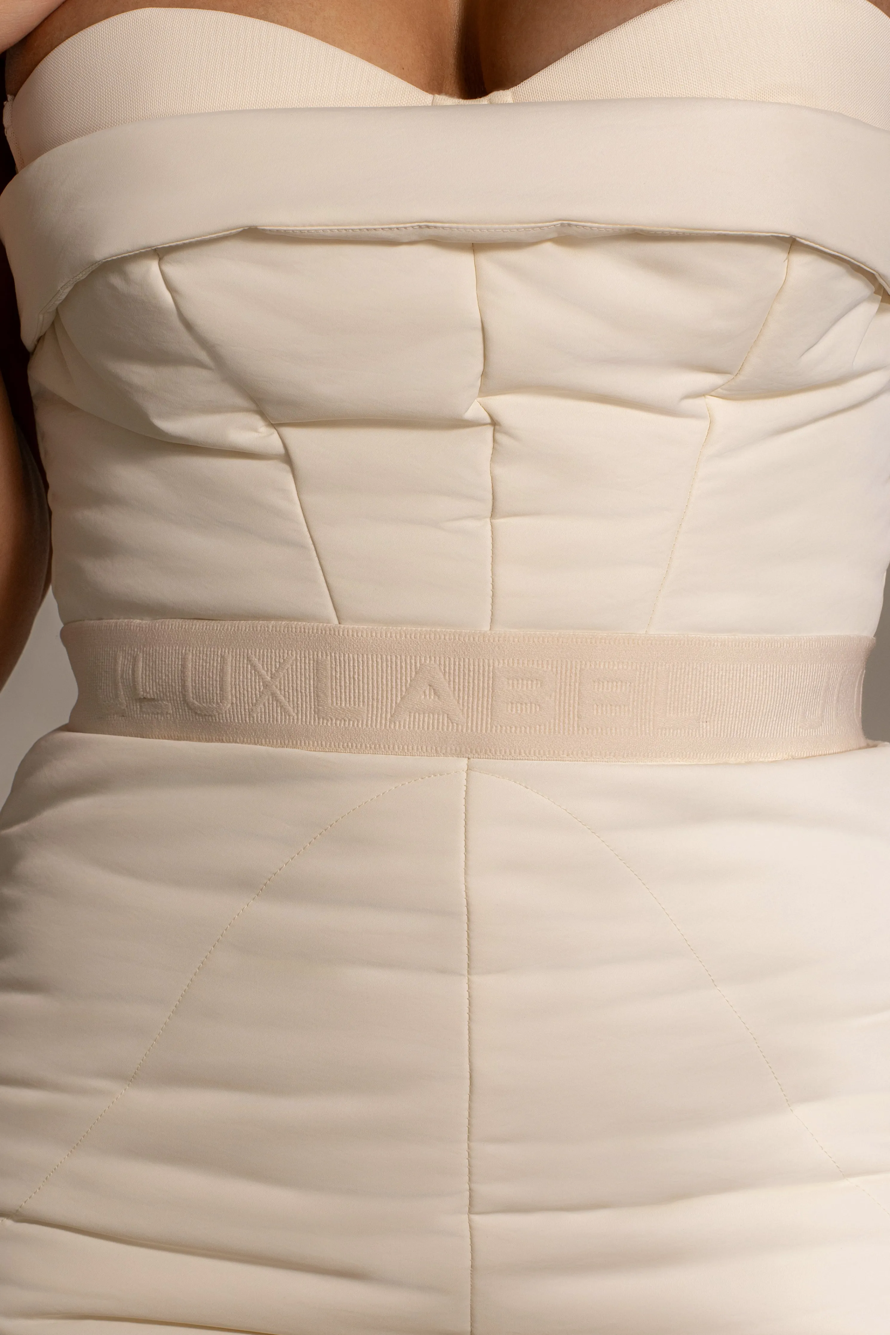 Our Buttercream Addyson Skirt Set is a cold weather must have. This all-weather puffer ensemble features a corset-inspired top with wired/padded cups and boning for structure. The matching skirt showcases a high waist and an elastic waistband adorned with our Jluxlabel logo. Made from insulated puffer fabric, this skirt set guarantees warmth with its quilted layers, providing comfort in any weather. Water resistant. Sold as a set.