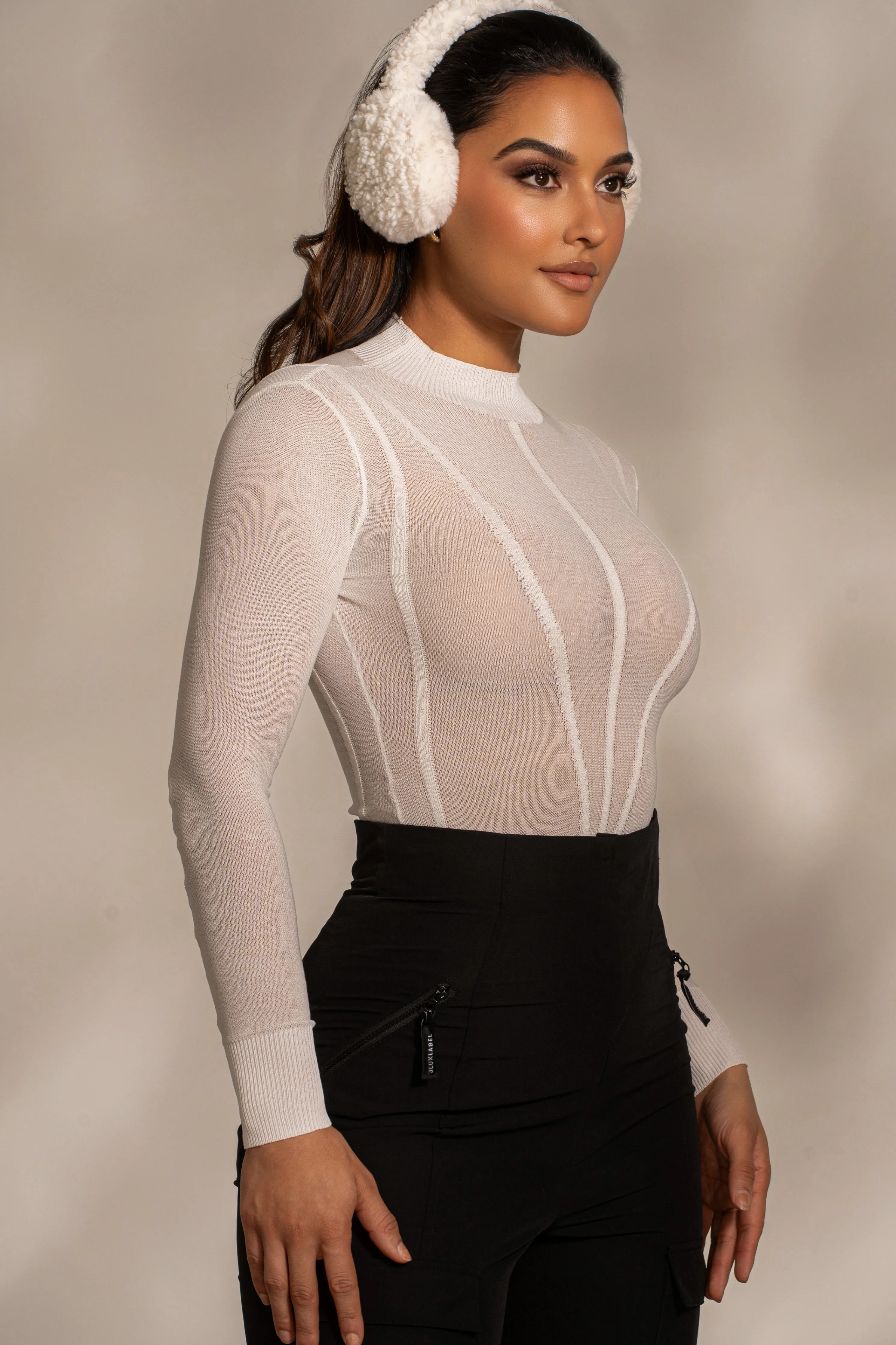 Introducing our Buttercream Lori Sheer Knit Bodysuit. This slightly transparent bodysuit highlights a sheer knit design with long sleeves and a high neckline, delivering a sophisticated look. Unique style lines add an extra touch of flair. Designed with a thong back and double snap closure. Pair with our Nyah Nylon Utility Pants for the full look. Single lined.