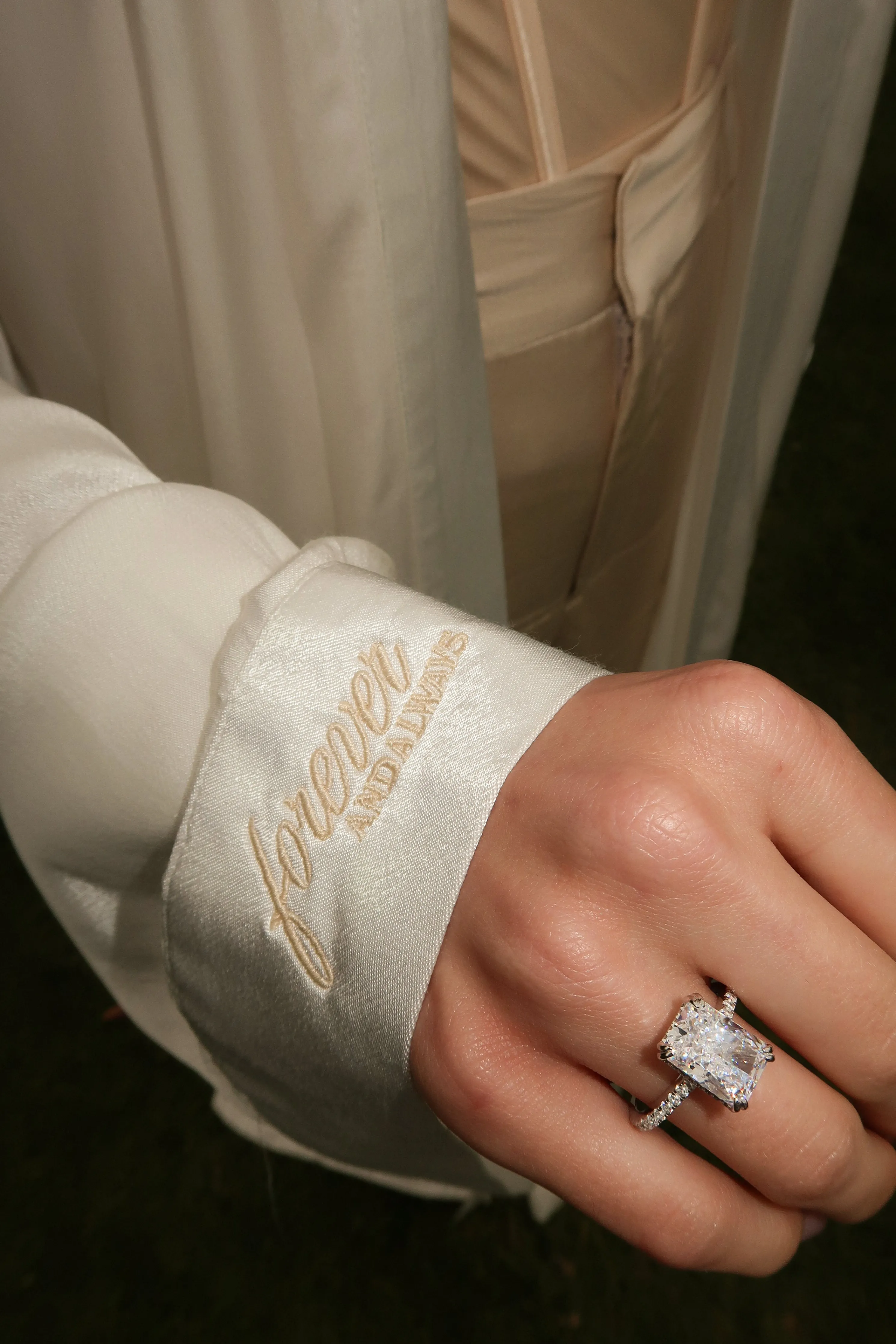 Designed for the JLUXLABEL Bridal Collection. Feel like you’re dreaming with the Champagne Forever And Always Satin Robe, now offering custom embroidery for an unforgettable personal touch. Prepare for your big day in style with this sleek satin robe, featuring a collarless neckline, drop shoulders, and relaxed three-quarter sleeves. Complete with an open-front design, welt pockets, belt loops, and a matching sash tie. Pair with our Amour Satin Top and Ever After Satin Trousers for the full look. Single-lined with no stretch.
