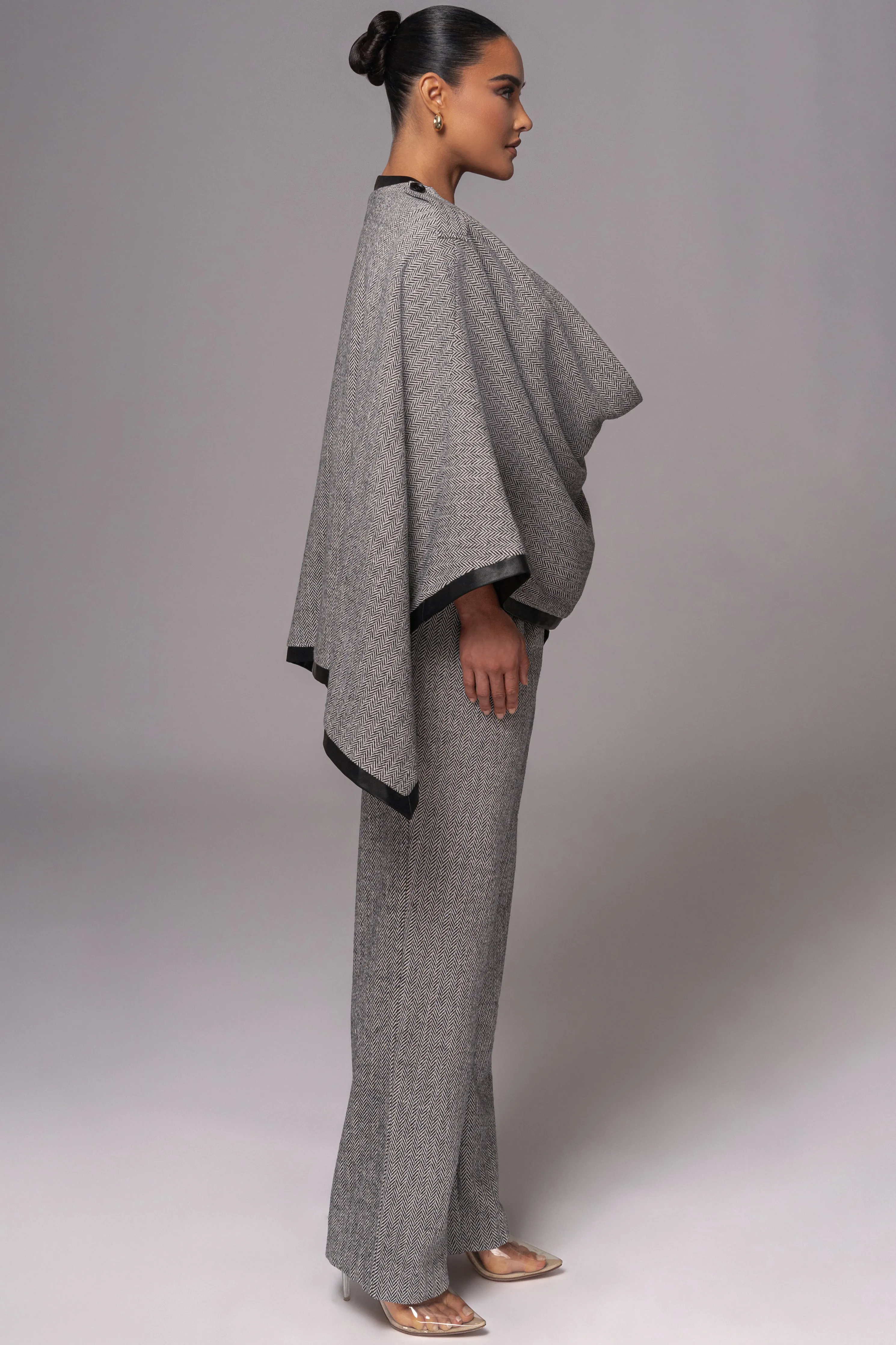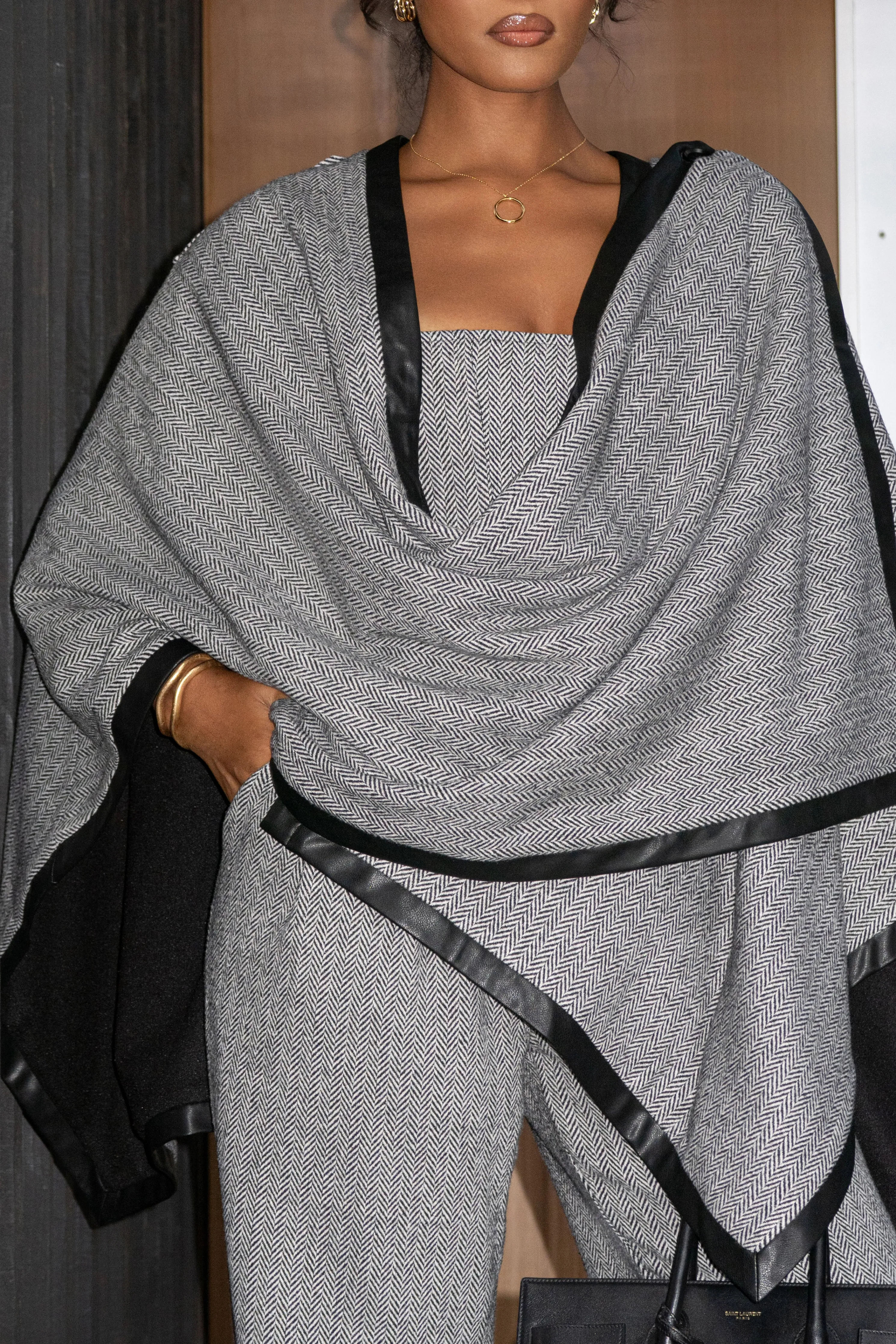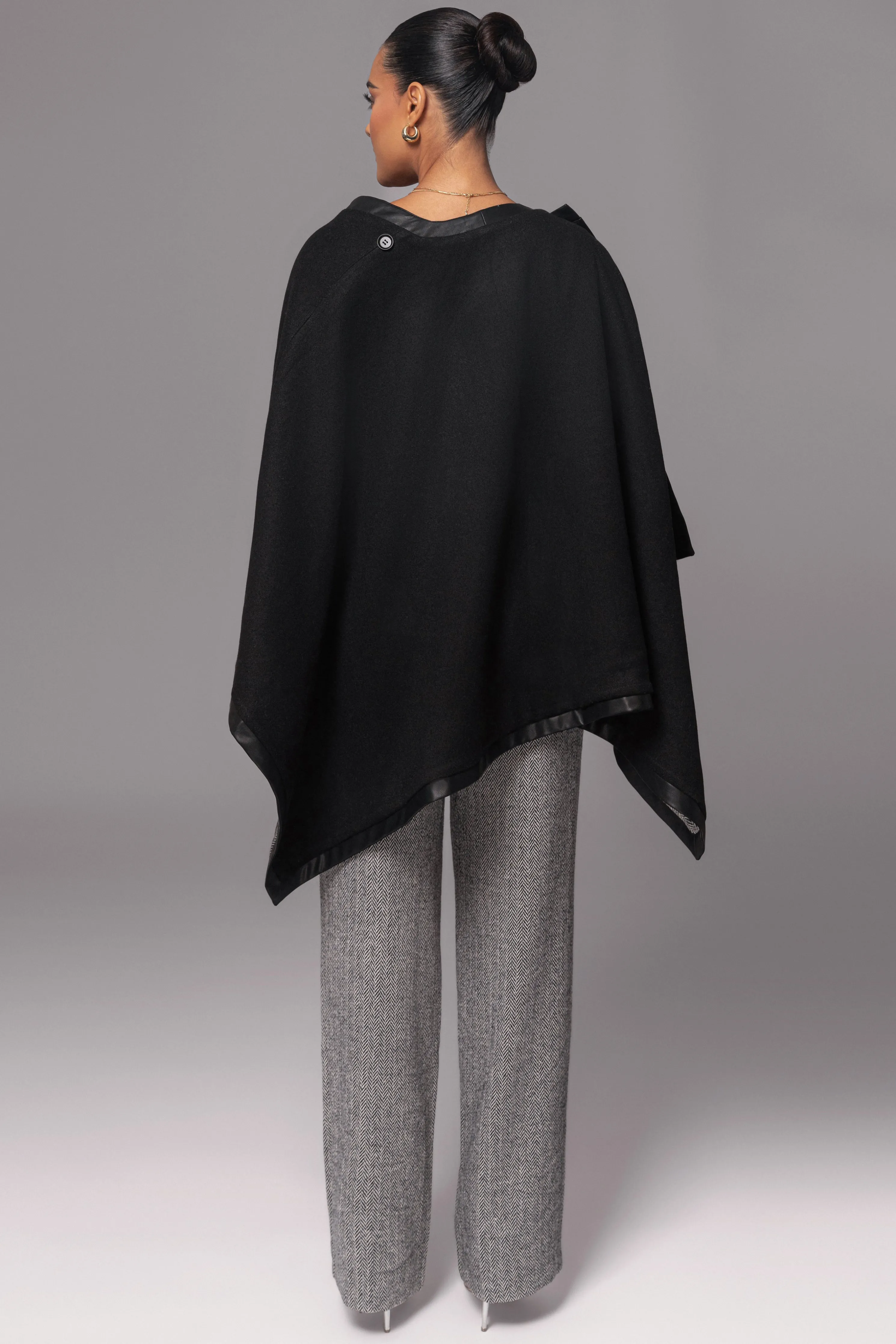 Designed to elevate your seasonal style, our Herringbone Reversible Shawl offers versatile styling options with its reversible design. Crafted in a luxurious herringbone material, this shawl blends classic texture with a modern touch. A faux leather contrast trim and shoulder tab buttons add refined detail, while offers versatile styling options. Double-lined. No stretch.