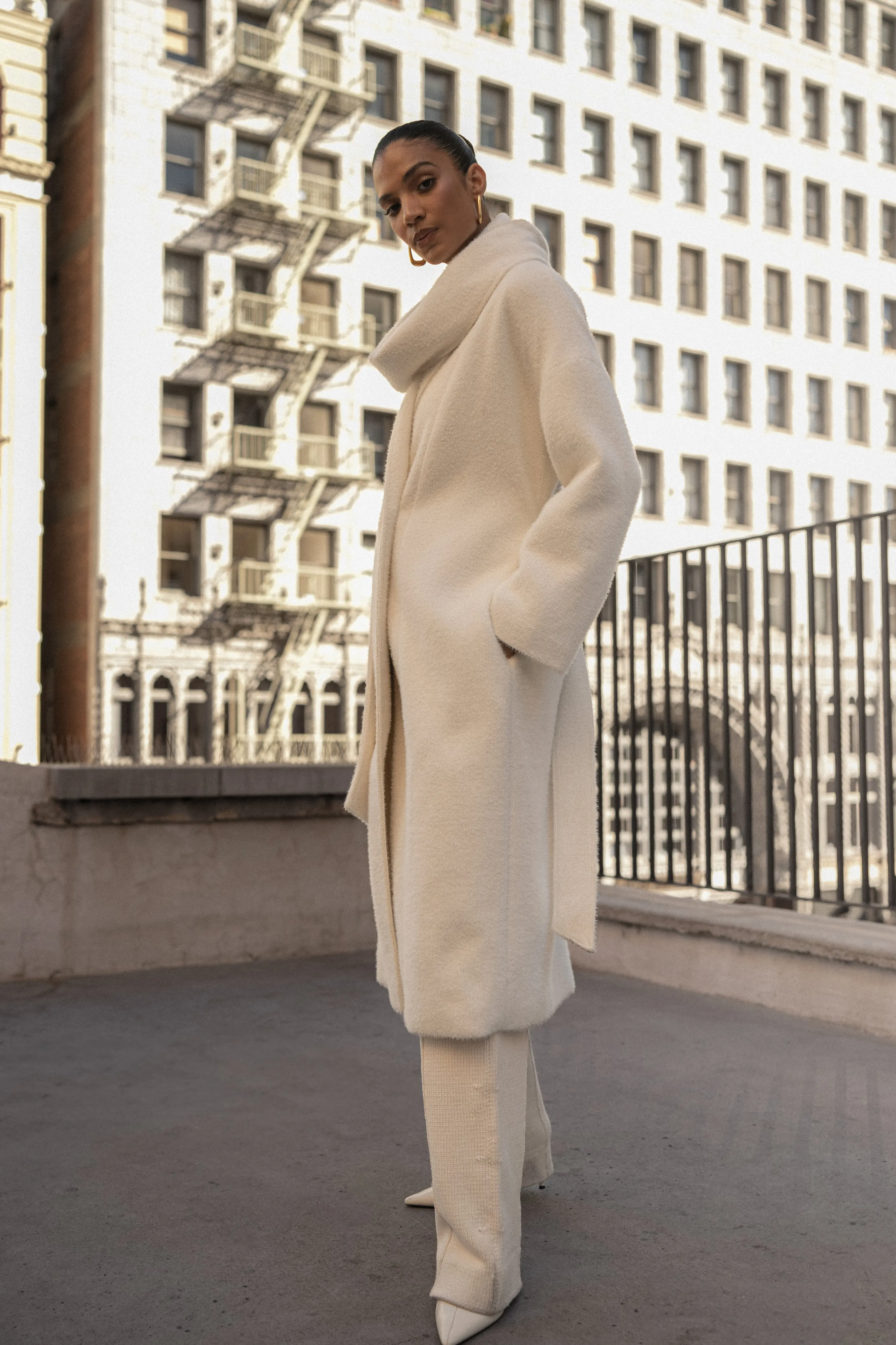Make a statement while staying warm with ourIvory Jonah Coat! Crafted from soft fabric, this winter essential ensures coziness with long sleeves and a removable scarf that wraps effortlessly around the neck achieving innovative style. A matching self tie belt holds it all together for a sophisticated finish. Back slit hem. Double lined. No stretch.