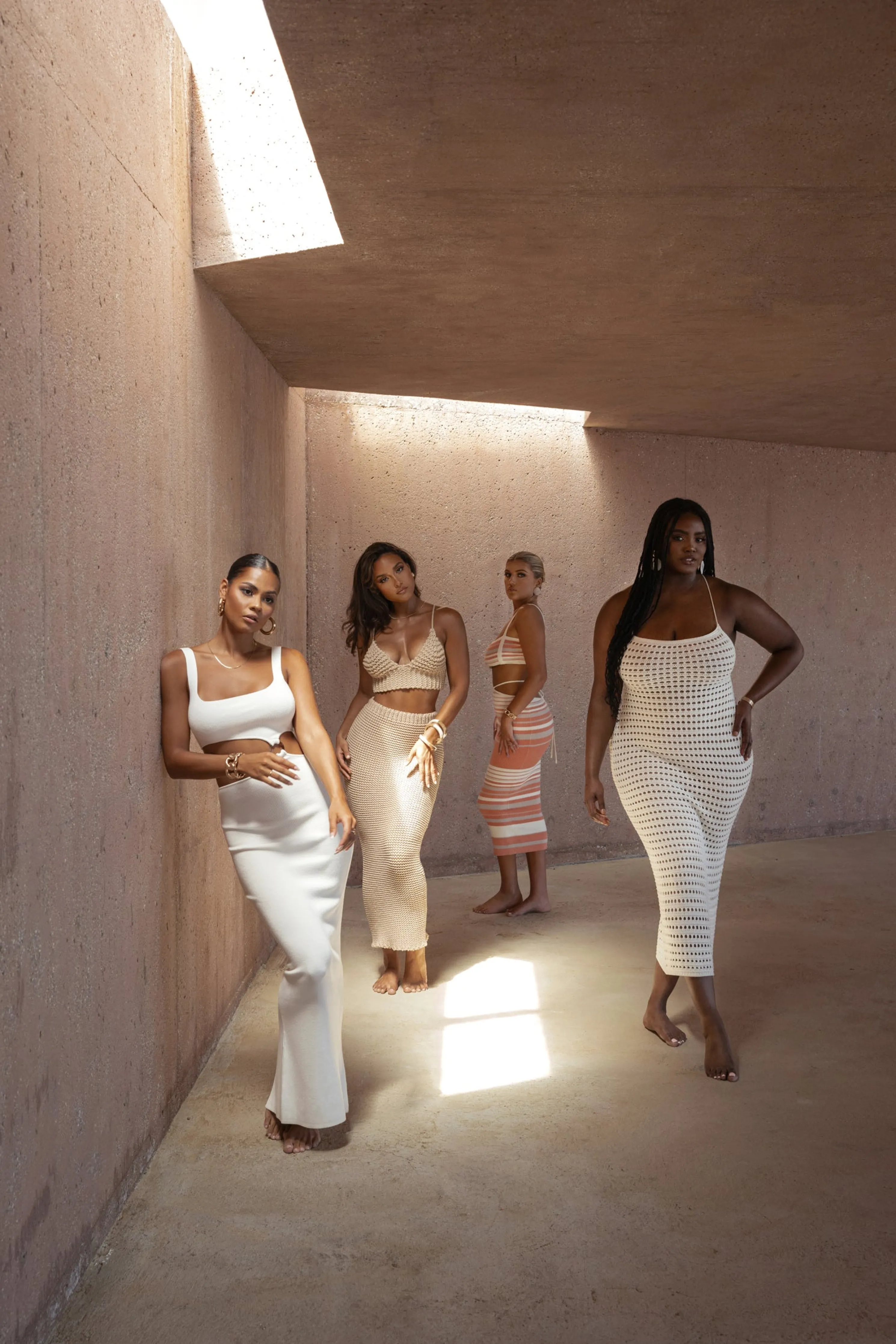 The Ivory Time After Time Dress is the definition of midsummer glamour! Showcasing a squared neckline with fixed shoulder straps, a trendy cut-out at the waist with tortoiseshell ring, and a center-back slit located at the lower hem. Designed in a ribbed knit fabric for a touch of texture. Stretchy.