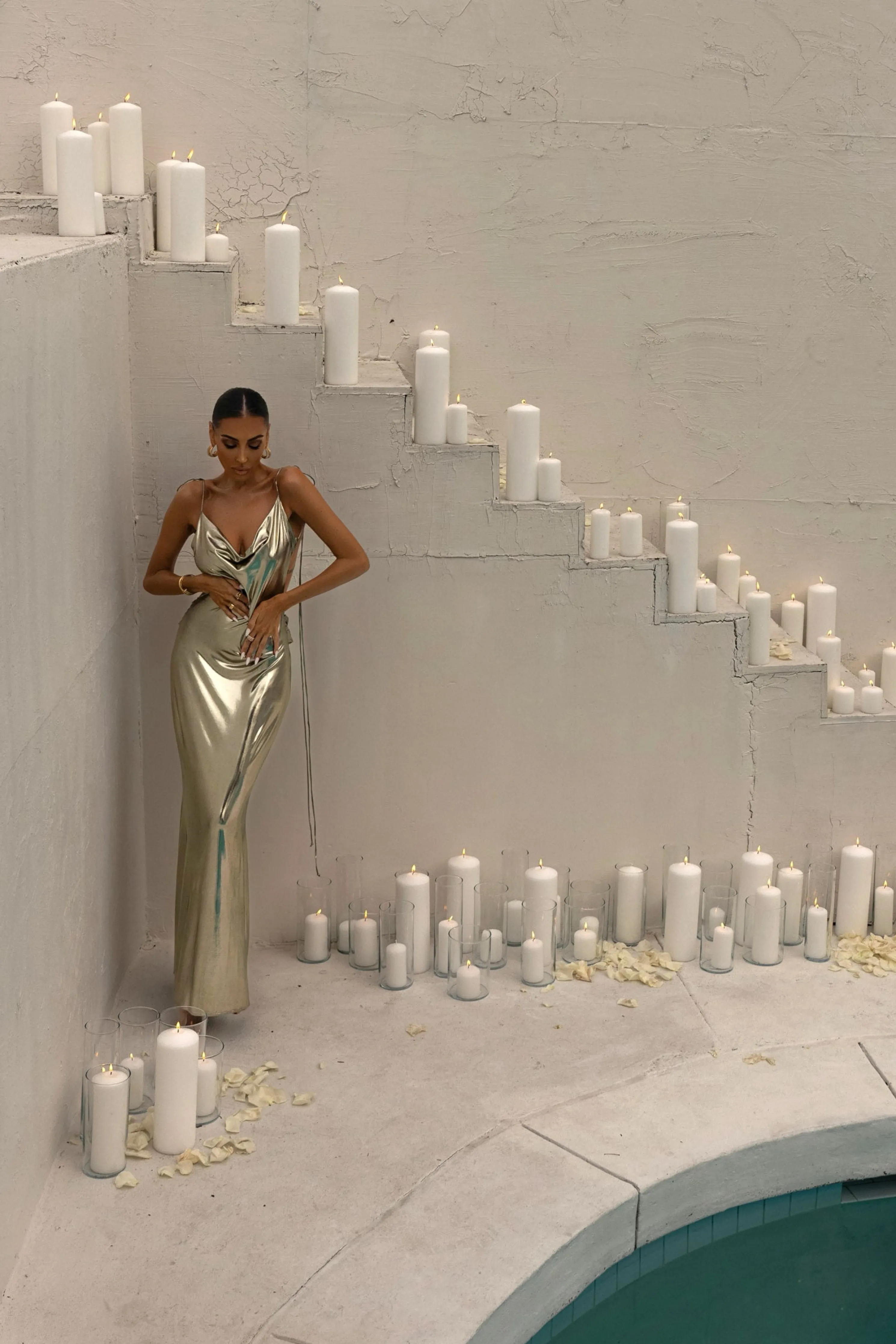 Our new Light Gold Heart of Gold Maxi Dress serves timeless glamour in a sleek maxi dress design crafted of luxurious metallic fabric. Showcasing a cowl neckline with adjustable bow-tie shoulder straps, a dreamy mermaid hem, and a low-draped cowl back for a touch of allure. Stretchy. Single lined.