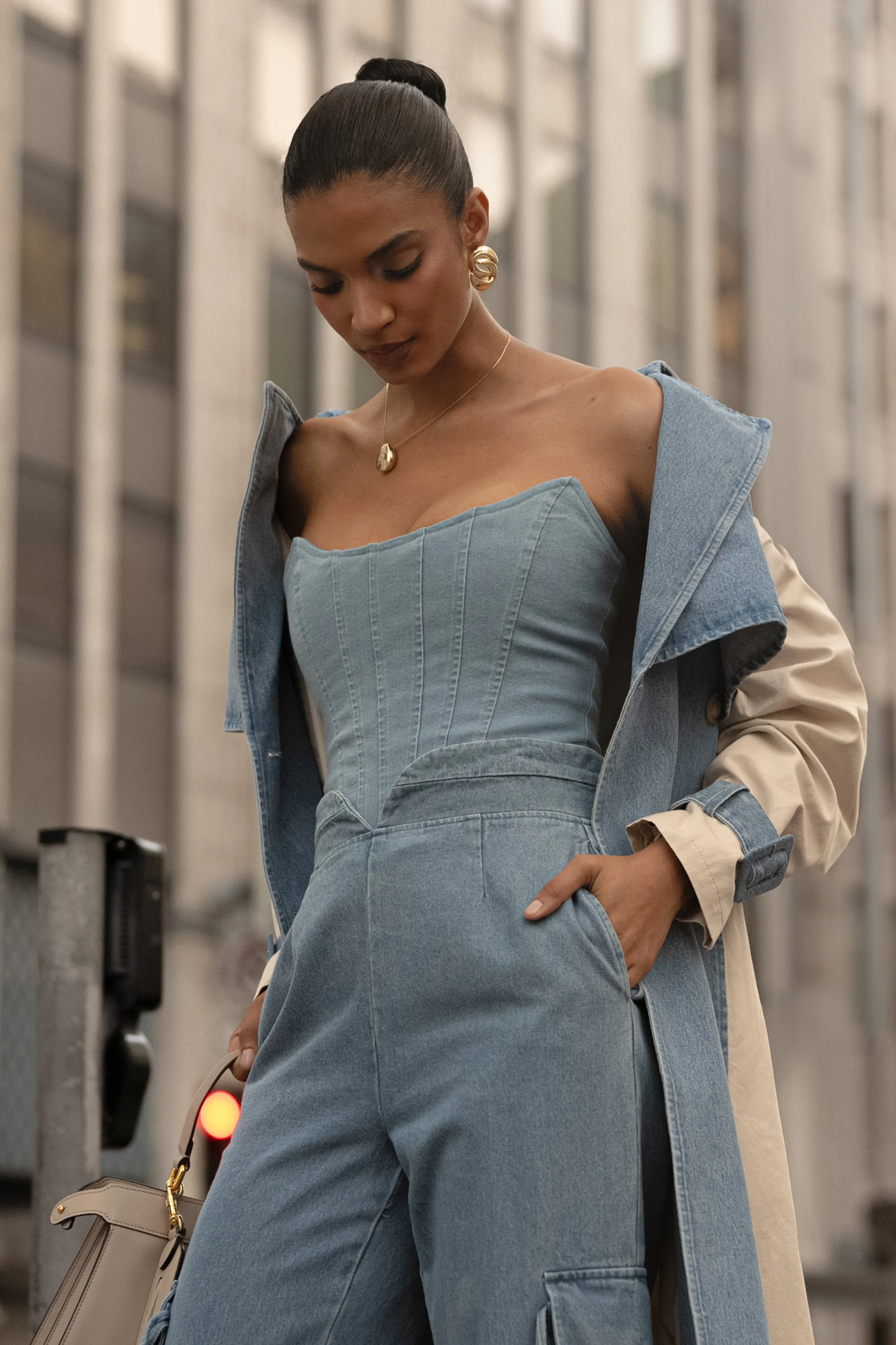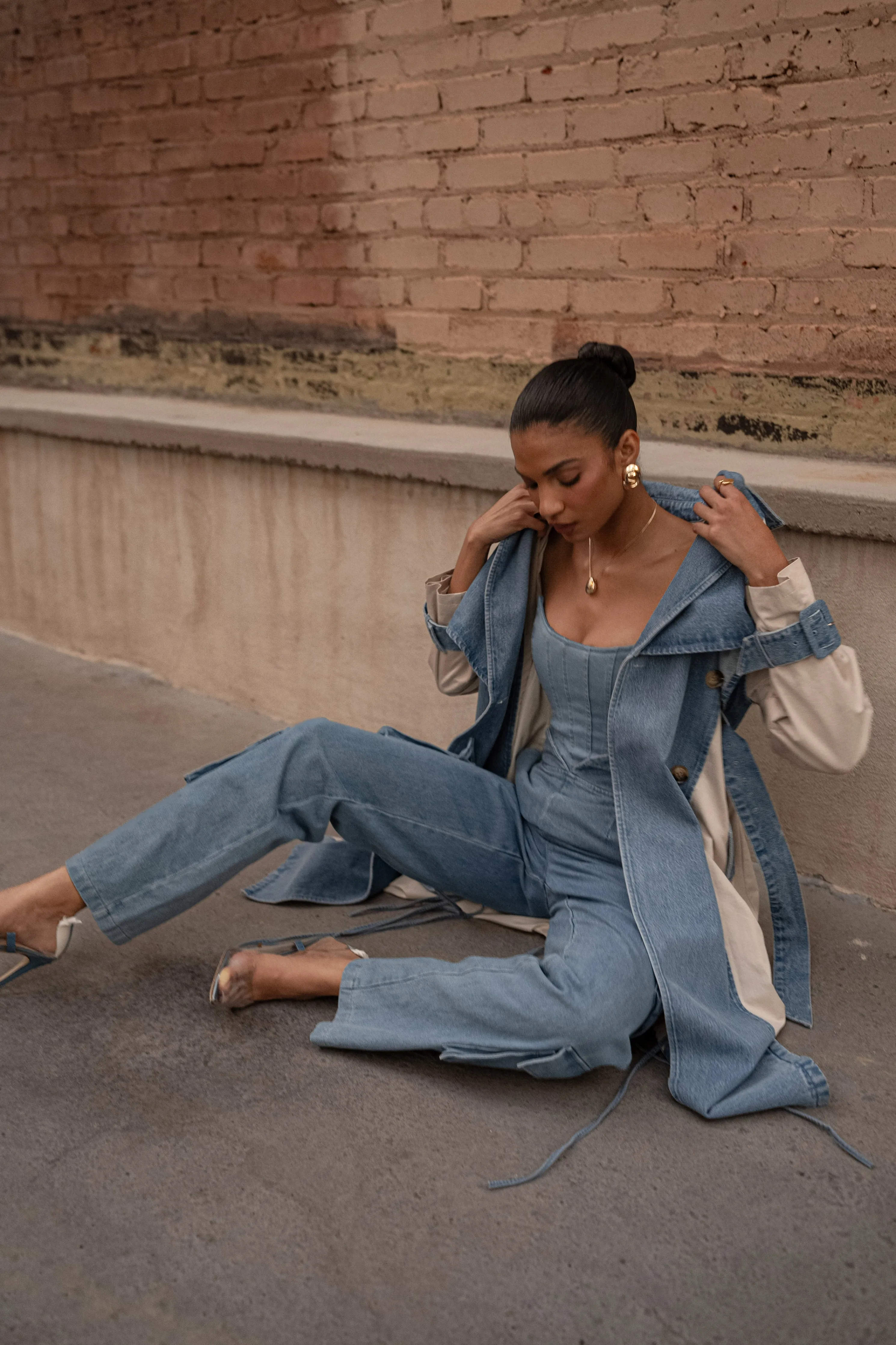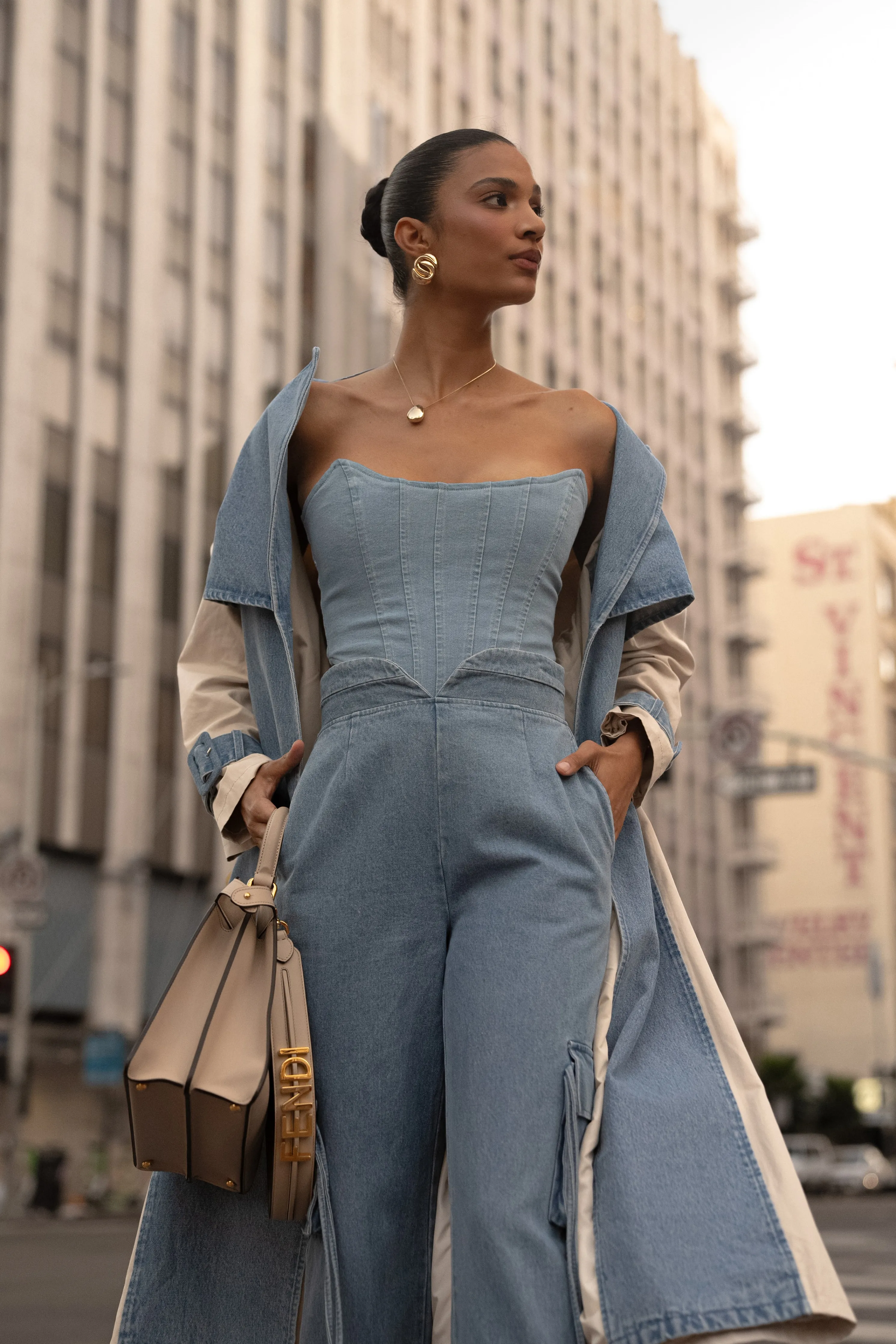 You’ll be the epitome of style with our Medium Wash Fenix Reversible Denim Corset. We’ve reimagined one of our most loved designs in premium denim, heightening its style with a modern twist. This corset showcases a strapless neckline with boning throughout the front and back for added structure and support. Crafted from a denim blend, this corset is designed with a reversible feature consisting of medium wash on one side and a lighter shade on the other. Pair with our Leighton Belted Contrast Coat and Jacinda Denim Utility Pants for the full look. Gold tone zipper closure. Stretchy. Double lined.