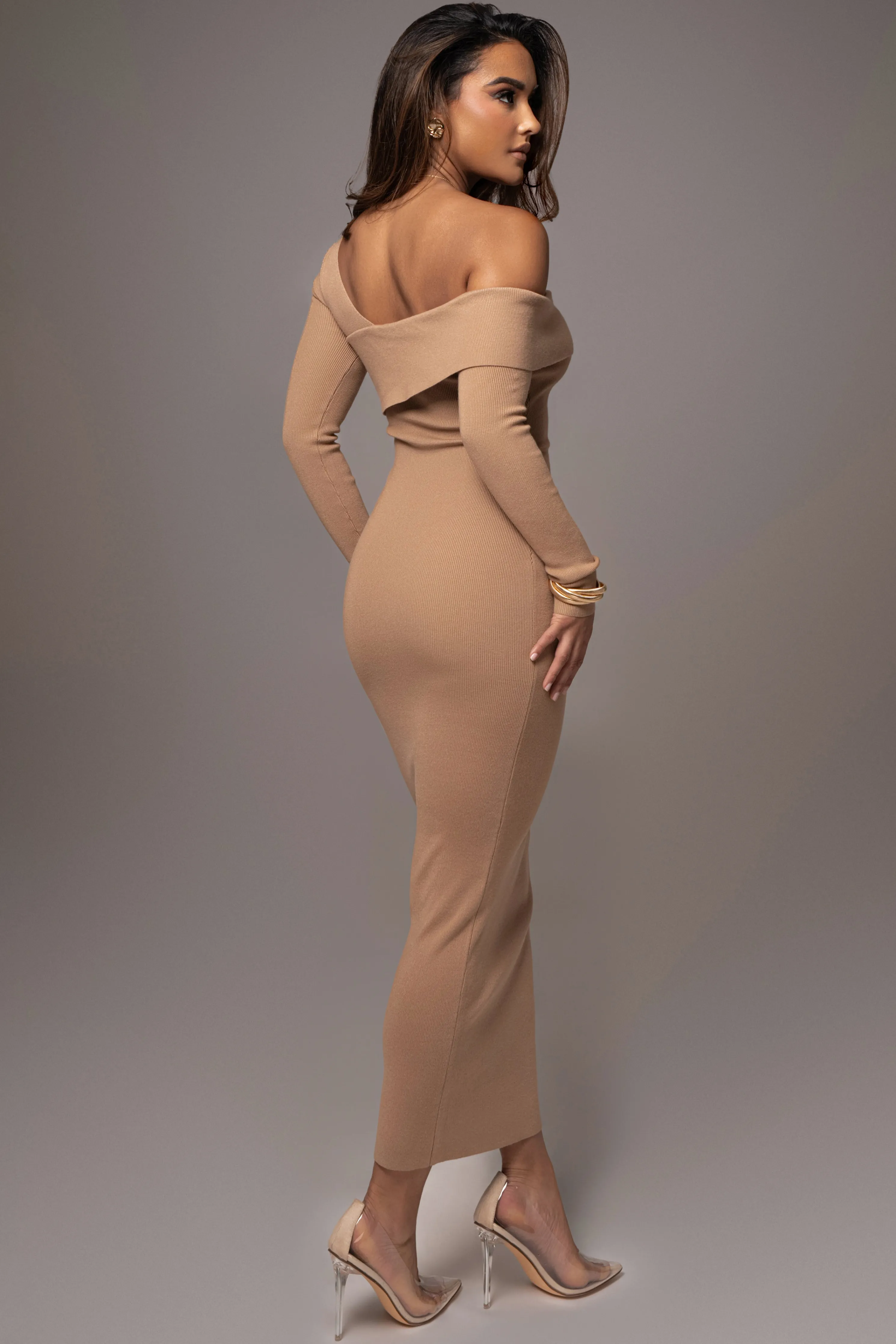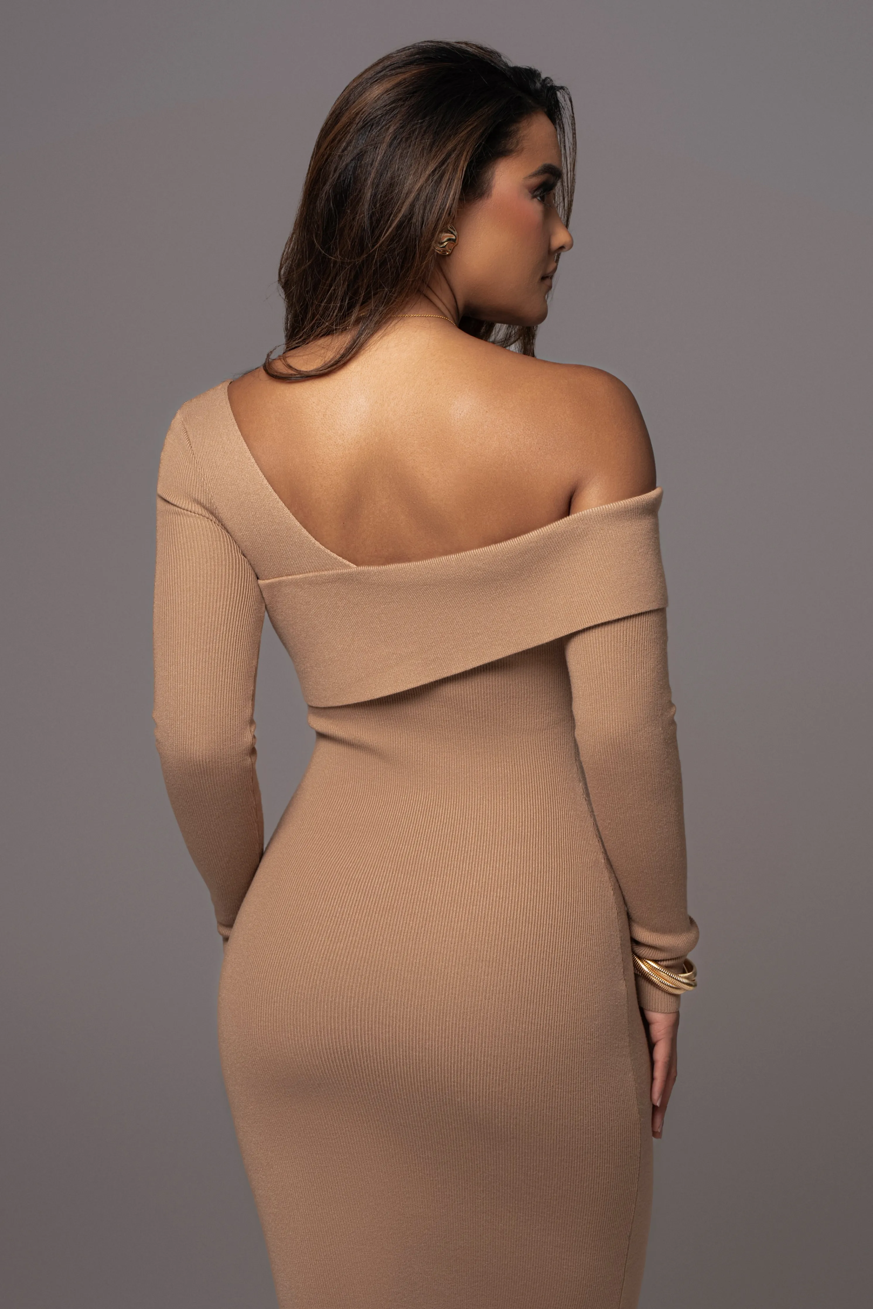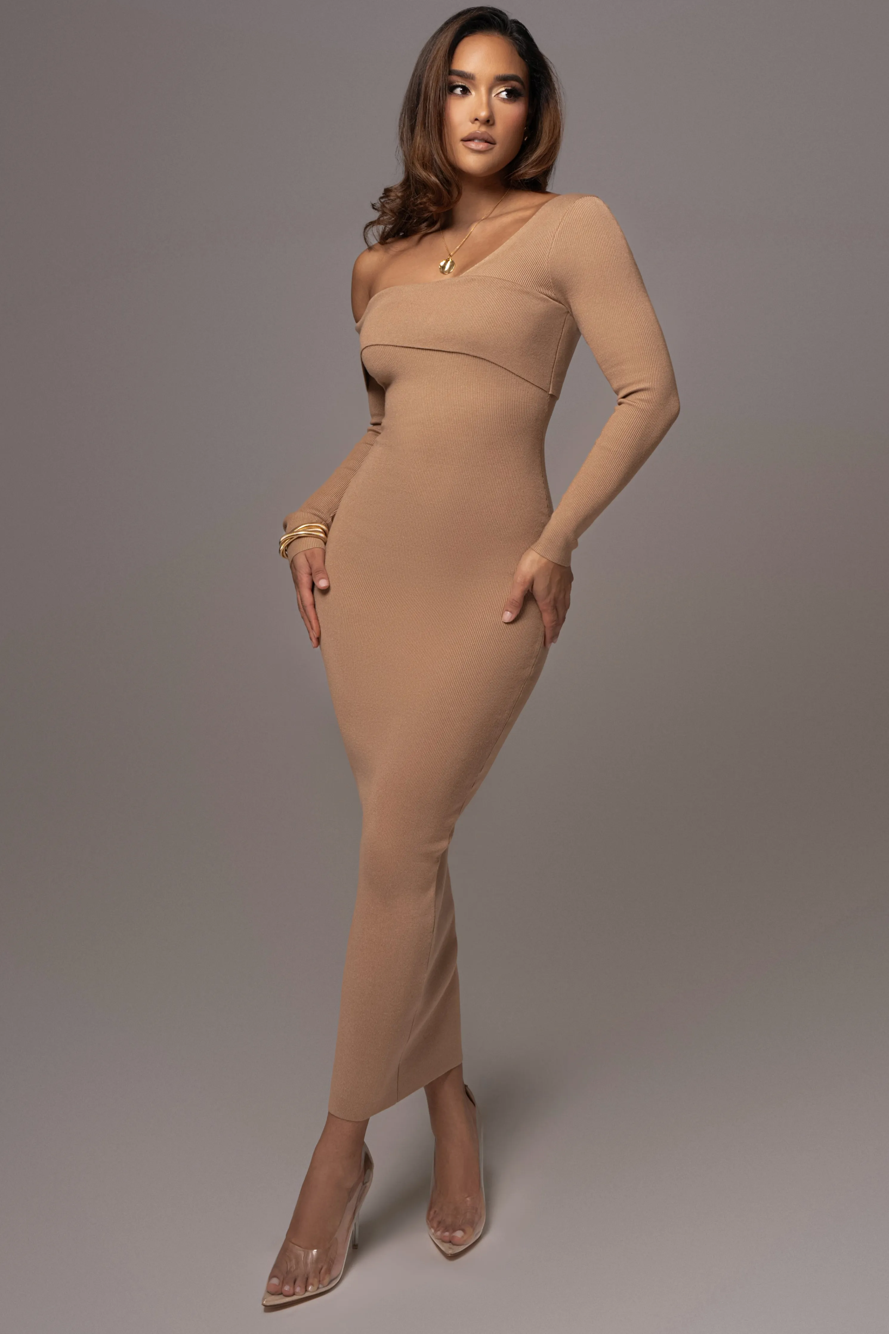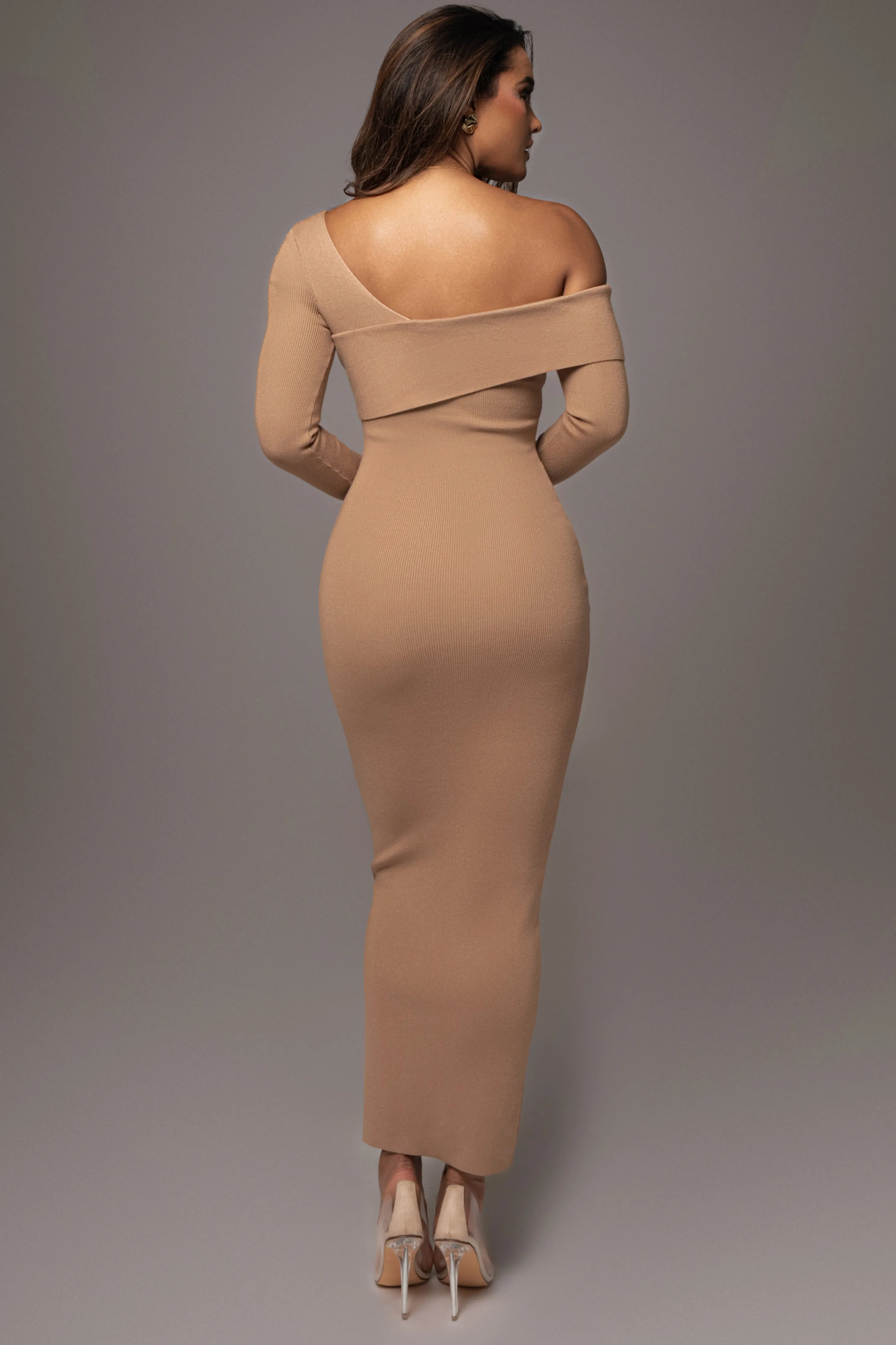 OurTan Harper Knit Maxi Dress is a must-have for your wardrobe this season. Featuring an asymmetrical design with fold over neckline, long sleeve arms, and a maxi hem providing a sophisticated silhouette. Single lined. Stretchy.