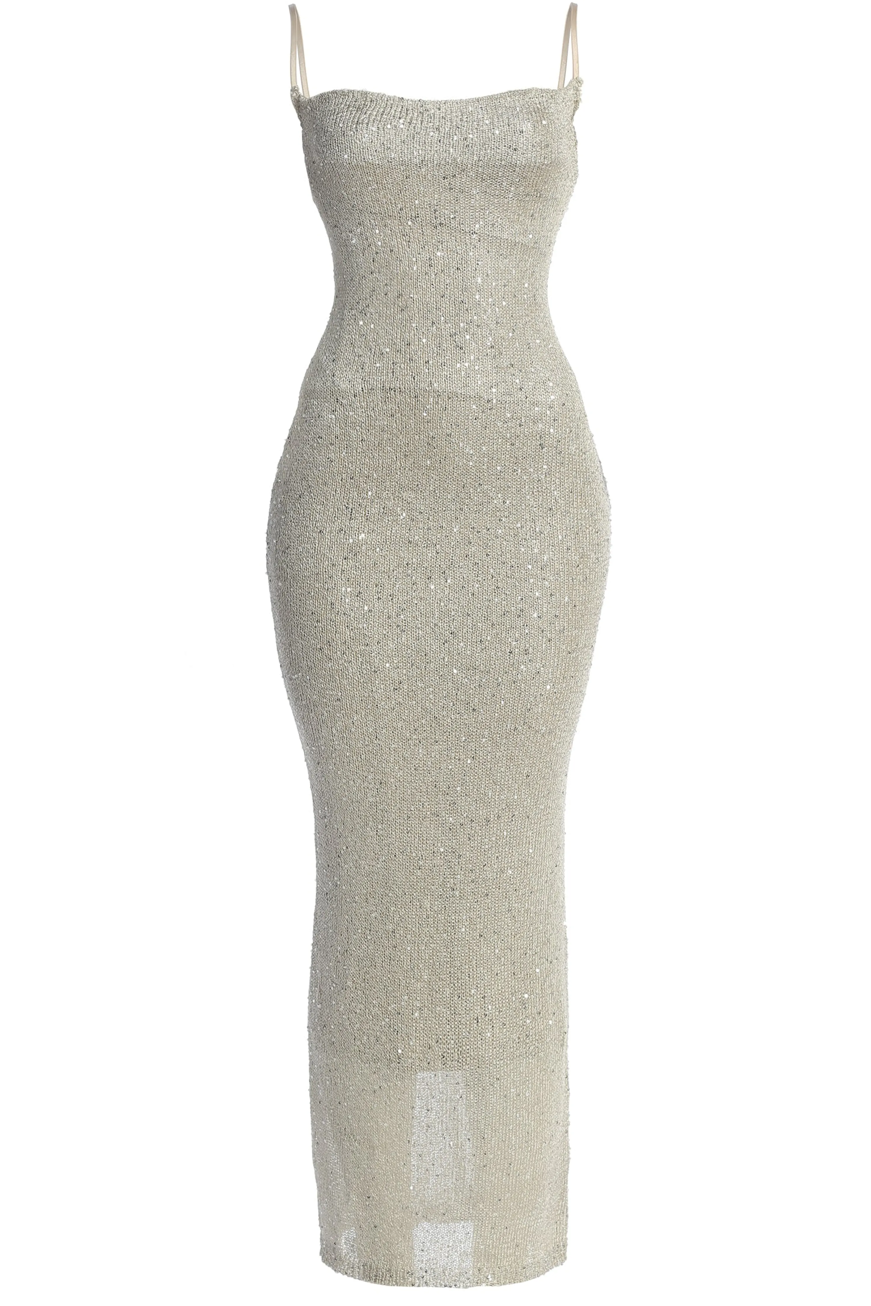 Shimmer under the stars in our Beige Noemie Sequin Maxi Dress. This high-shine maxi dress features a lovely cowl neck with adjustable shoulder straps and afitted silhouette with maxi hem. Made of a luxurious sequin knit material for a captivating finish with interior lining for coverage. Stretchy. Double lined.