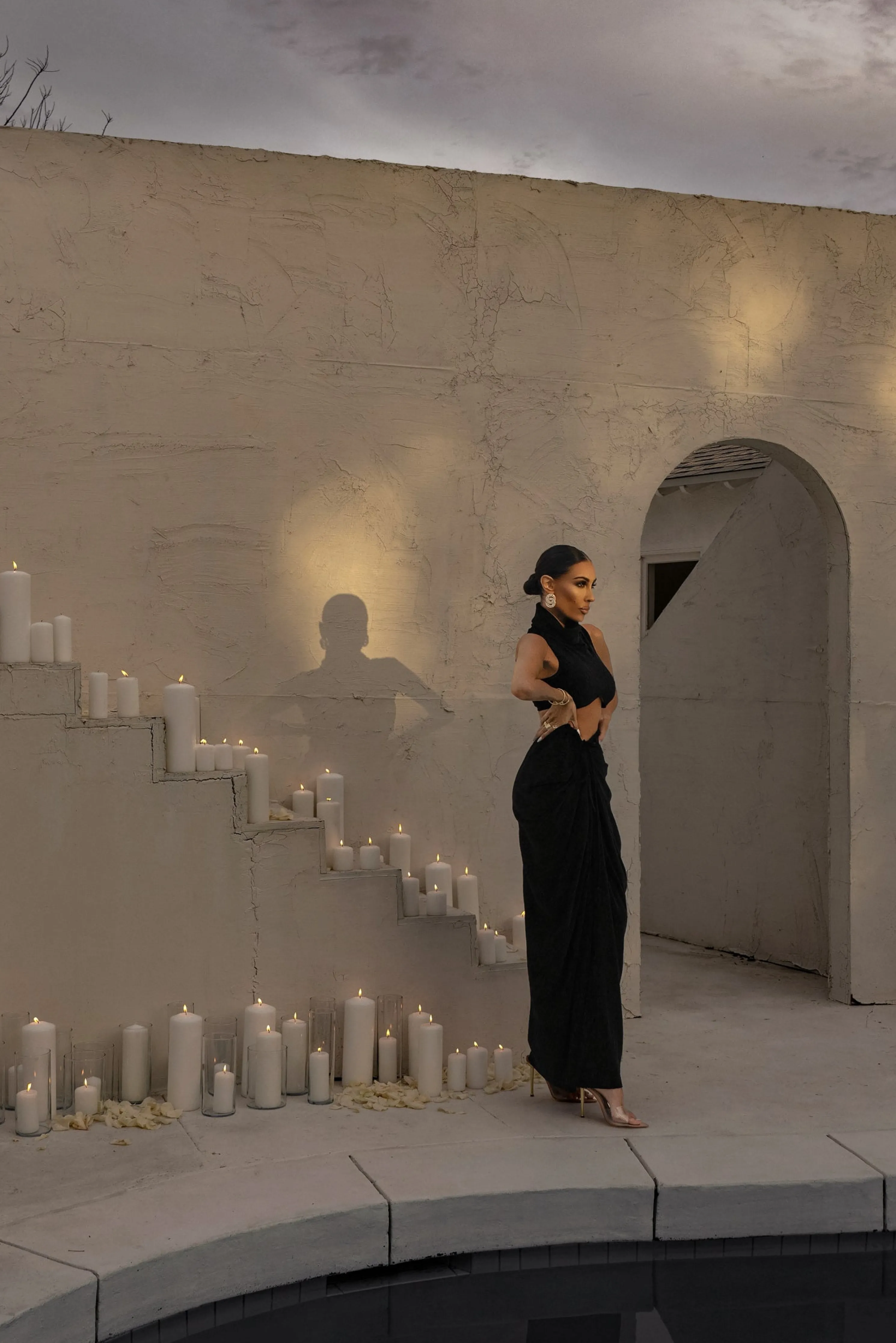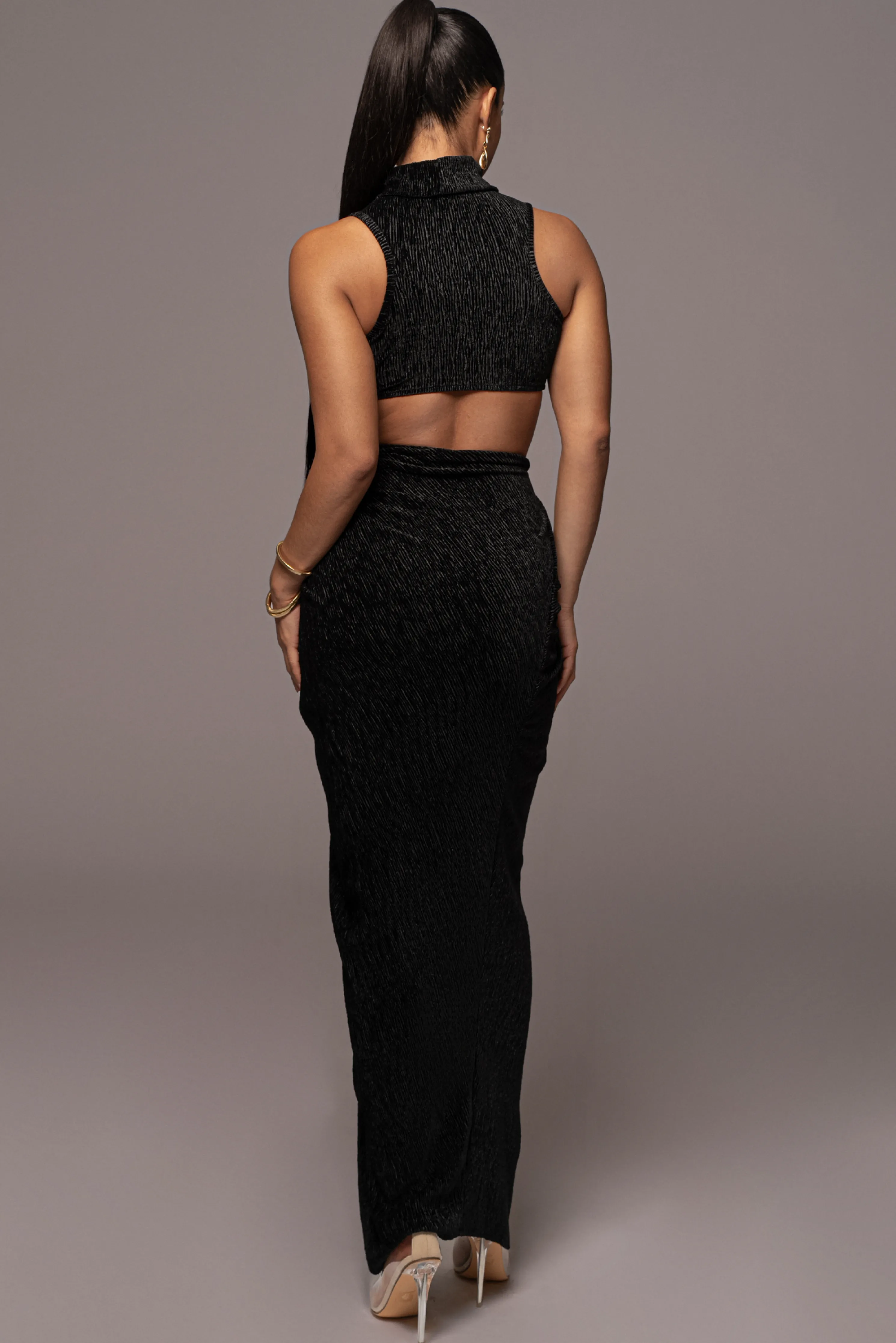 Our Noir Chosen One Velvet Skirt Set makes styling your next night out effortless! Crinkled velvet fabric shapes this romantic two-piece set featuring a sleeveless crop top with a turtleneck and an under-bust cut with structured wiring. The matching skirt is cut with a high waist and details a beautiful drape and side slit. Single-lined with stretch. Sold as set.