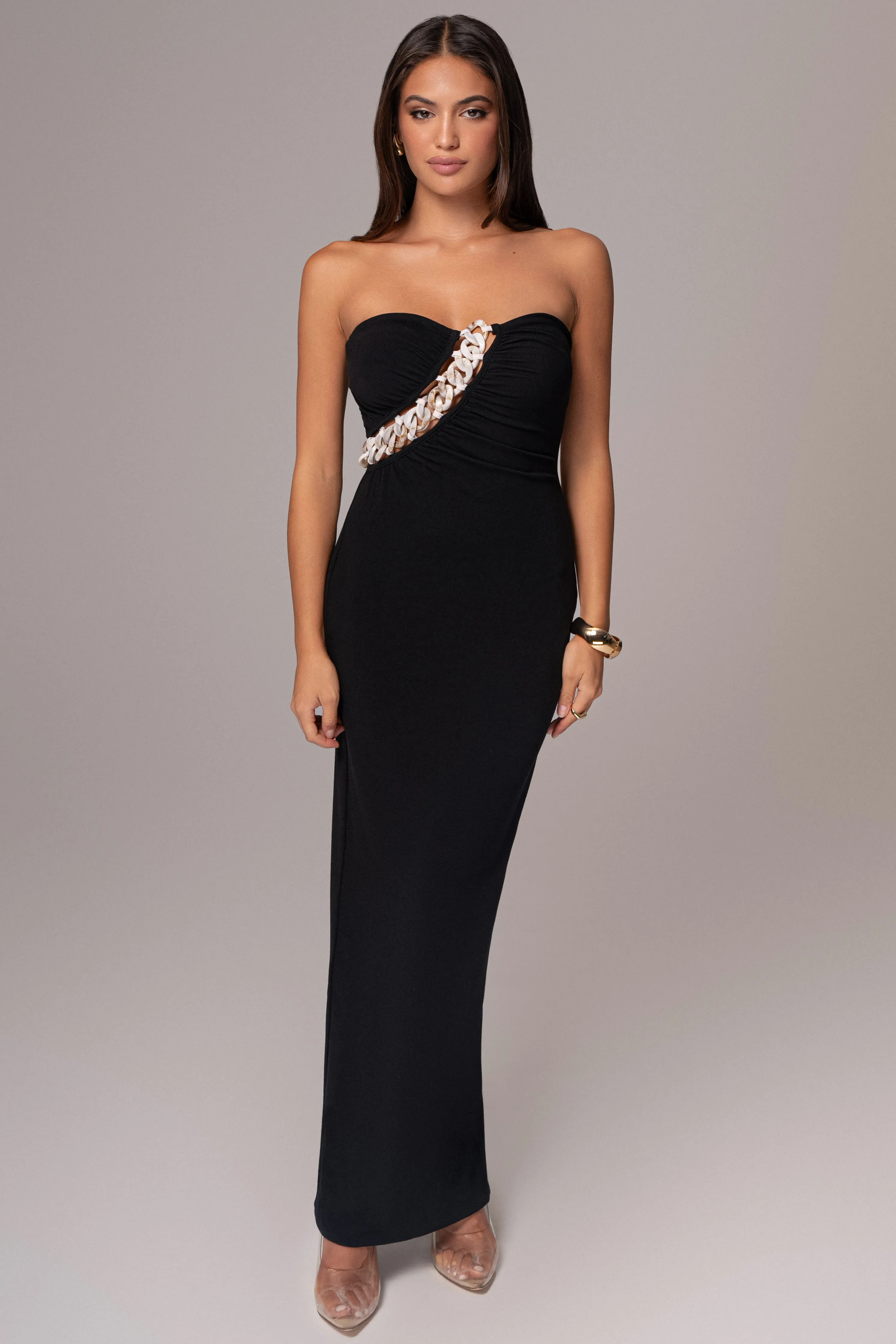 Experience the elegance of Fall with our Black Clarisse One Shoulder Dress. Made with double lining and slight ruching, this strapless maxi dress is adorned with an acrylic chain down the center and across the back for added elegance. Complete with a back slit and non-slip silicone at the bust for a secure hold all day long. Side zipper closure. Stretchy.