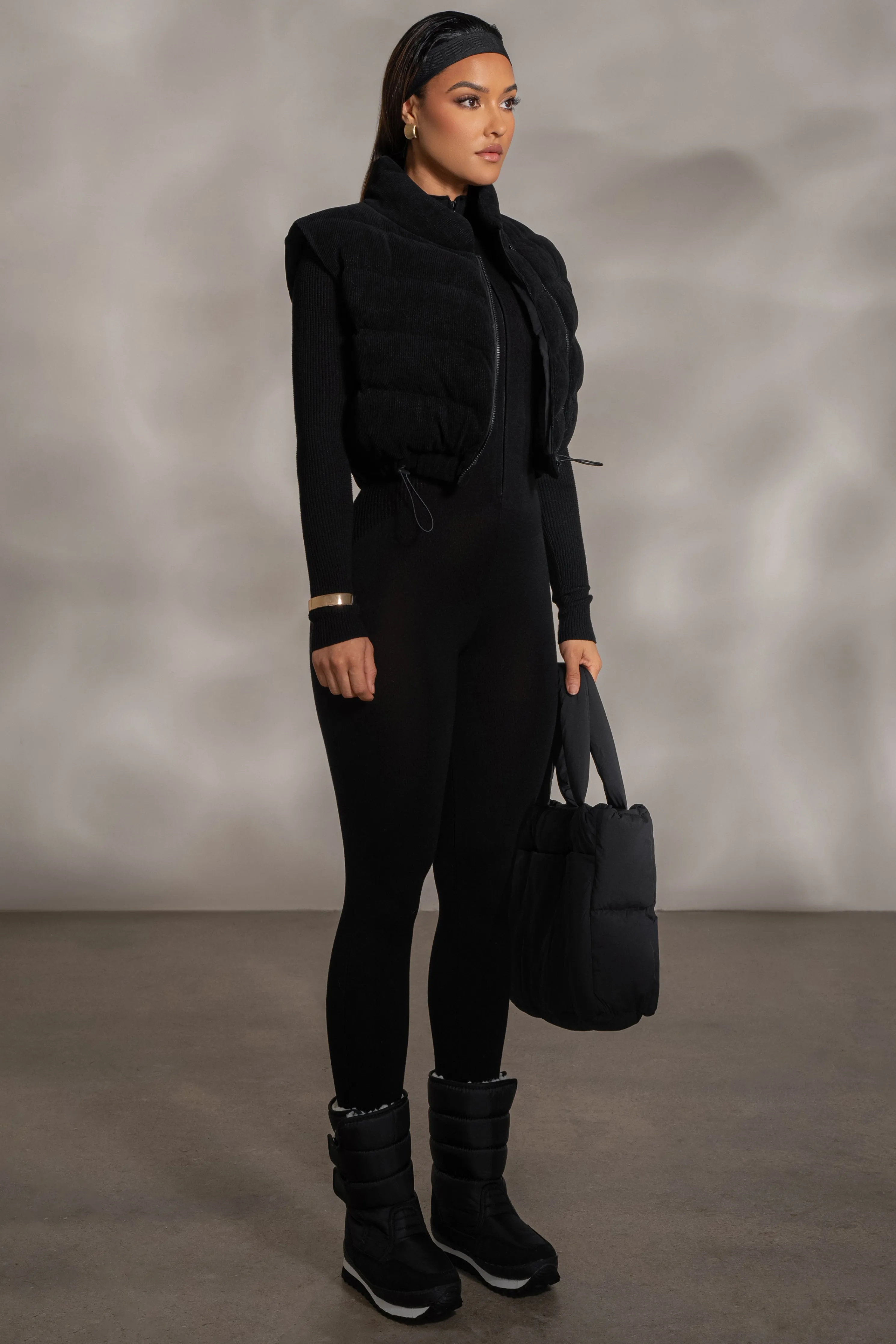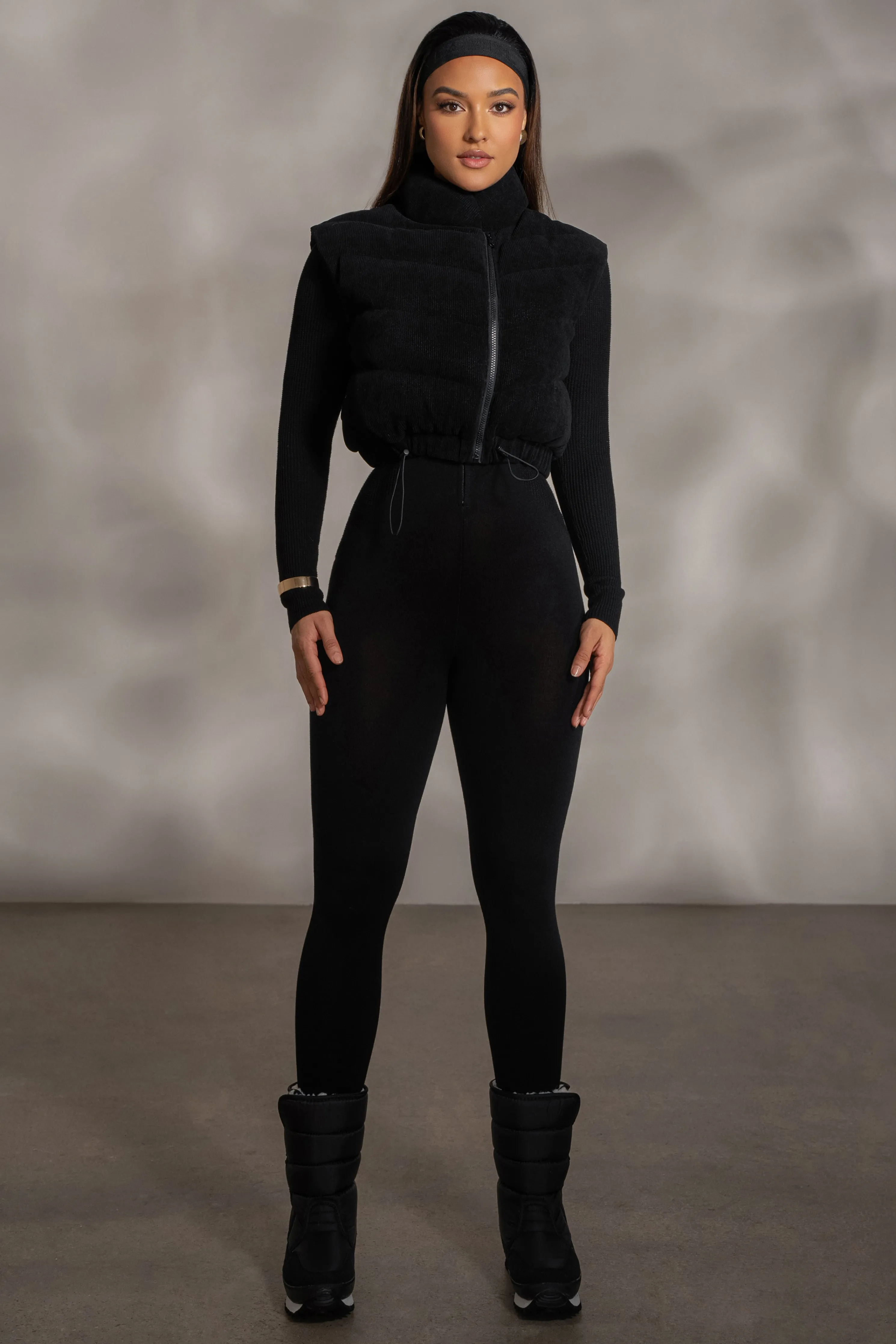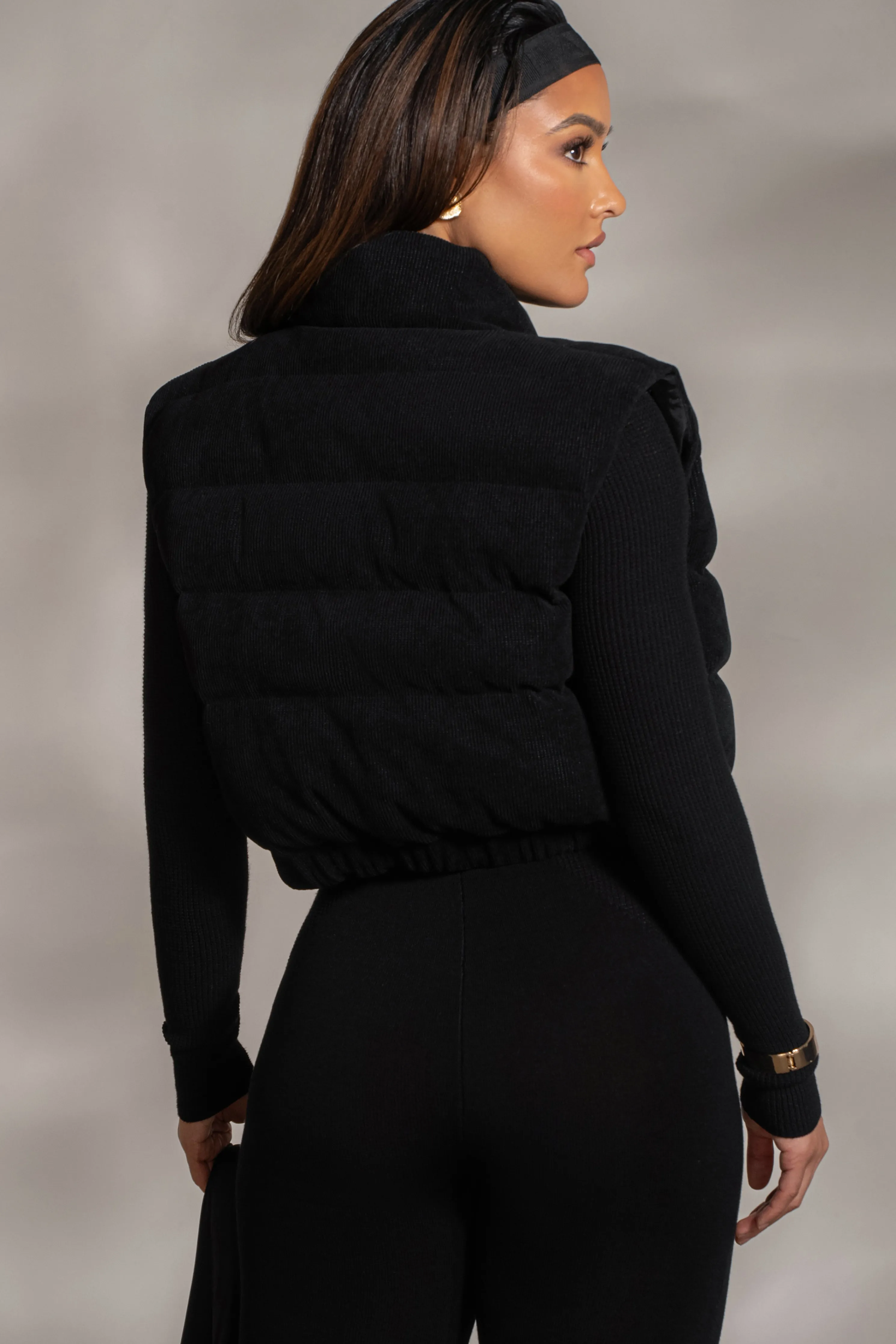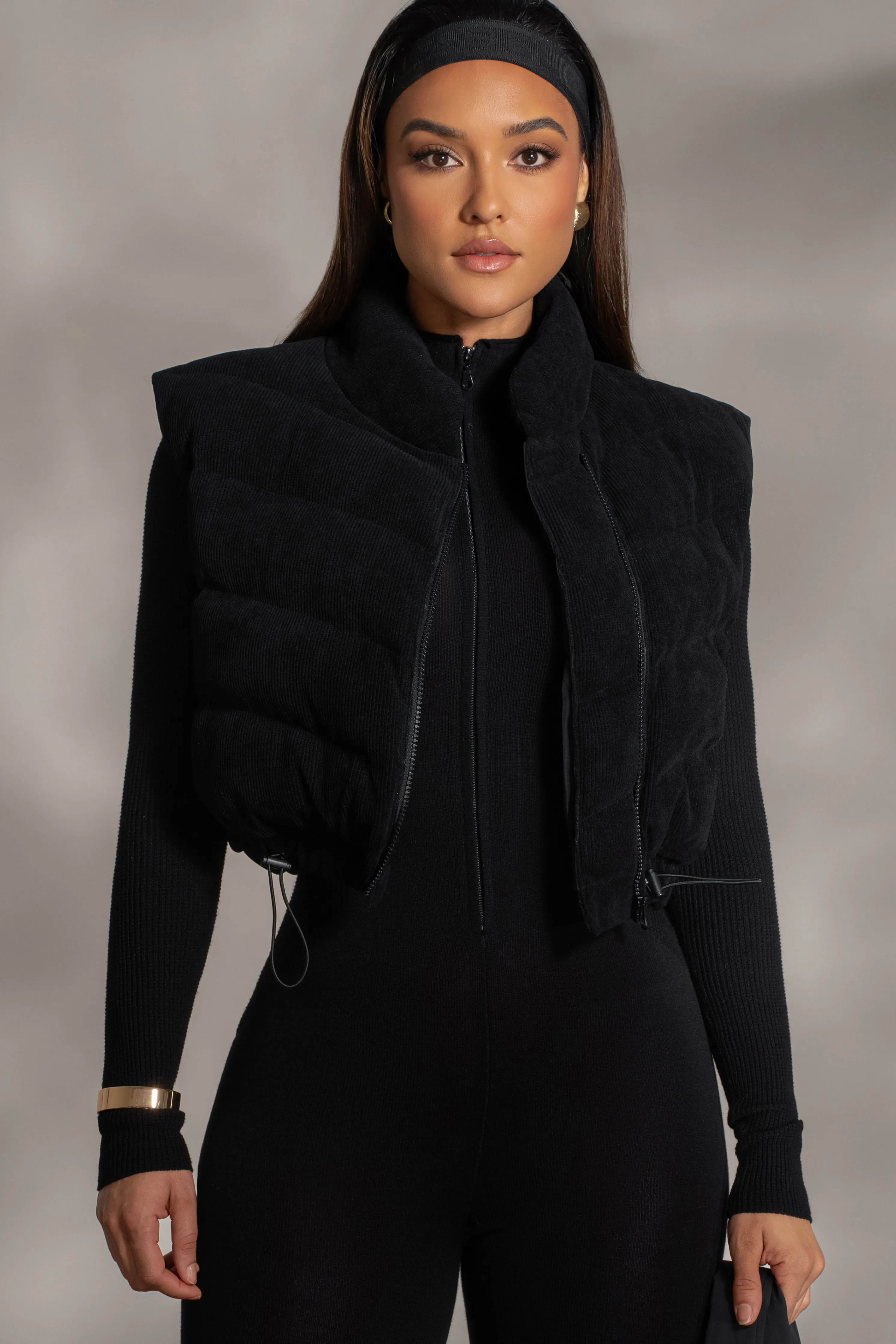 Elevate your winter wardrobe with our Black Delma Ribbed Puffer Vest. Tailored from soft corduroy fabric, this sleeveless puffer vest showcases a high neckline withbungee cords at the hem for a customized fit. Front zipper closure. Pair with ourKris Front Zipper Jumpsuit for the full look. Minimal stretch.