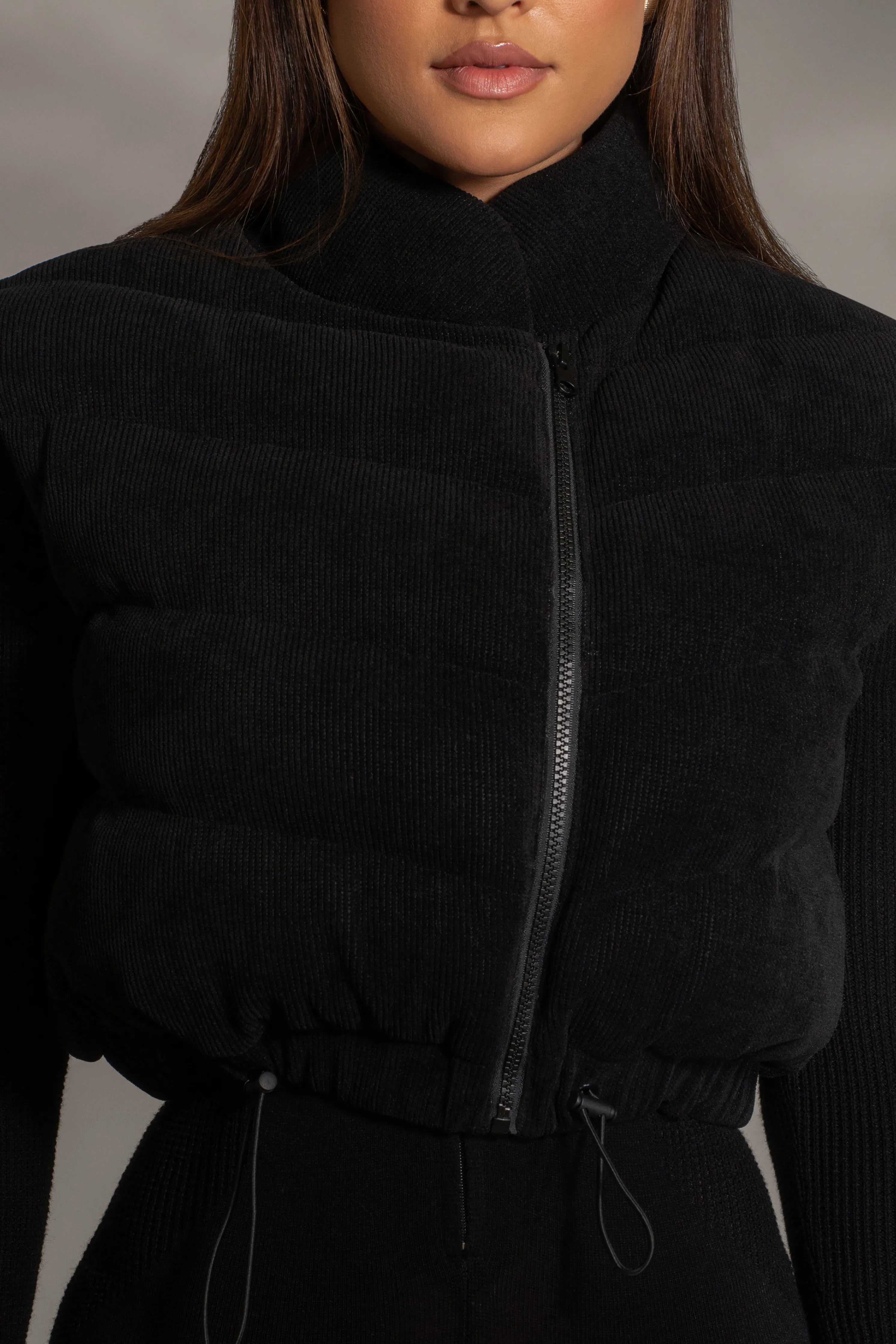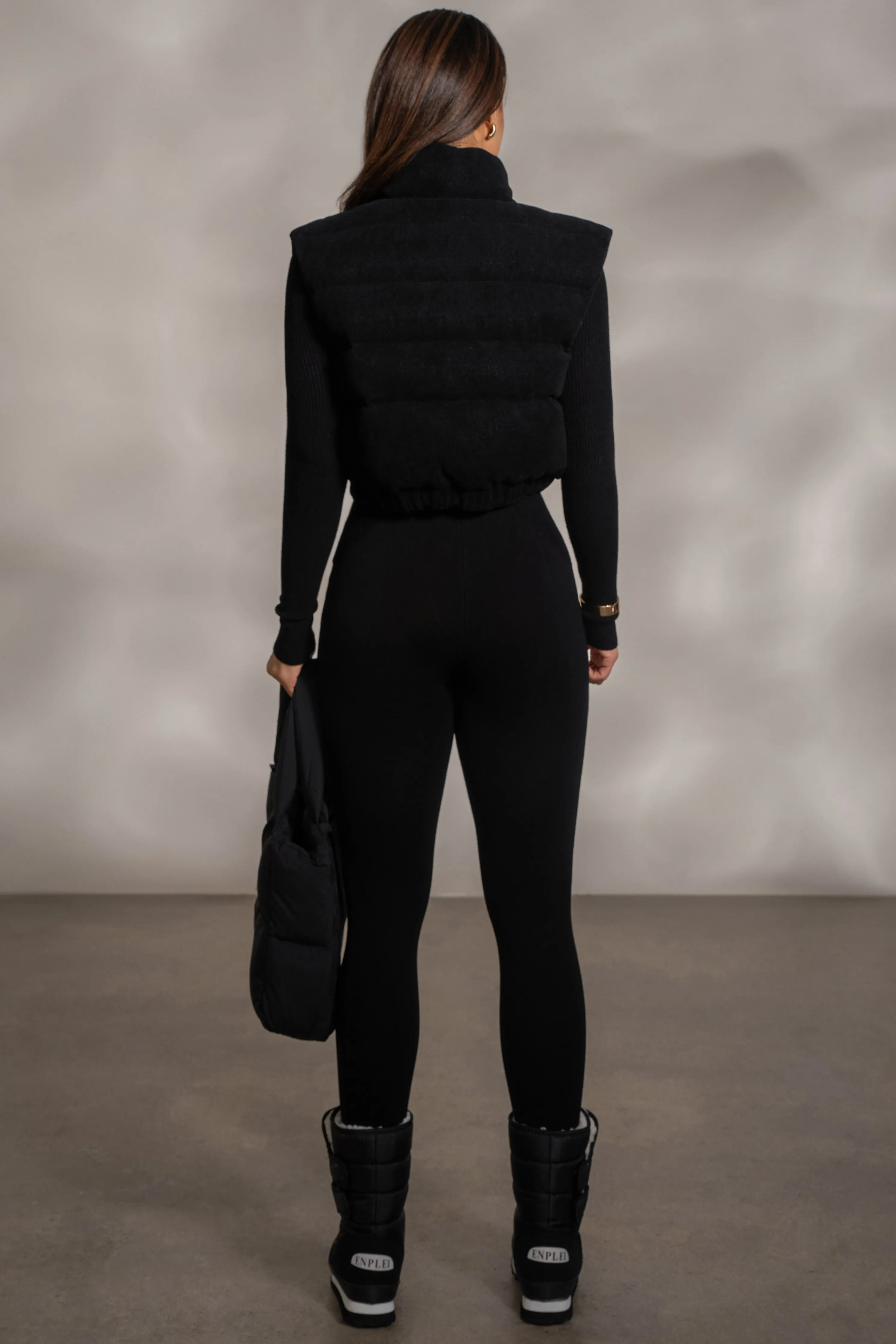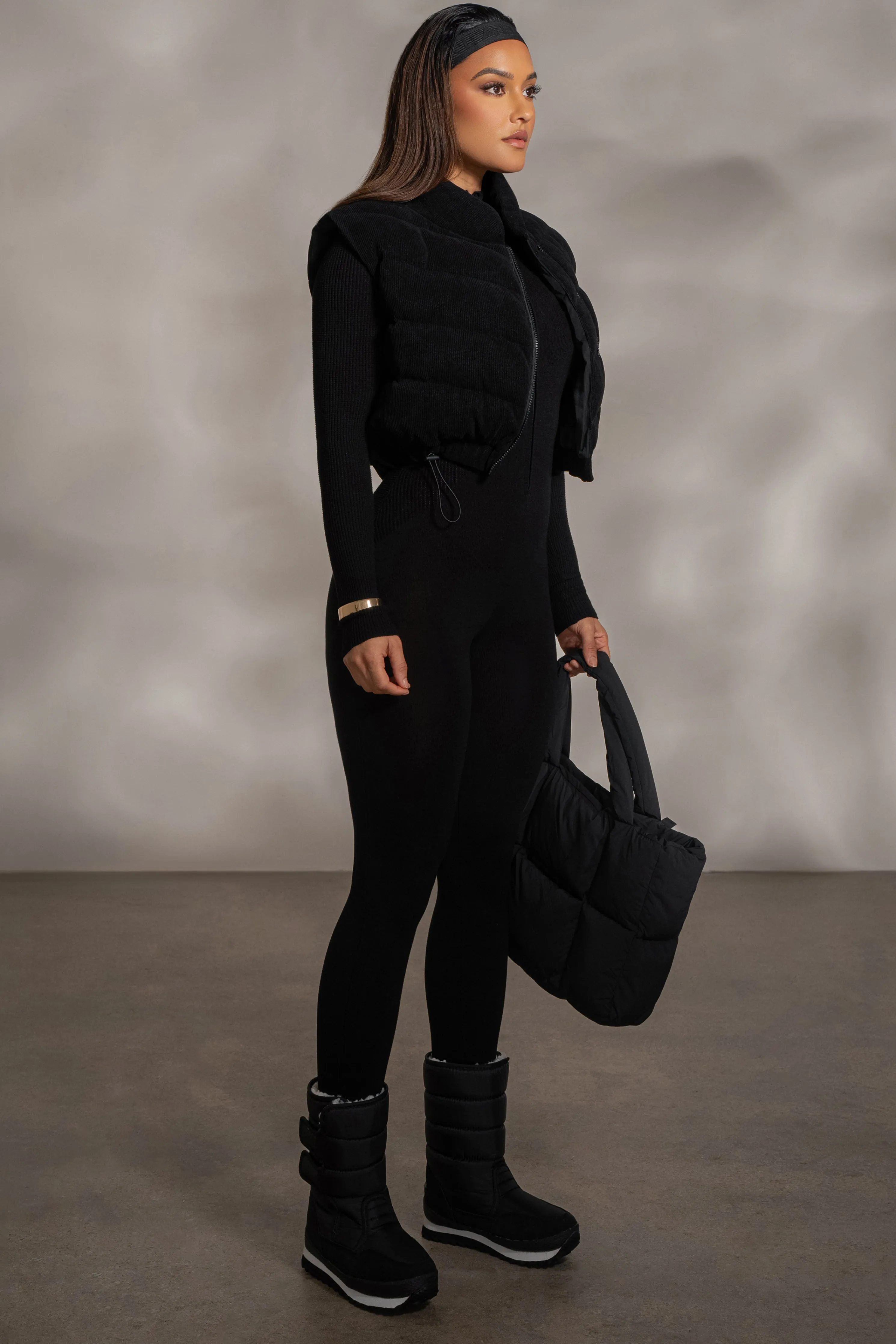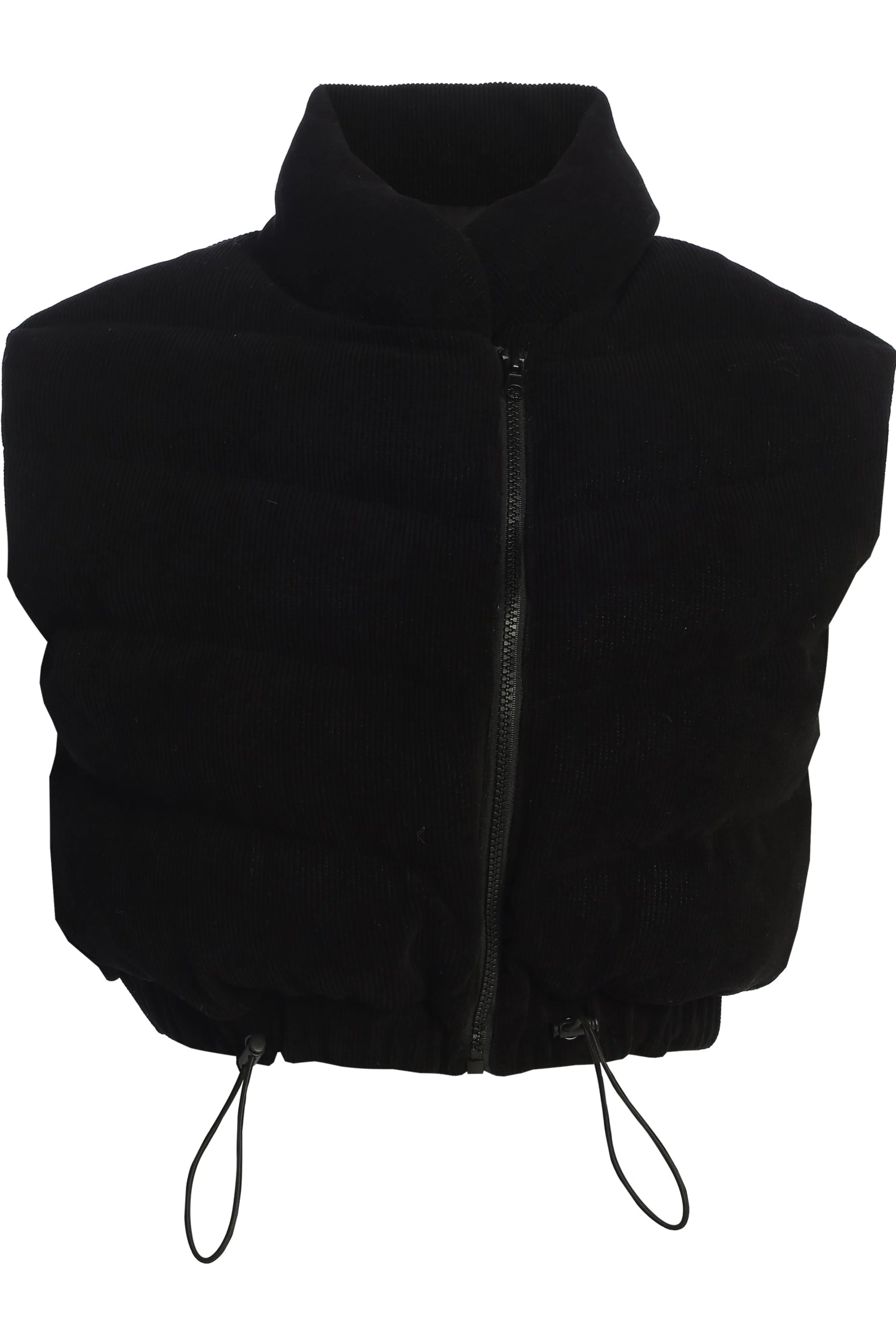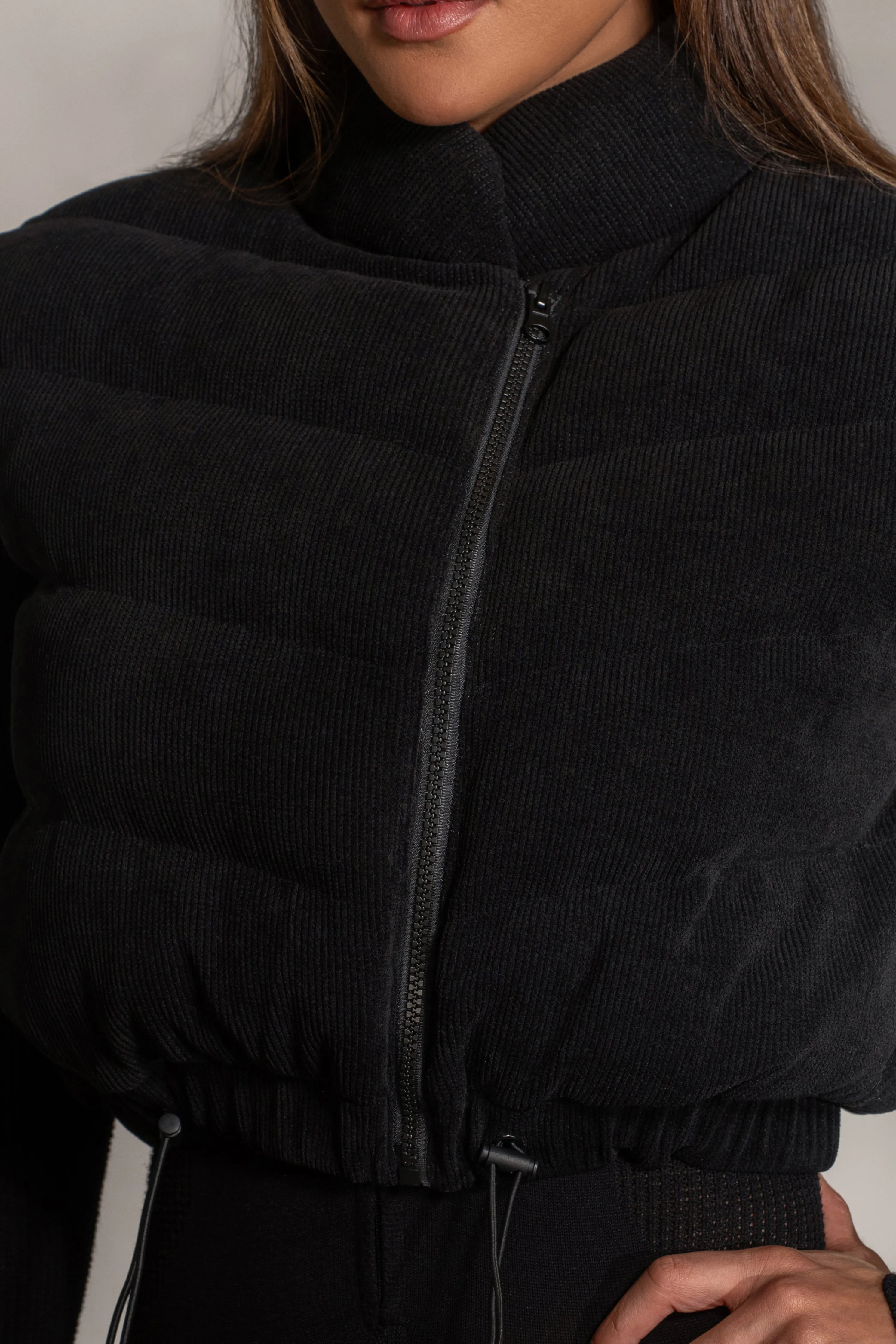 Elevate your winter wardrobe with our Black Delma Ribbed Puffer Vest. Tailored from soft corduroy fabric, this sleeveless puffer vest showcases a high neckline withbungee cords at the hem for a customized fit. Front zipper closure. Pair with ourKris Front Zipper Jumpsuit for the full look. Minimal stretch.