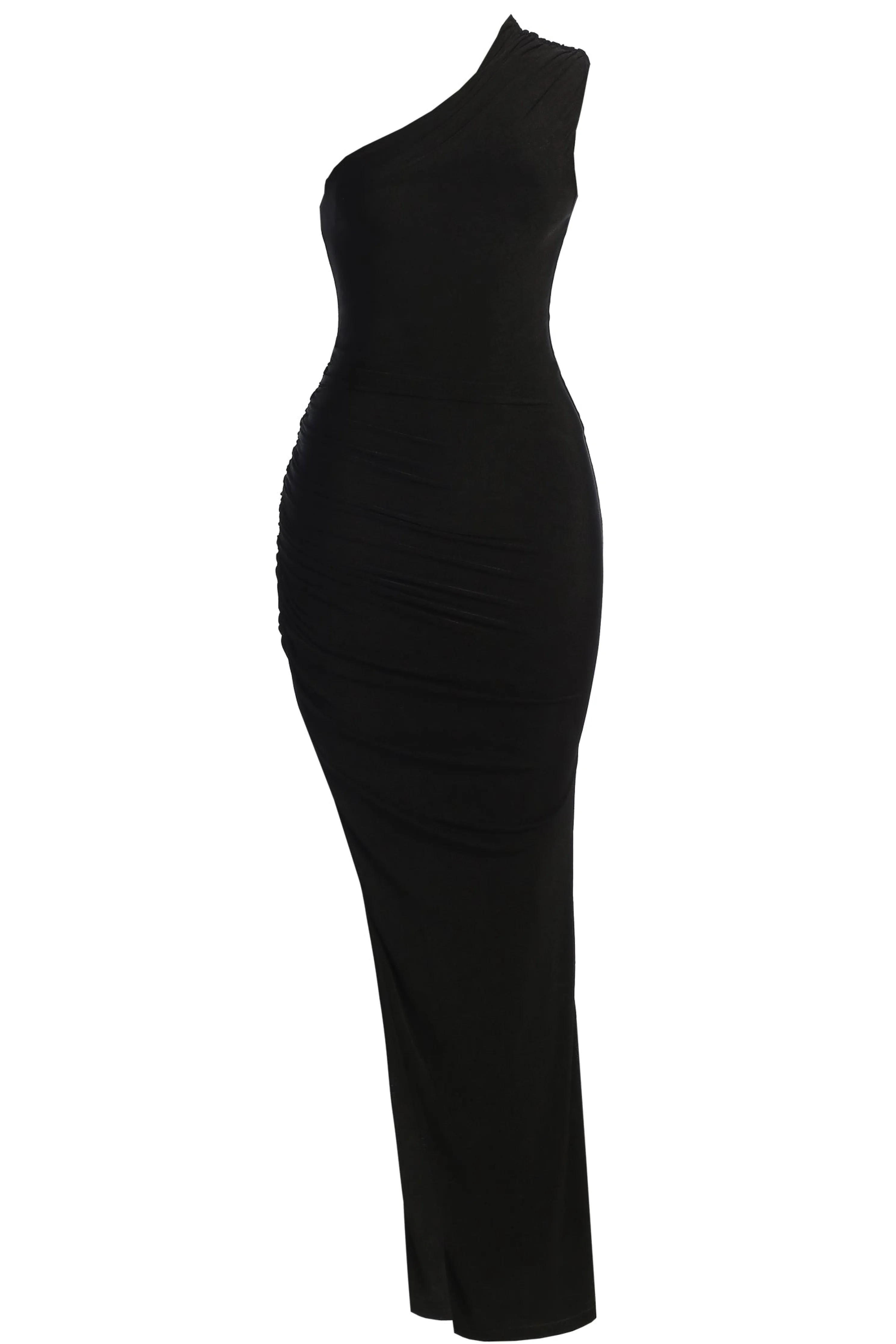 Designed for the JLUXLABEL Bridal Collection.Our Black Eden One Shoulder Maxi Dress serves timeless glamour. Featuring a one-shoulder neckline in a fitted silhouette with slight ruching at the shoulder and waist. A slide slit adds extra charm. Constructed in a stretchy slinky fabric offering a flexible fit. Double lined.