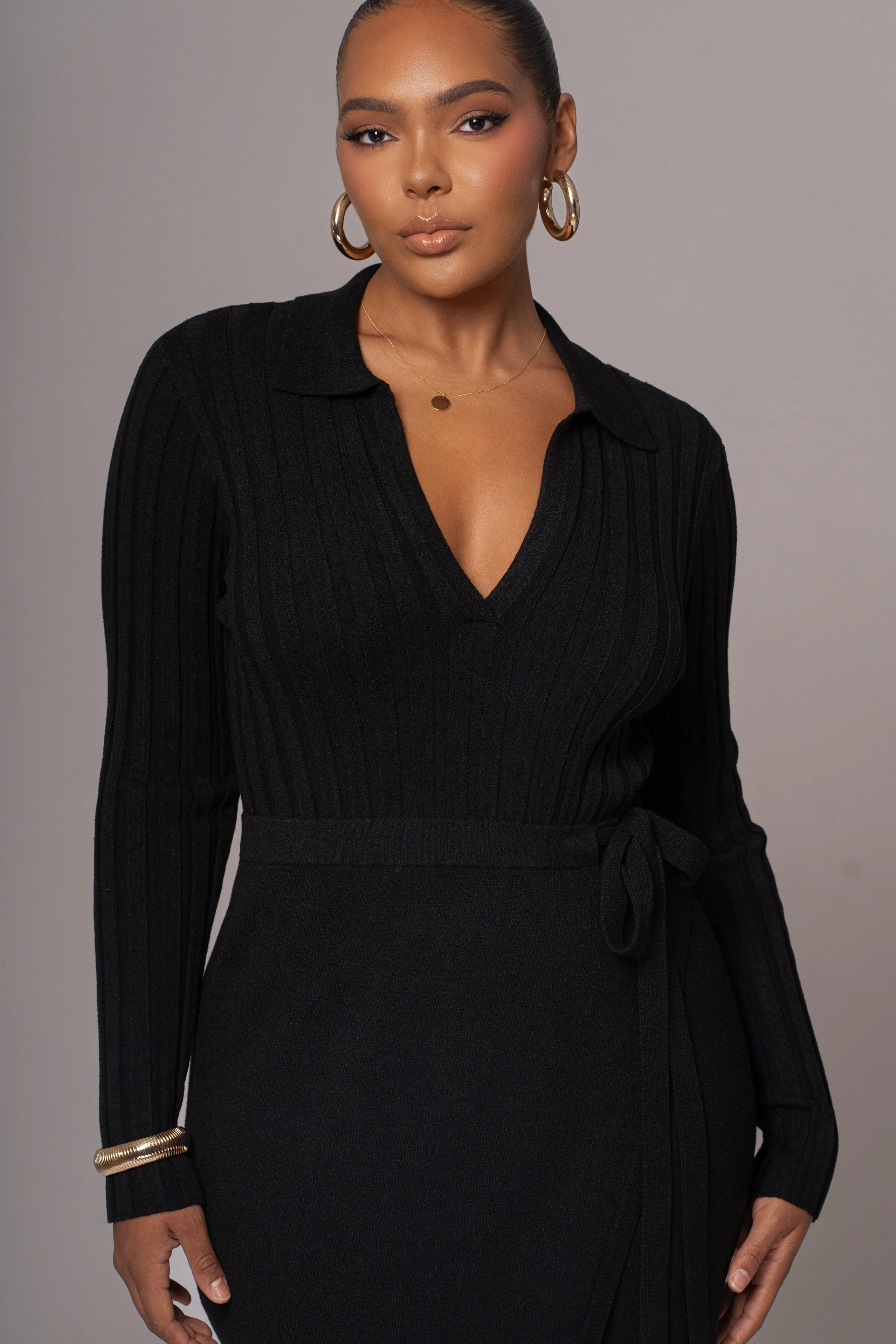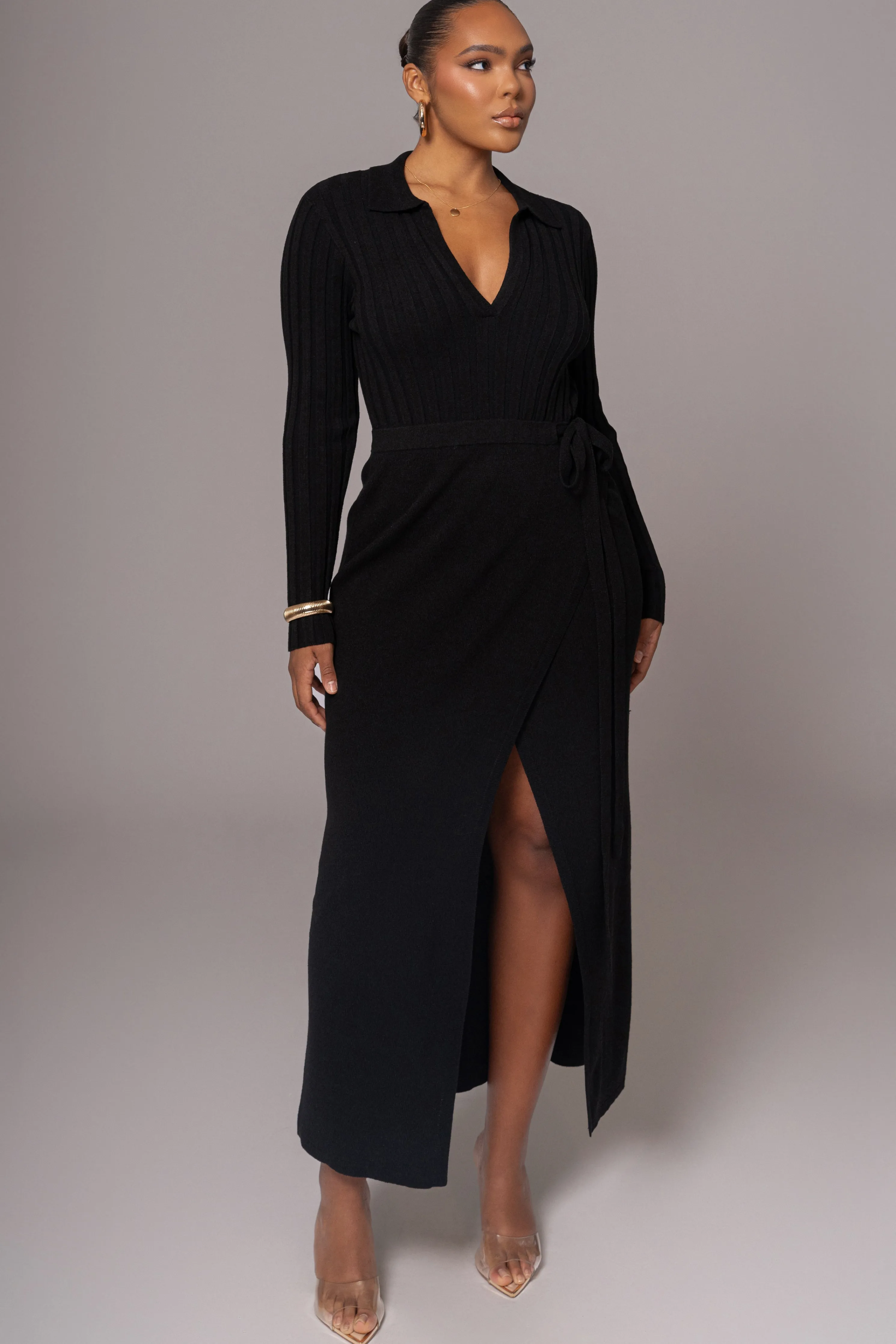 Discover your new go-to dress with our Black Emma Knit Maxi Dress. This wrap-inspired dress features a collared neckline and hidden waist straps that tie to create a cinched silhouette. A front slit at the center adds a touch of elegance. Made from stretchy knit fabric for a comfortable and stylish fit. Single lined.