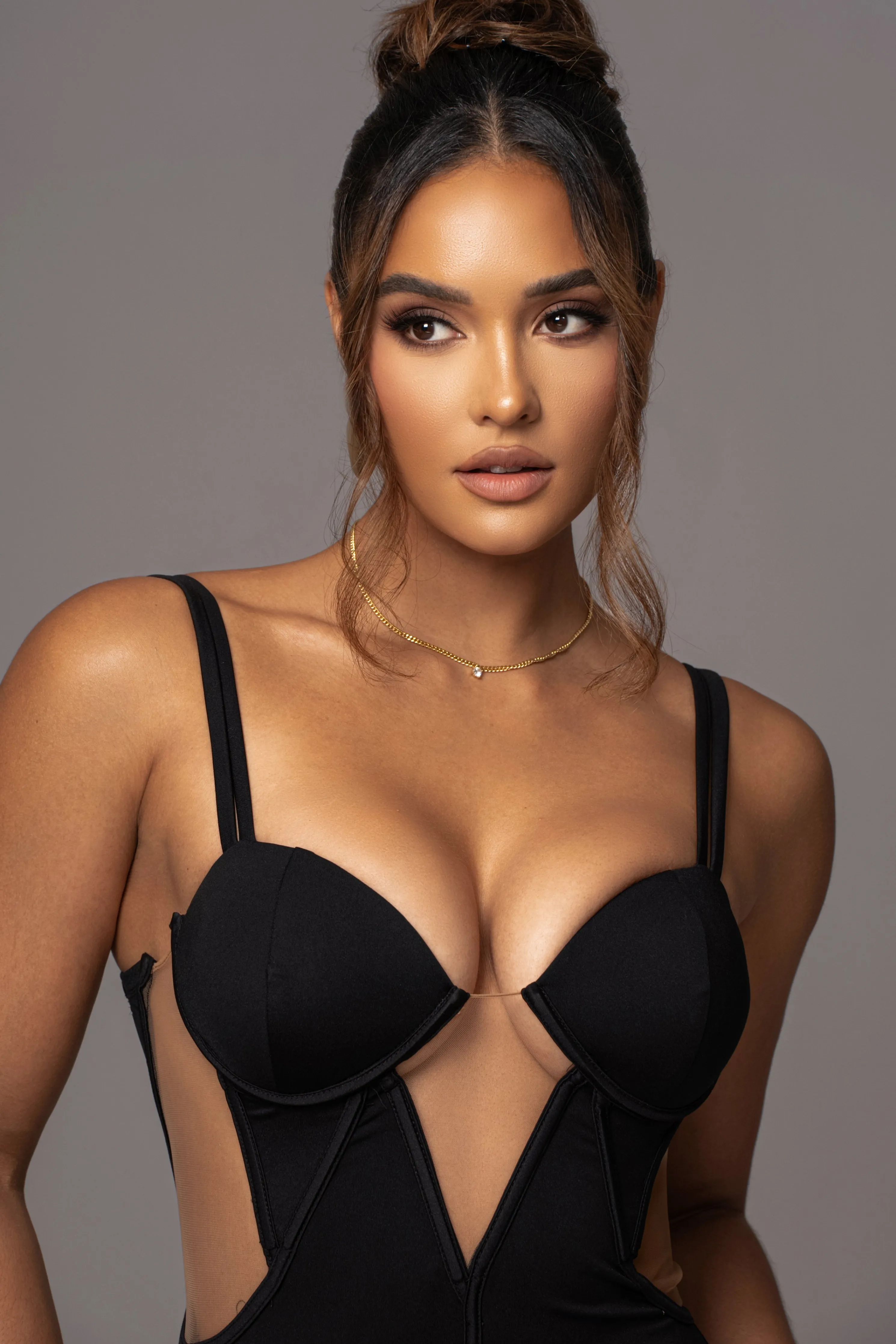 Our Black Enchantment Bustier Maxi Dress is a statement-making piece with delightfully intricate details. Crafted from luxurious fabric, this stunning dress featuresa bustier-inspired designwith a built-in bra for asecure andelegant fit. Contrasting mesh panels adorn the top waist for a contemporary anddaring touch. Complete with adjustable shoulder straps, padded/wired cups, and back zipper closure. Double lined. Medium stretch.
