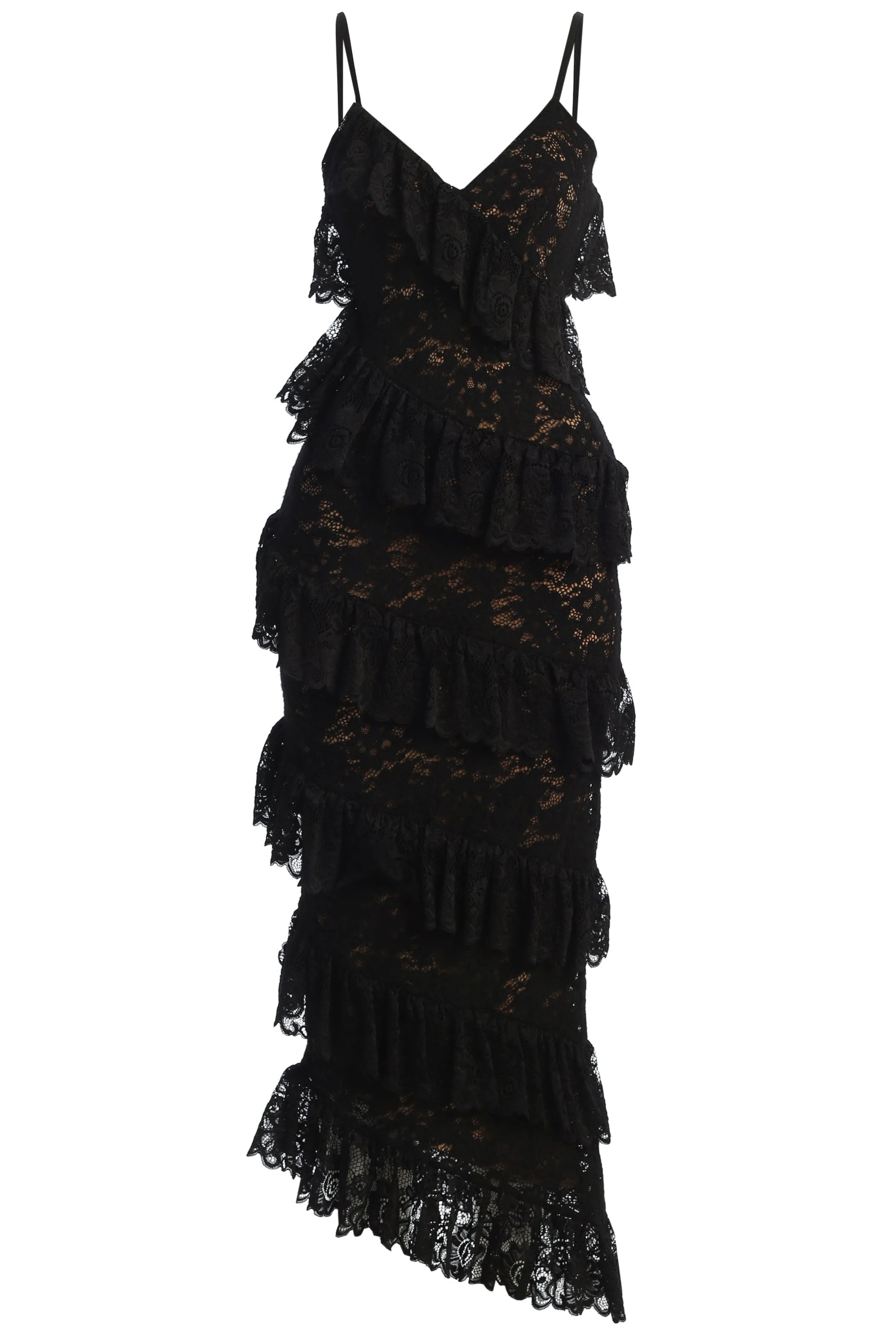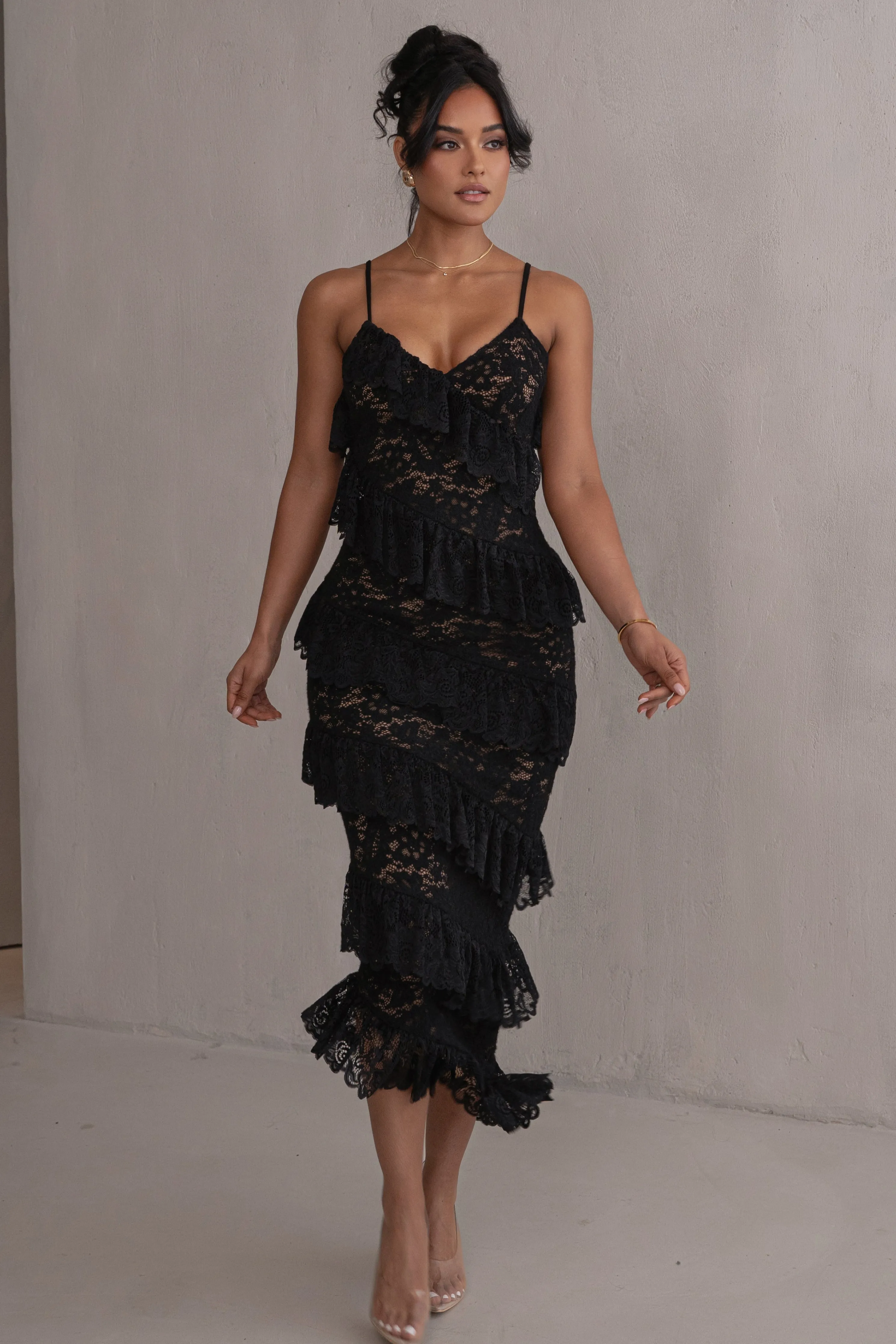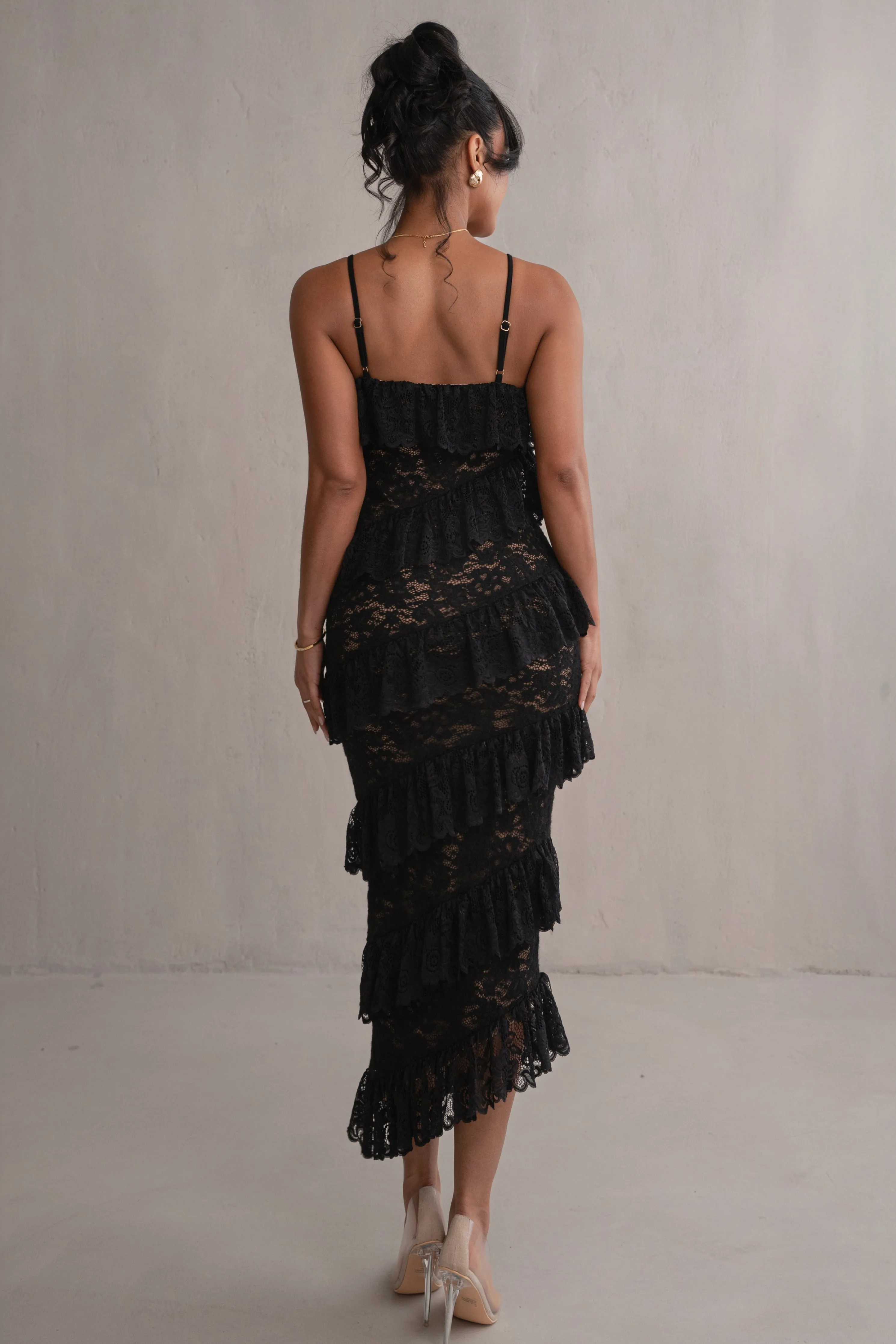 Designed for the JLUXLABEL Bridal Collection. Introducing the Black Feeling Of Forever Ruffle Dress, a masterpiece of elegance. Crafted from delicate lace with a nude underlining, this maxi dress exudes ethereal beauty. Its captivating ruffles cascade in an asymmetrical pattern, adding a touch of romance to your look. With a v-neckline and adjustable shoulder straps, it offers a flattering fit. Medium Stretch.