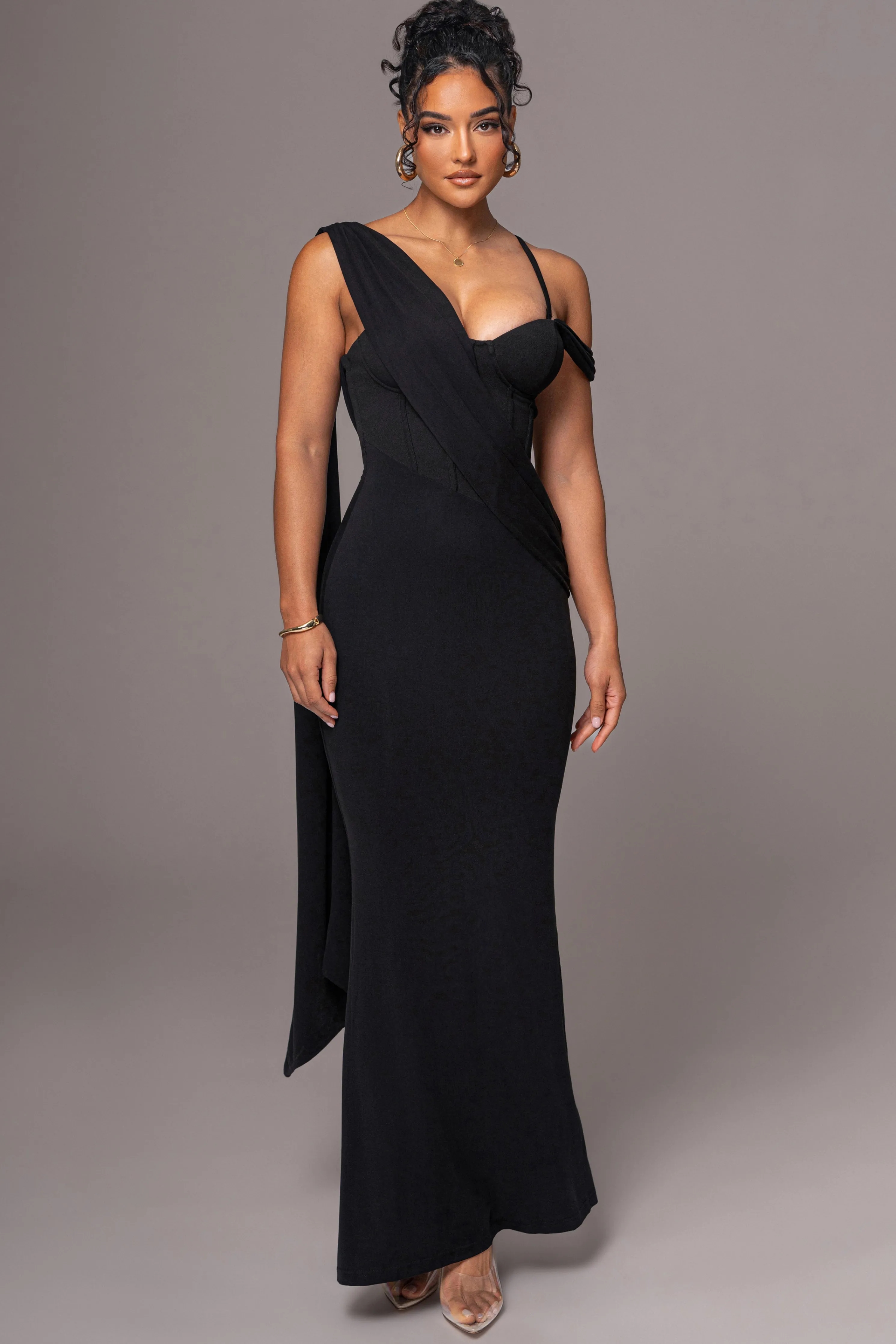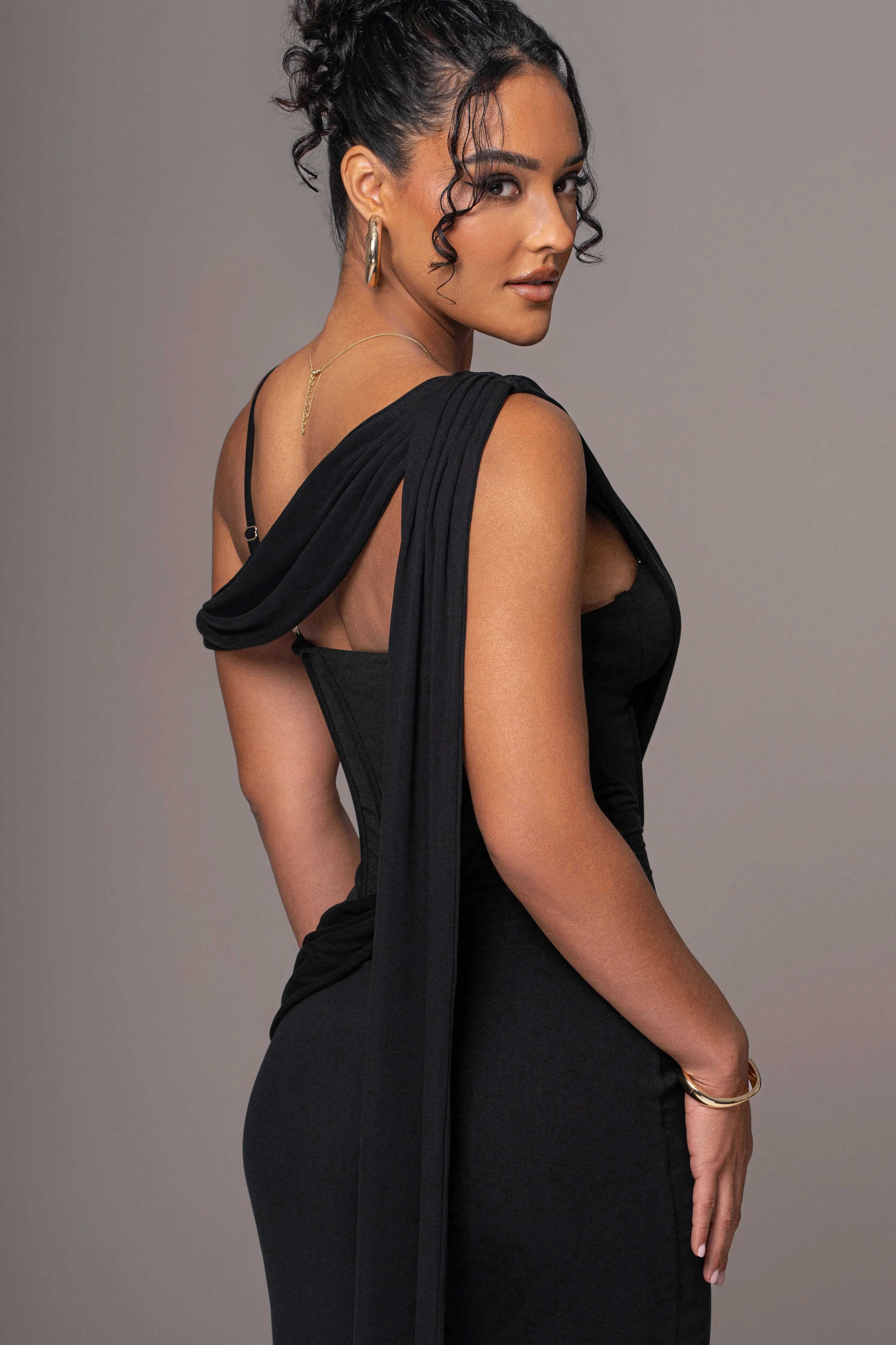 Introducing the Black Grand Entrance Drape Dress, a show-stopping maxi designed to turn heads. Featuring a built-in corset with adjustable/removable shoulder straps, a non-slip gel grip at the bust, and a flared hem. Elegant front and back drapes attach at the shoulders, creating a graceful, draped silhouette. Made from ultra-soft, double-lined modal with a hidden side zipper. Stretchy.