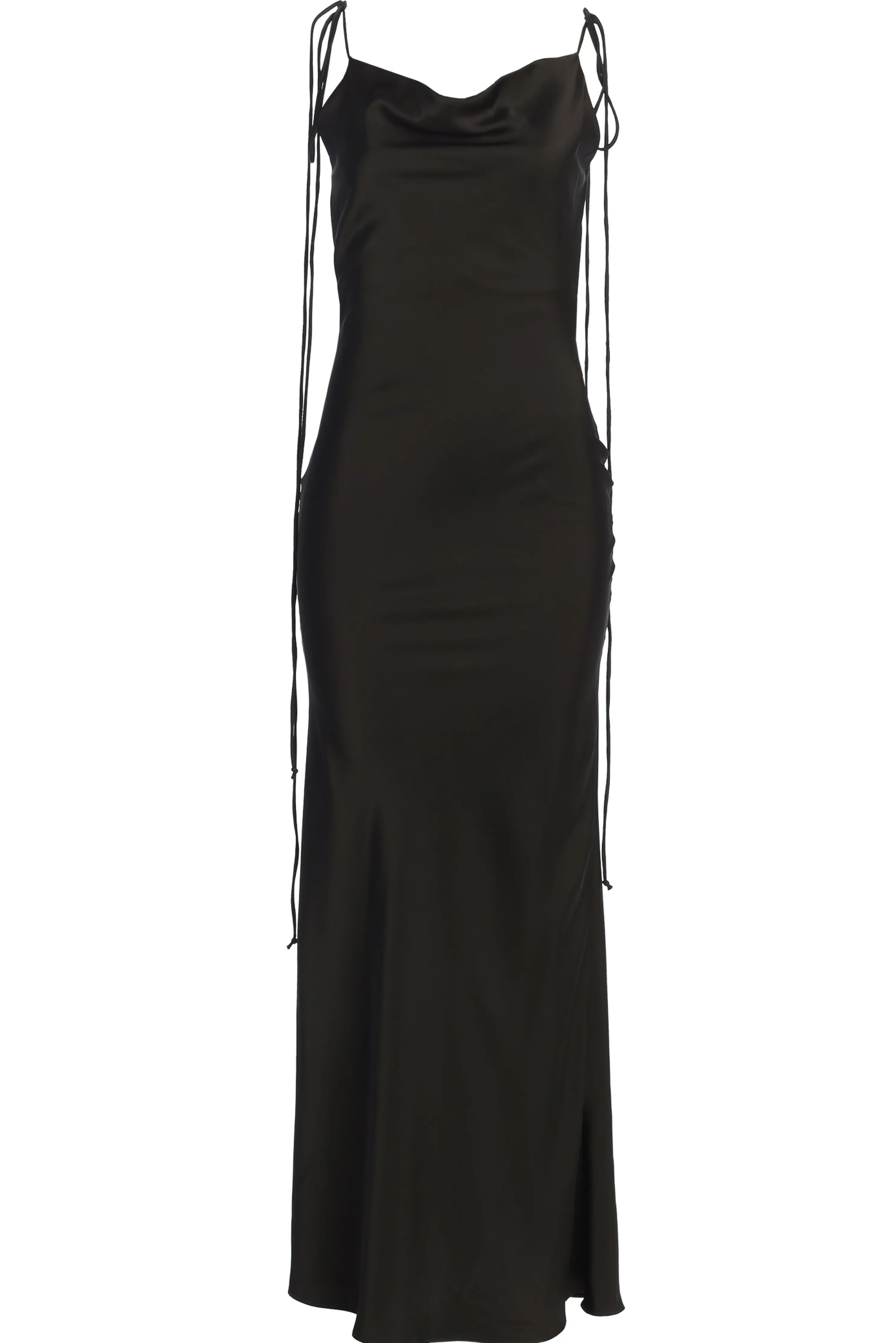 Our new Noir Irresistible Satin Maxi Dress serves timeless glamour in a sleek maxidesign crafted of ultra smooth satin fabric. This dazzling satin dress features a chic cowl neckline withadjustable bow-tie shoulder straps and a low draped cowl back showing off some skin. Mermaid hem. No stretch. Single lined.