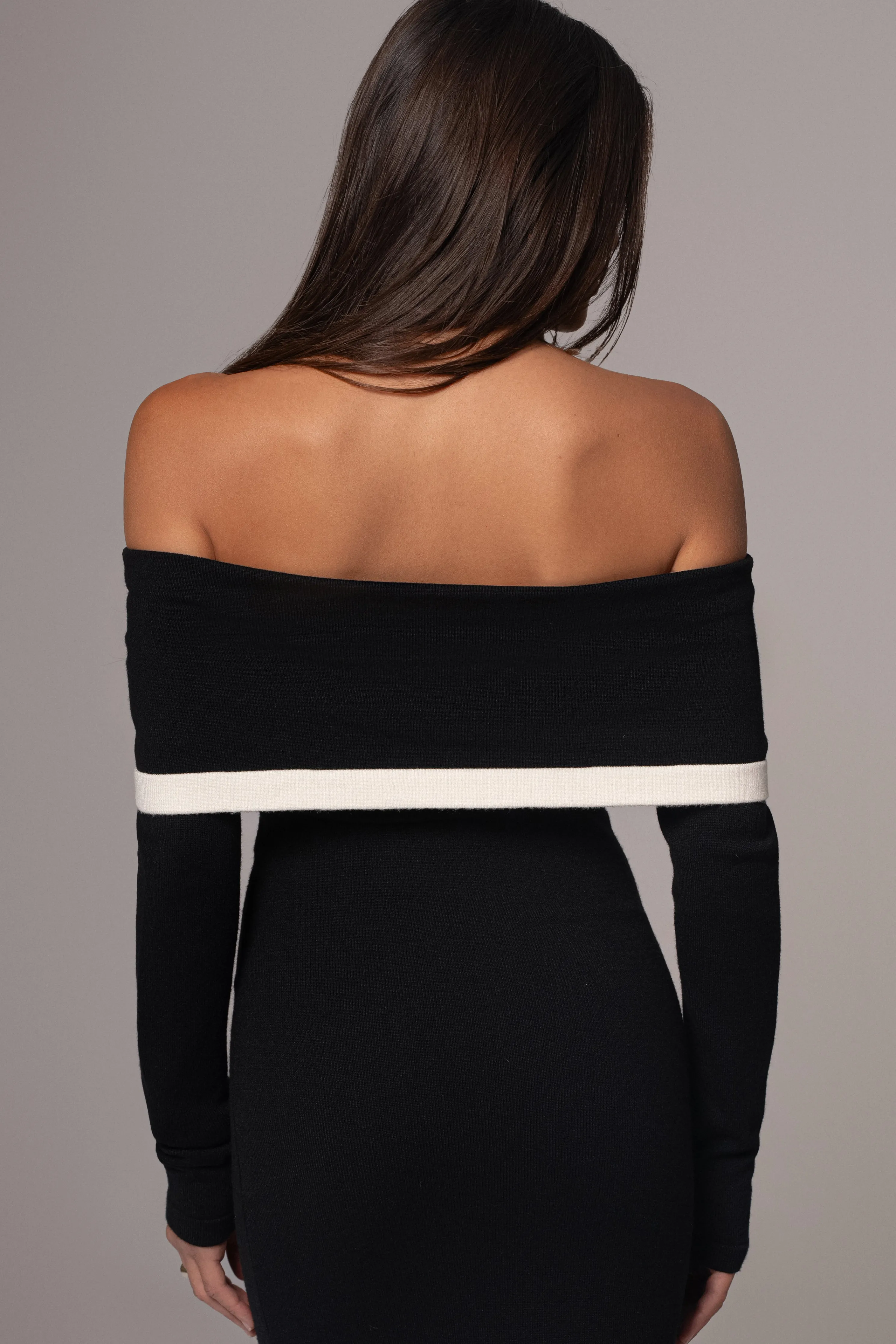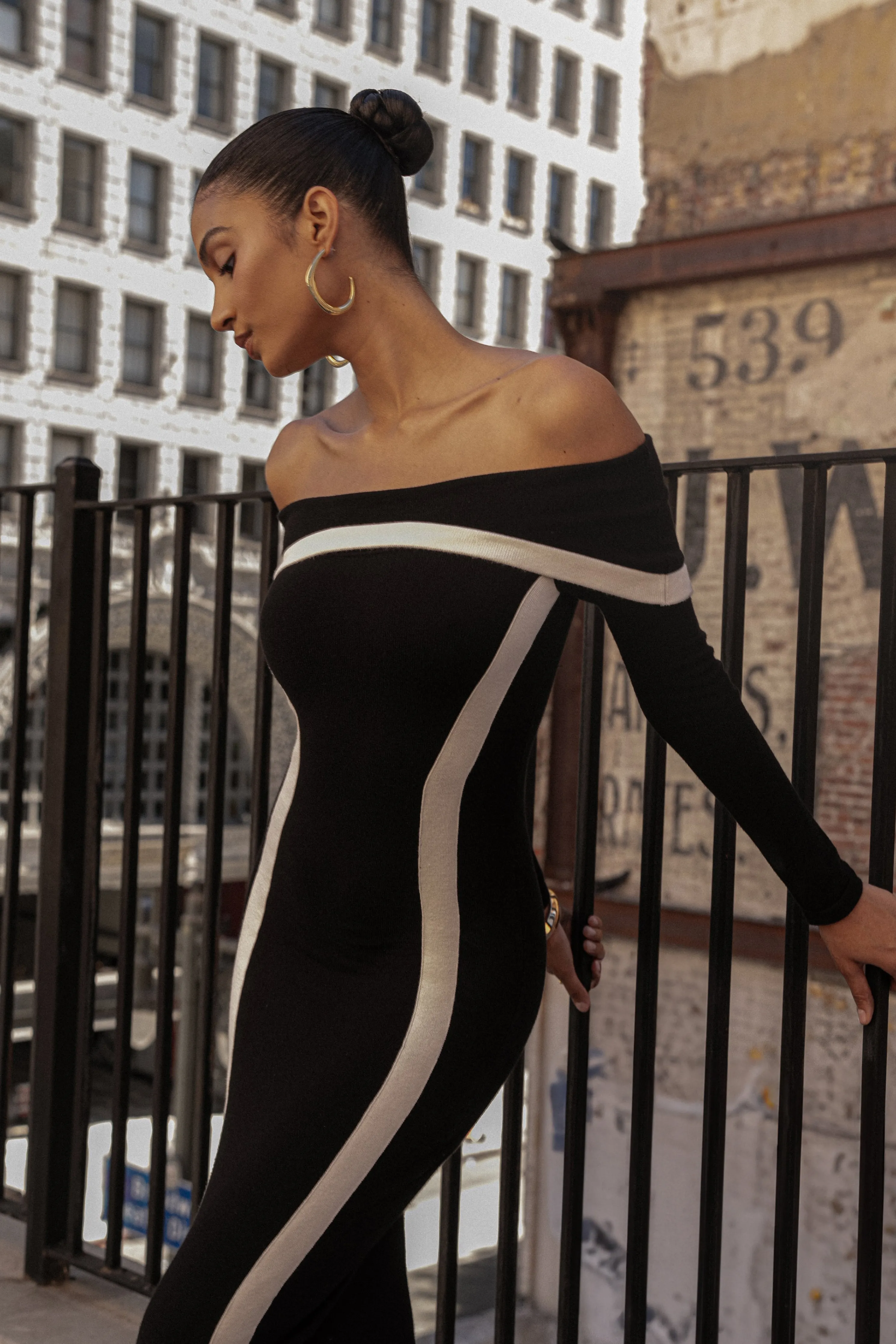 Be a vision of elegance and style in our Black Janet Off Shoulder Maxi Dress. Featuring a sophisticated contrast design with an off the shoulder neckline and fold-over edge. Crafted from a single lined knit fabric offering both comfort and style. Stretchy.