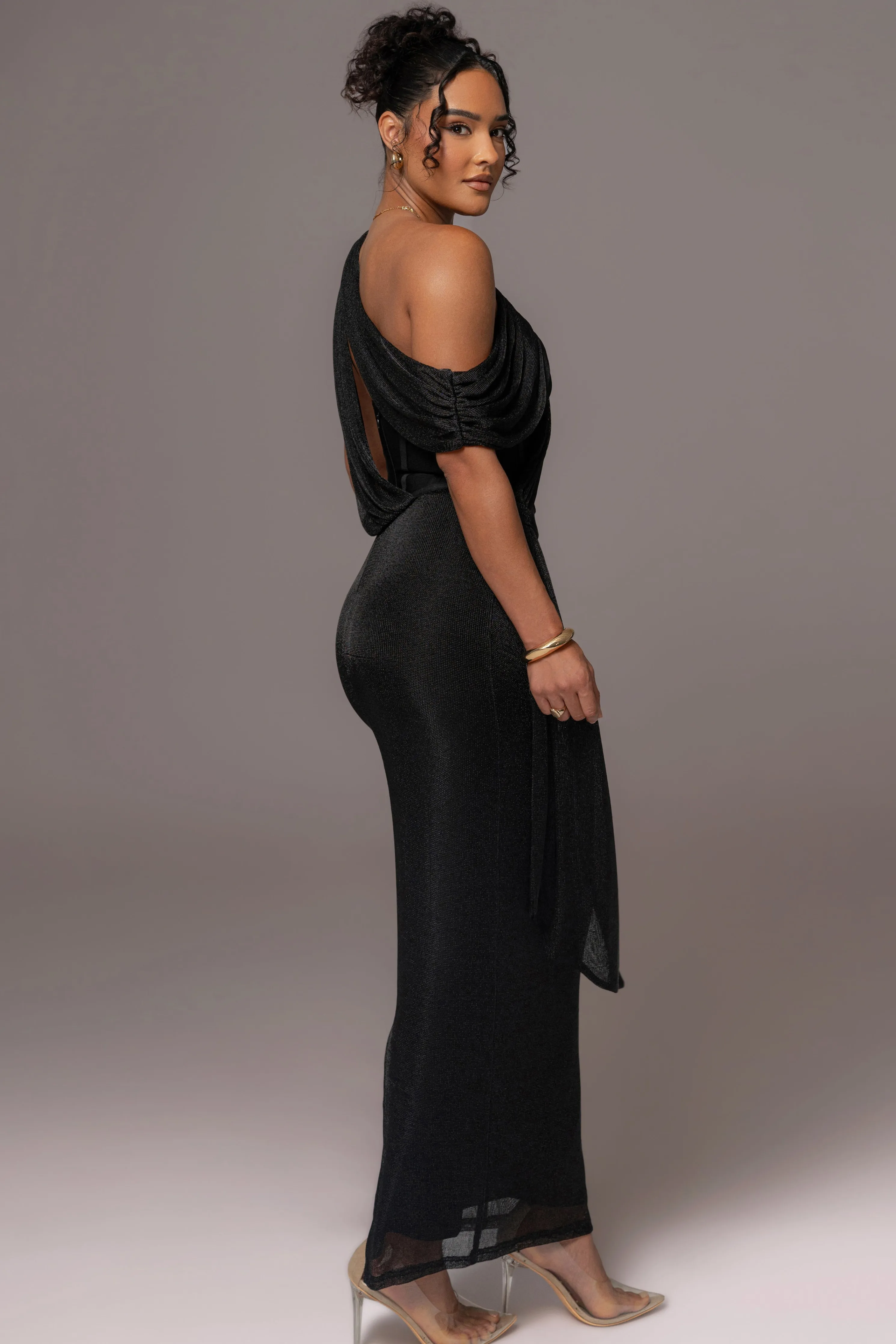 Our Black Metallic Celestina Draped Maxi Dress is sure to take your breath away with its asymmetric neckline, enchanting corset design, and elegantly draped waist. Crafted from a luxurious blend of bandage and metallic chain netting fabric, this stunning maxi dress features an adjustable shoulder strap, cup padding, and boning on each side for added structure. It’s finished with a back zipper closure and non-slip grip gel at the bust for a secure hold. Double-lined. Stretchy.