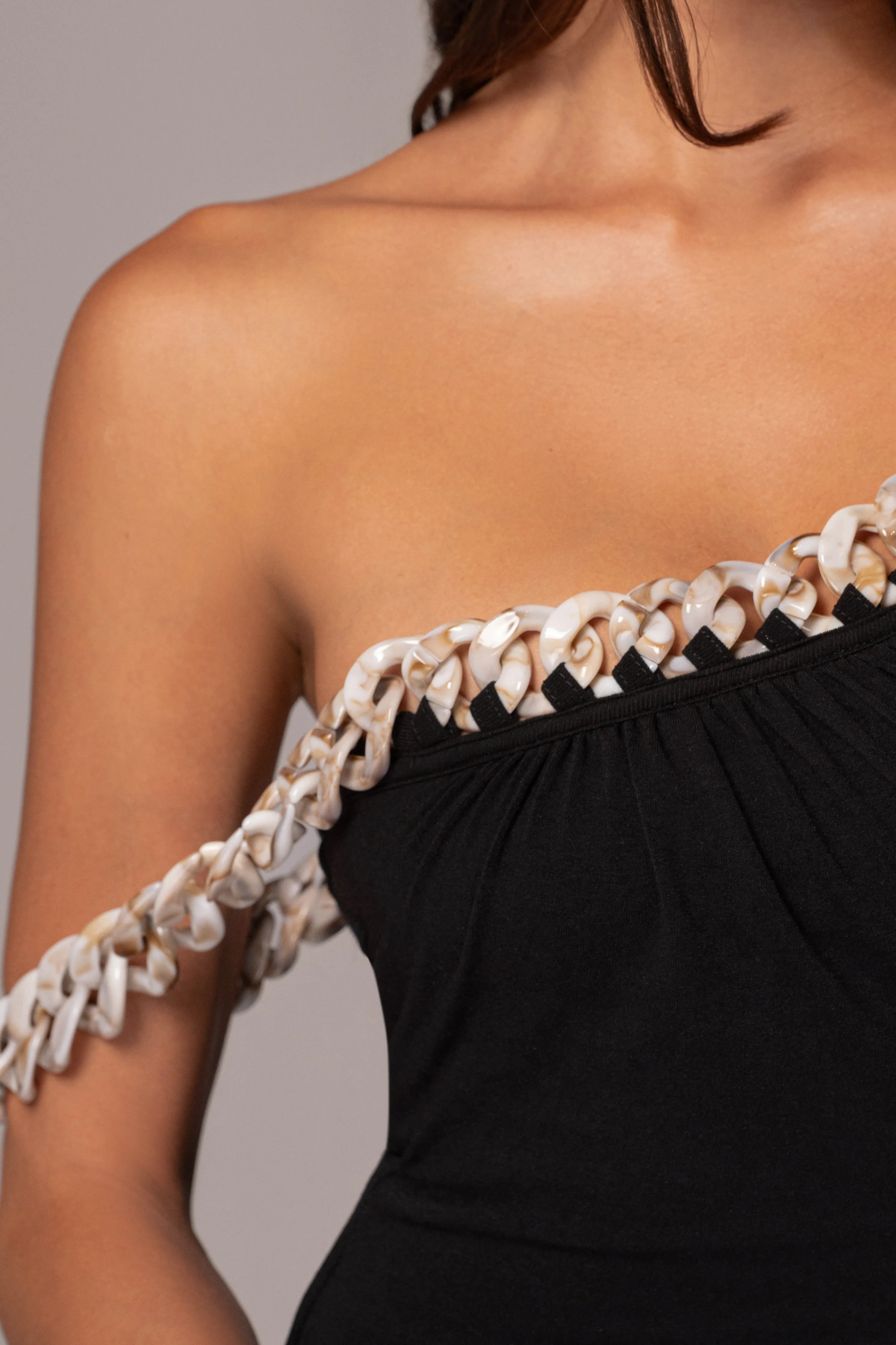 This season, redefine your style with our Black Monette Asymmetric Dress. This stunning maxi dress features an asymmetrical neckline with subtle ruching and elegant acrylic chain straps for added sophistication. Crafted from a soft double lined fabric ensuring a comfortable and flattering fit. Stretchy.