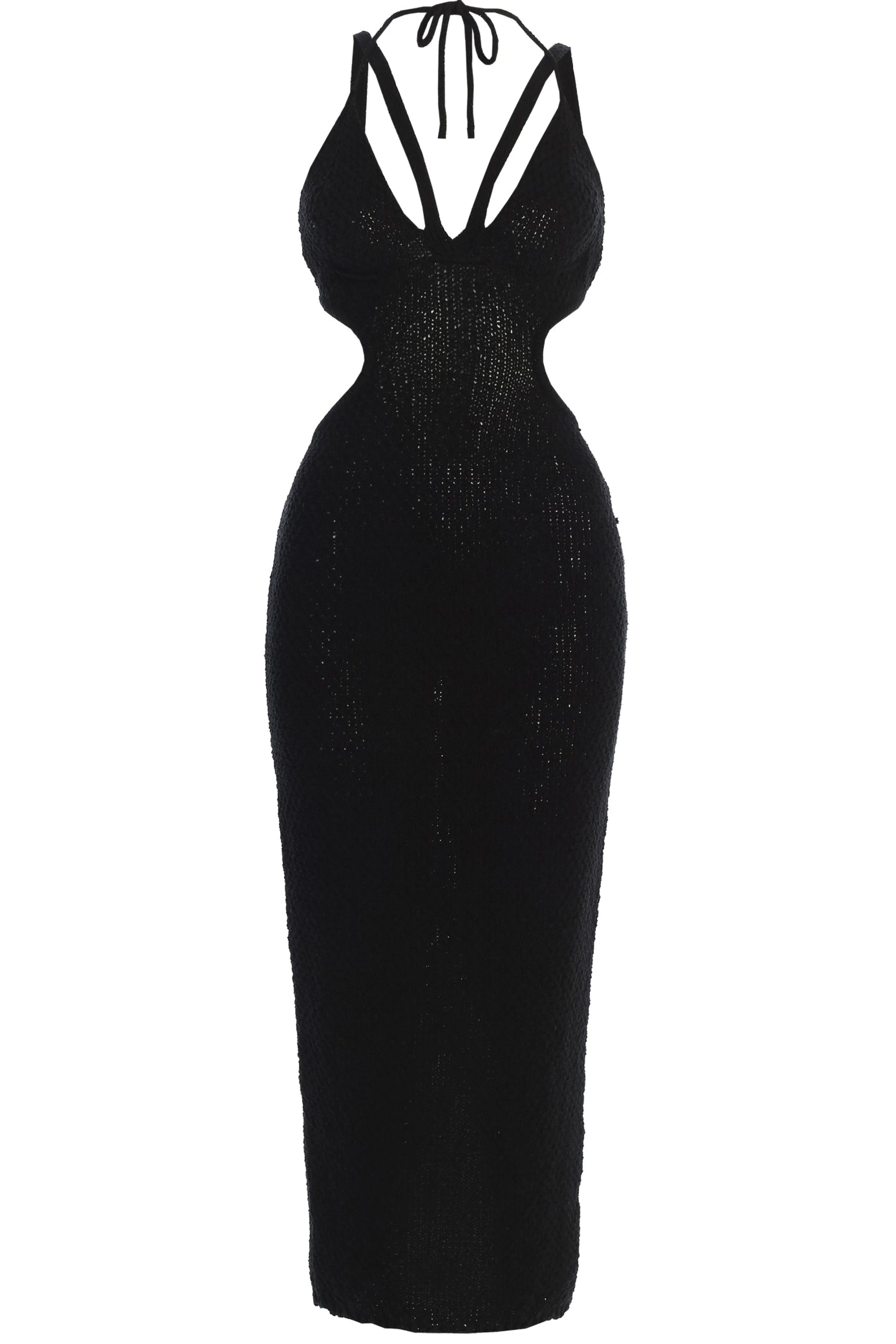 Explore new waters in ourBlack Serenity Cutout Midi Dress. Crafted in soft crochet knit, this fitted midi dress features a halter neckline with neck tie closures, stylish front straps, and waist cutouts. Stretchy.