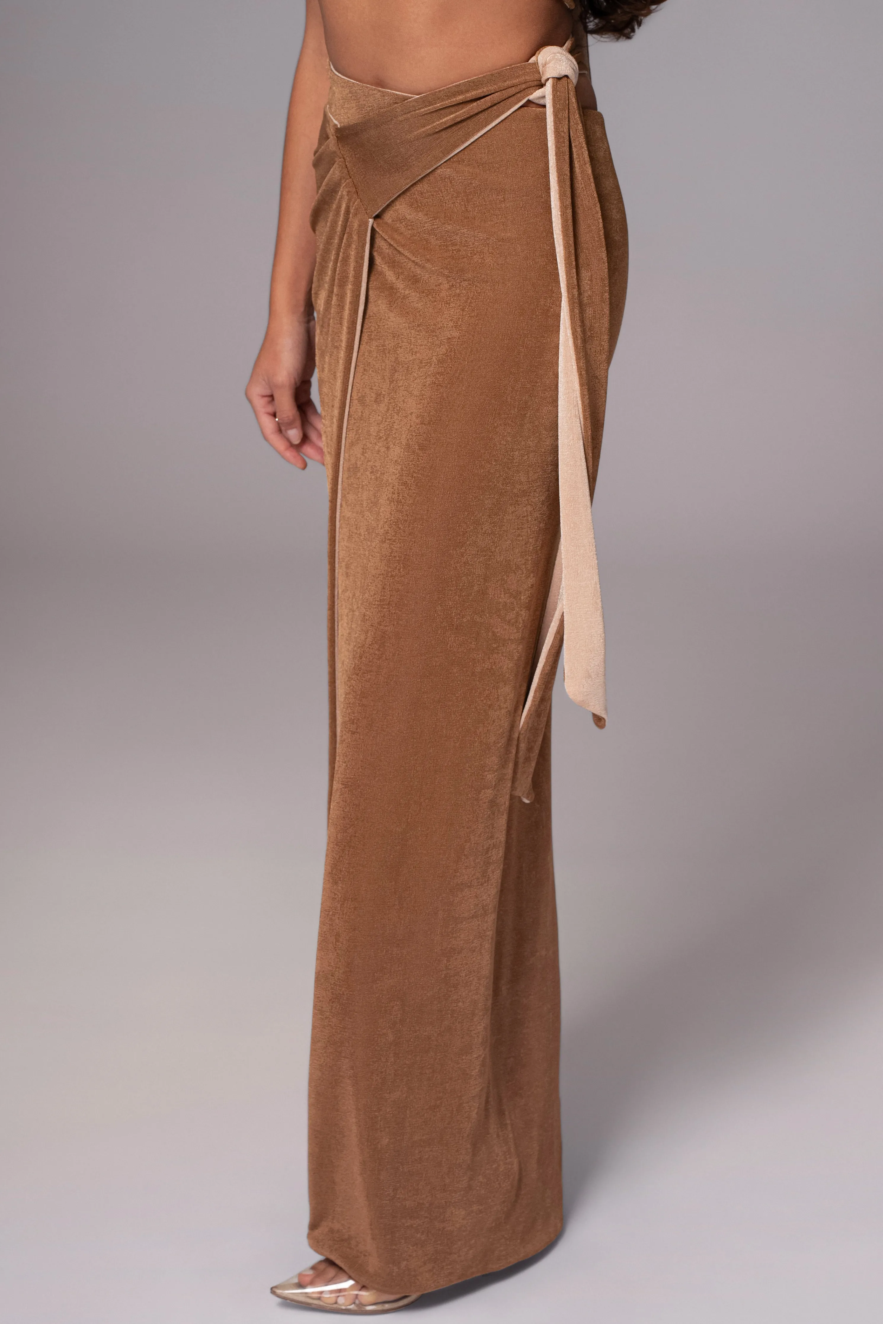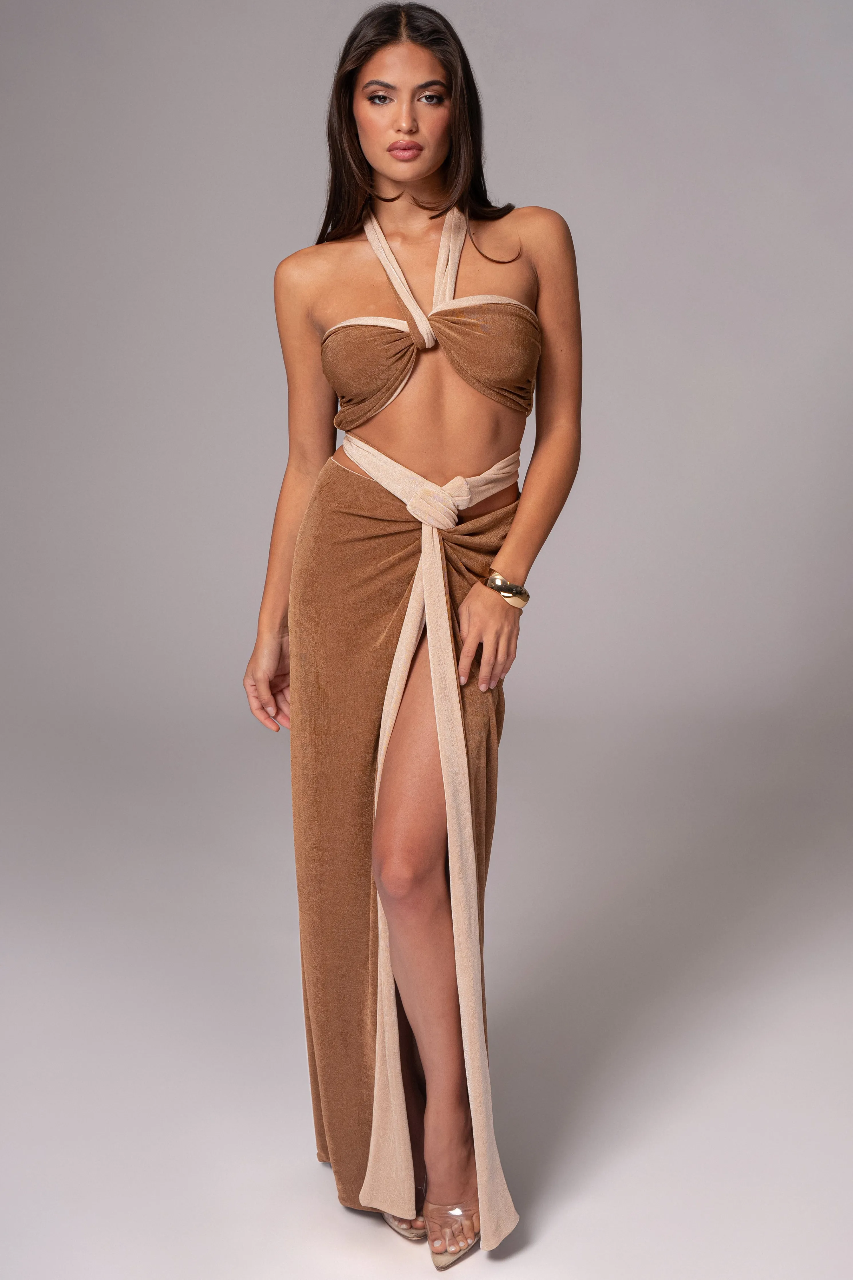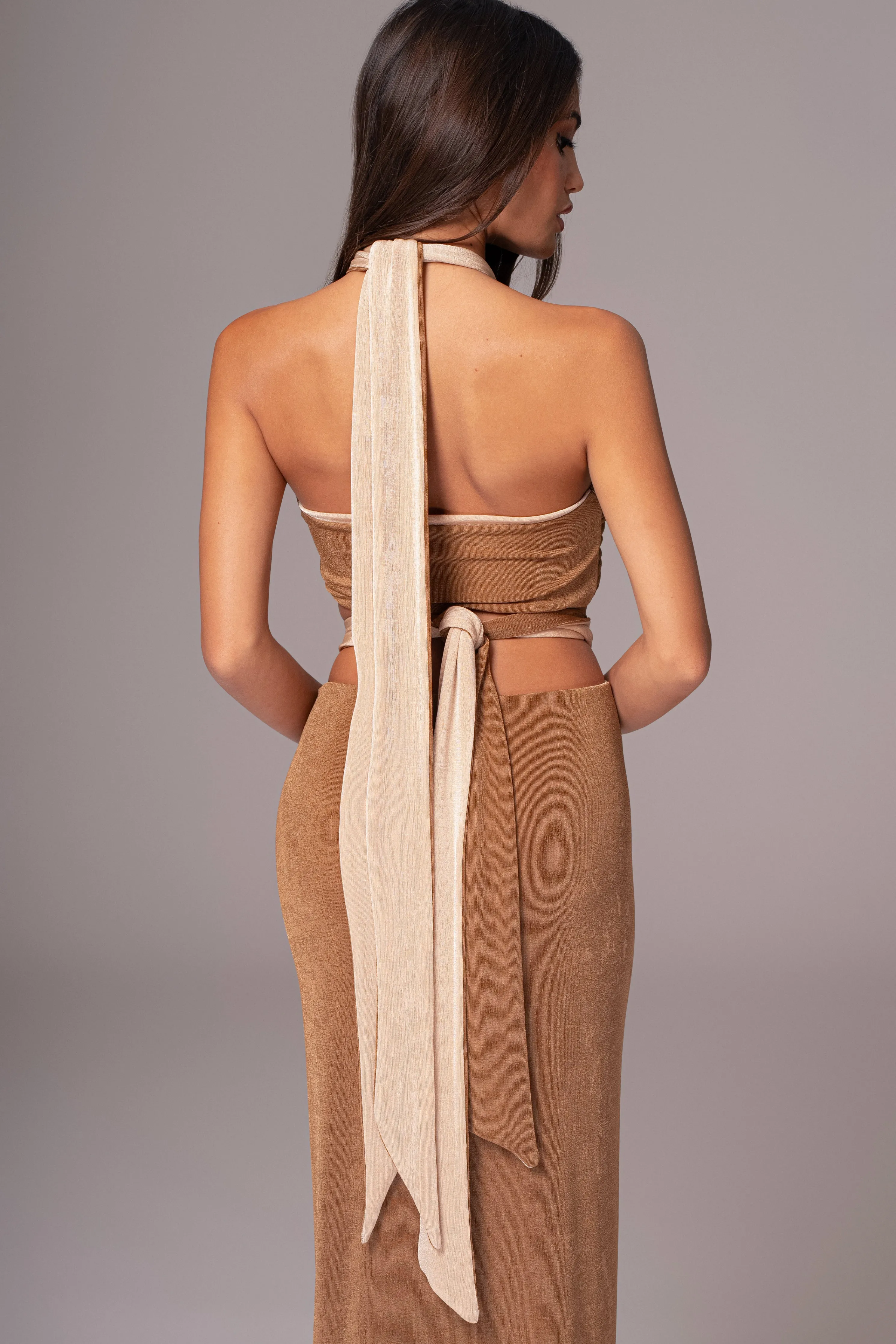 Unlock a world of style versatility with our Reversible Collection. Style meets versatility with our Brown/Beige Venus Reversible Skirt Set. This modern set includes a bandeau-style top with multi-way straps that can be wrapped in various ways for customizable looks. The matching high-waisted skirt features shirring and back tie straps that add a touch of elegance. Made from double-lined slinky fabric, this set can be reversed for a whole new look, giving you two styles in one. Sold as set. Stretchy.