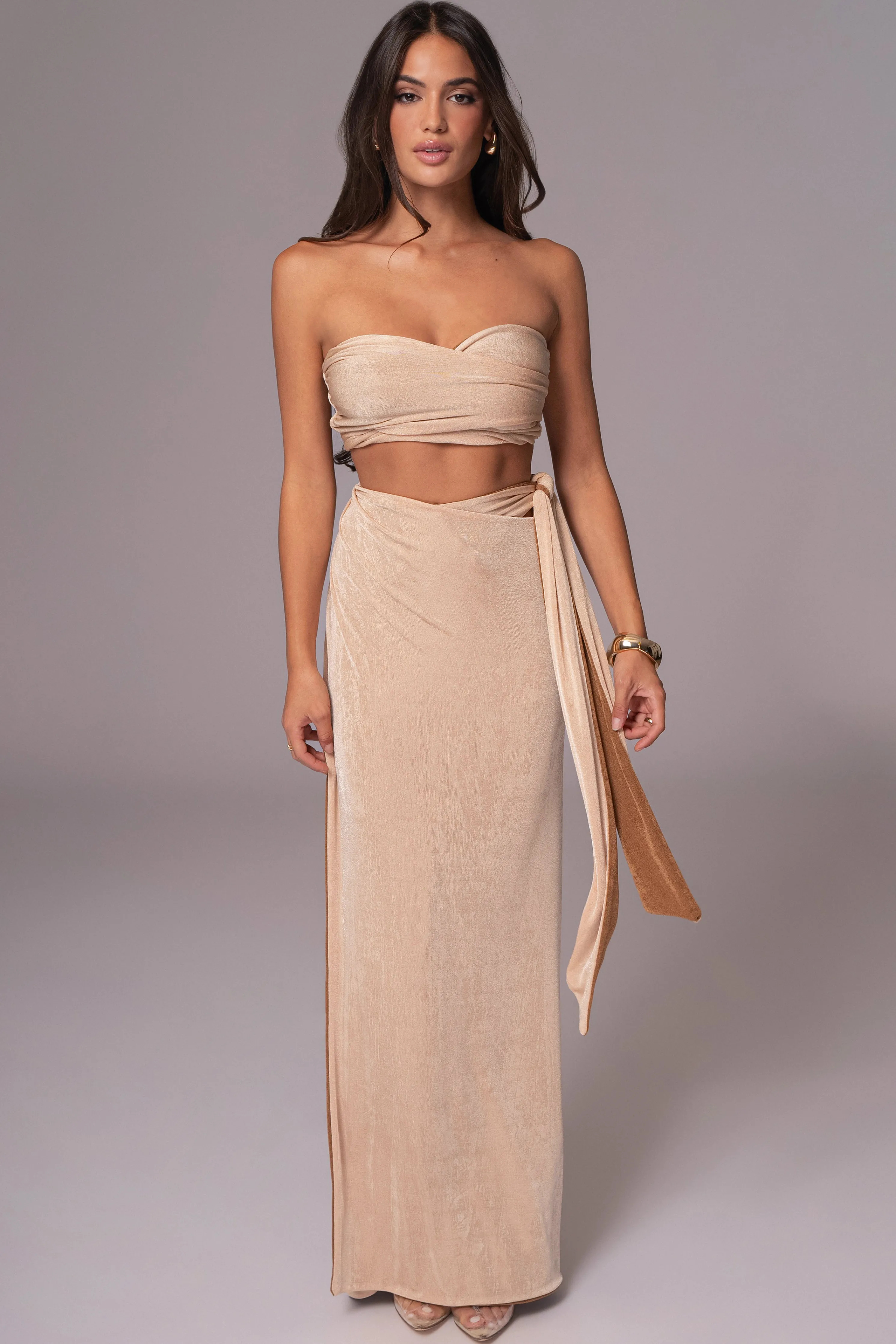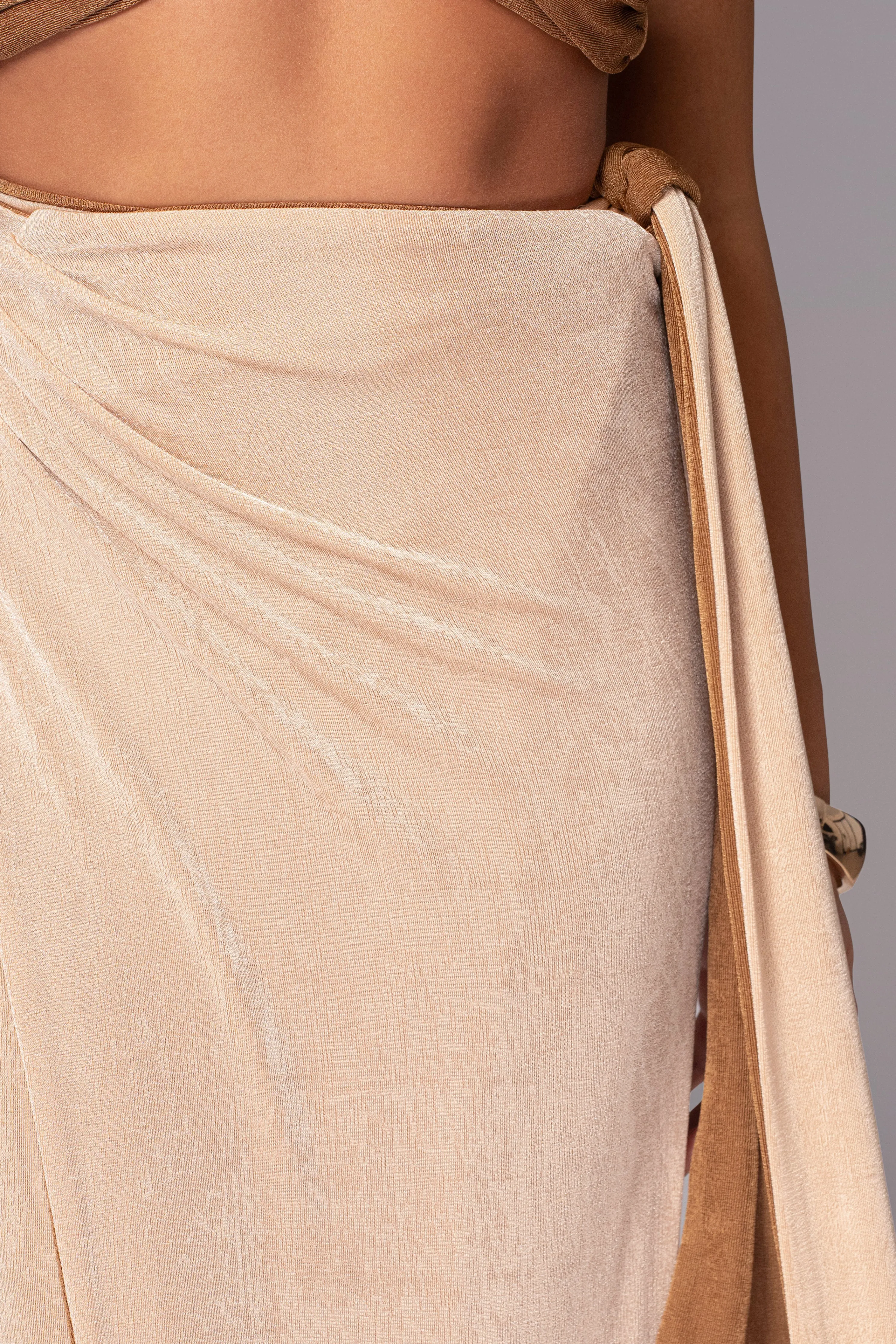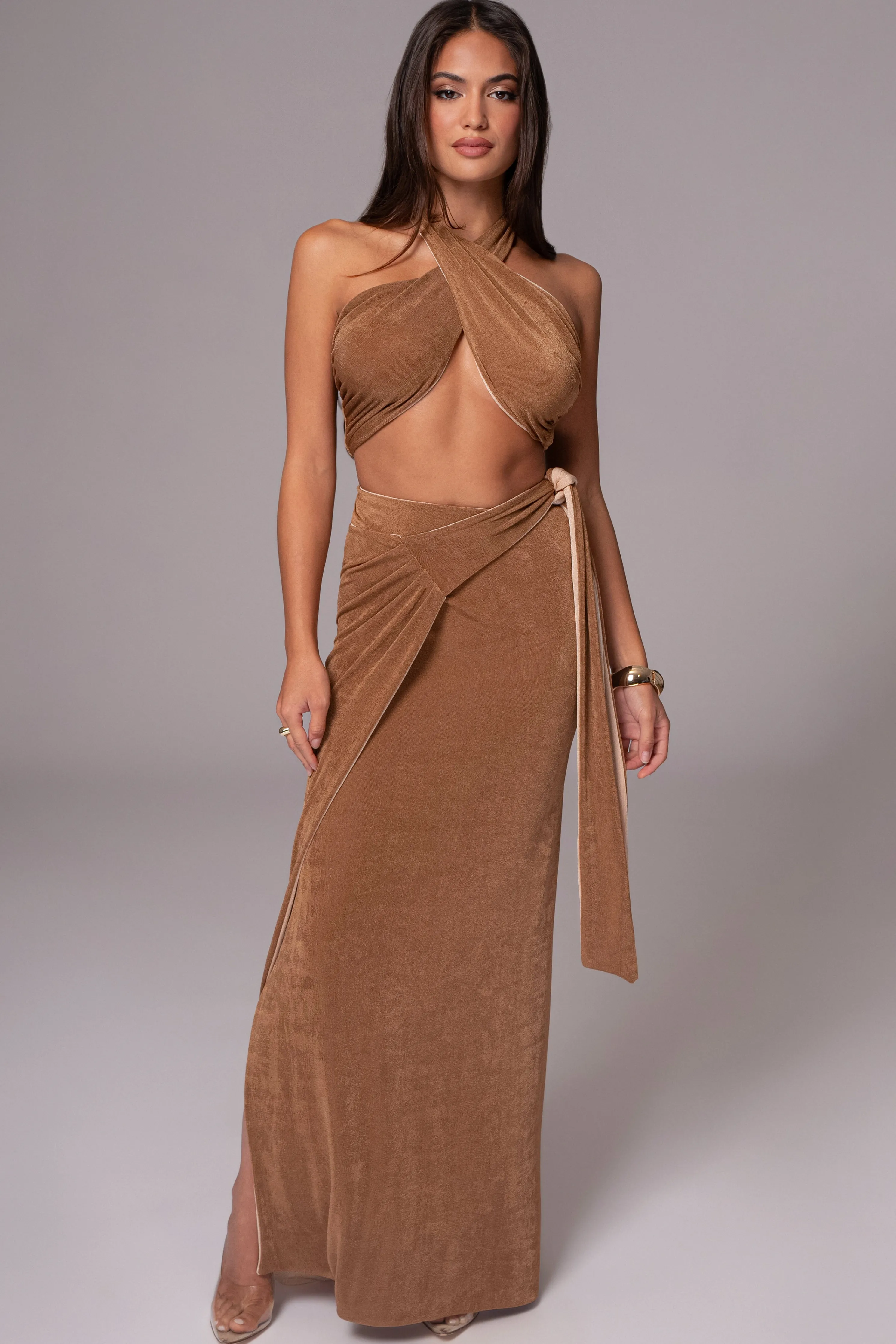 Unlock a world of style versatility with our Reversible Collection. Style meets versatility with our Brown/Beige Venus Reversible Skirt Set. This modern set includes a bandeau-style top with multi-way straps that can be wrapped in various ways for customizable looks. The matching high-waisted skirt features shirring and back tie straps that add a touch of elegance. Made from double-lined slinky fabric, this set can be reversed for a whole new look, giving you two styles in one. Sold as set. Stretchy.