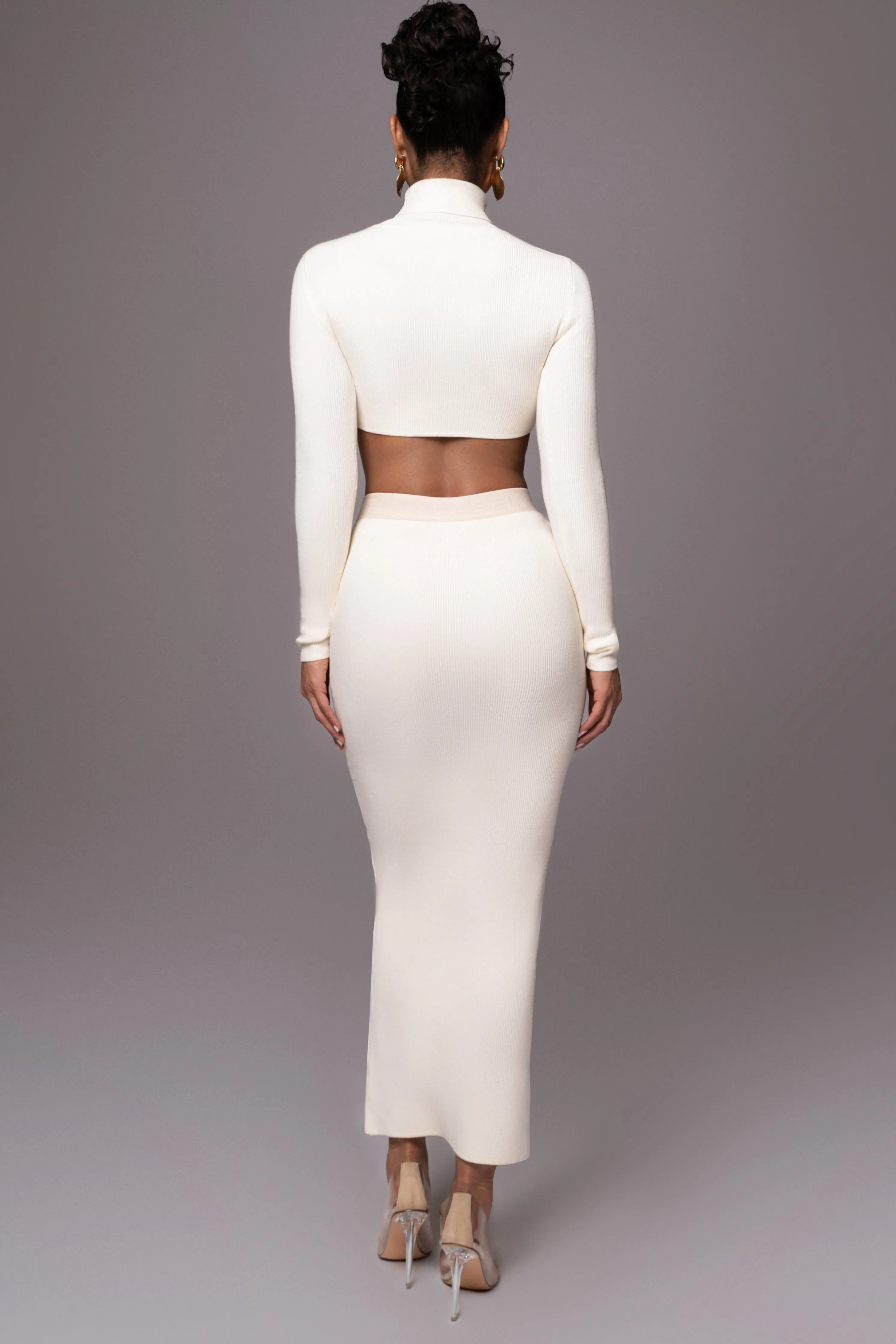 Our Buttercream Anise Ribbed Skirt Set is a winter essential. This versatile set includes a long-sleeve top with a turtleneck and cropped hem. The matching skirt highlights a pencil style silhouette with a high-waist and elastic waistband embossed with our Jluxlabel logo. Crafted from soft ribbed fabric, this set ensures comfort in any weather. Sold as a set. Single-lined. Stretchy.