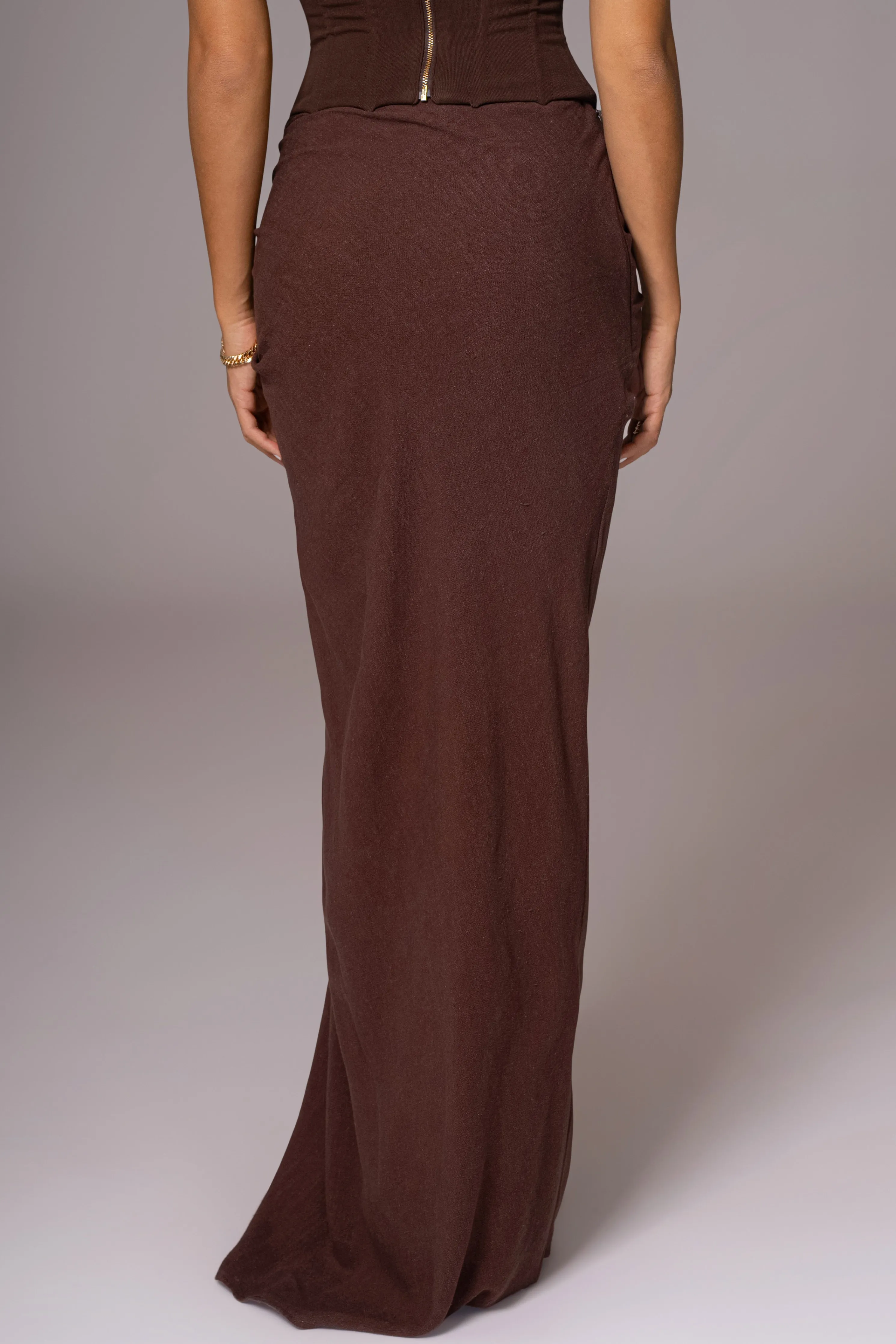 Draped to perfection proving life’s better in linen with our, Chocolate Noelia Linen Slit Skirt. Crafted in a fresh linen material, this maxi skirt features a drape design with a stylish rope drawstring and a slit on the side. Hidden side zipper for closure. Pair with our FENIX LINEN CORSET for a full look. No stretch. Single lined.