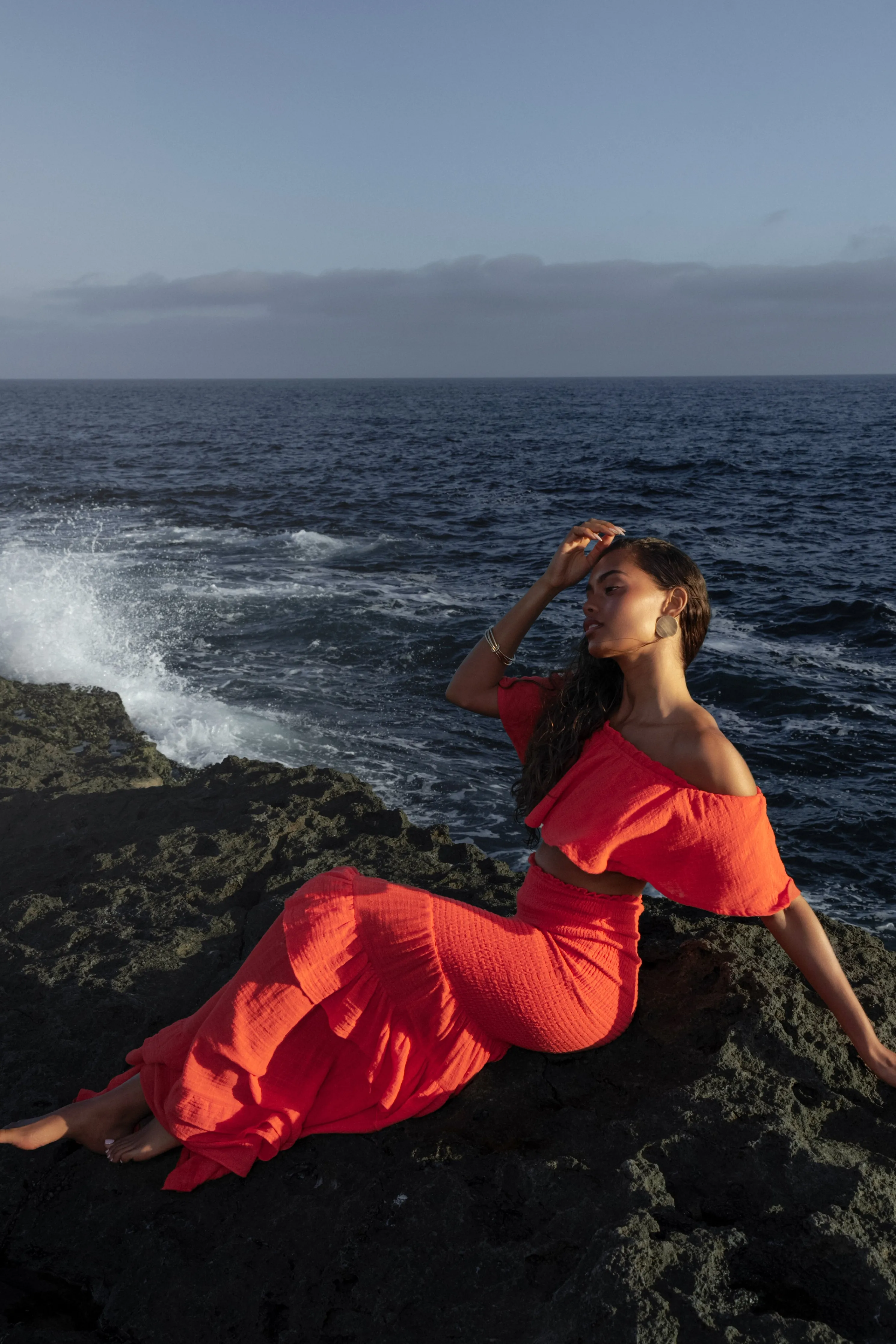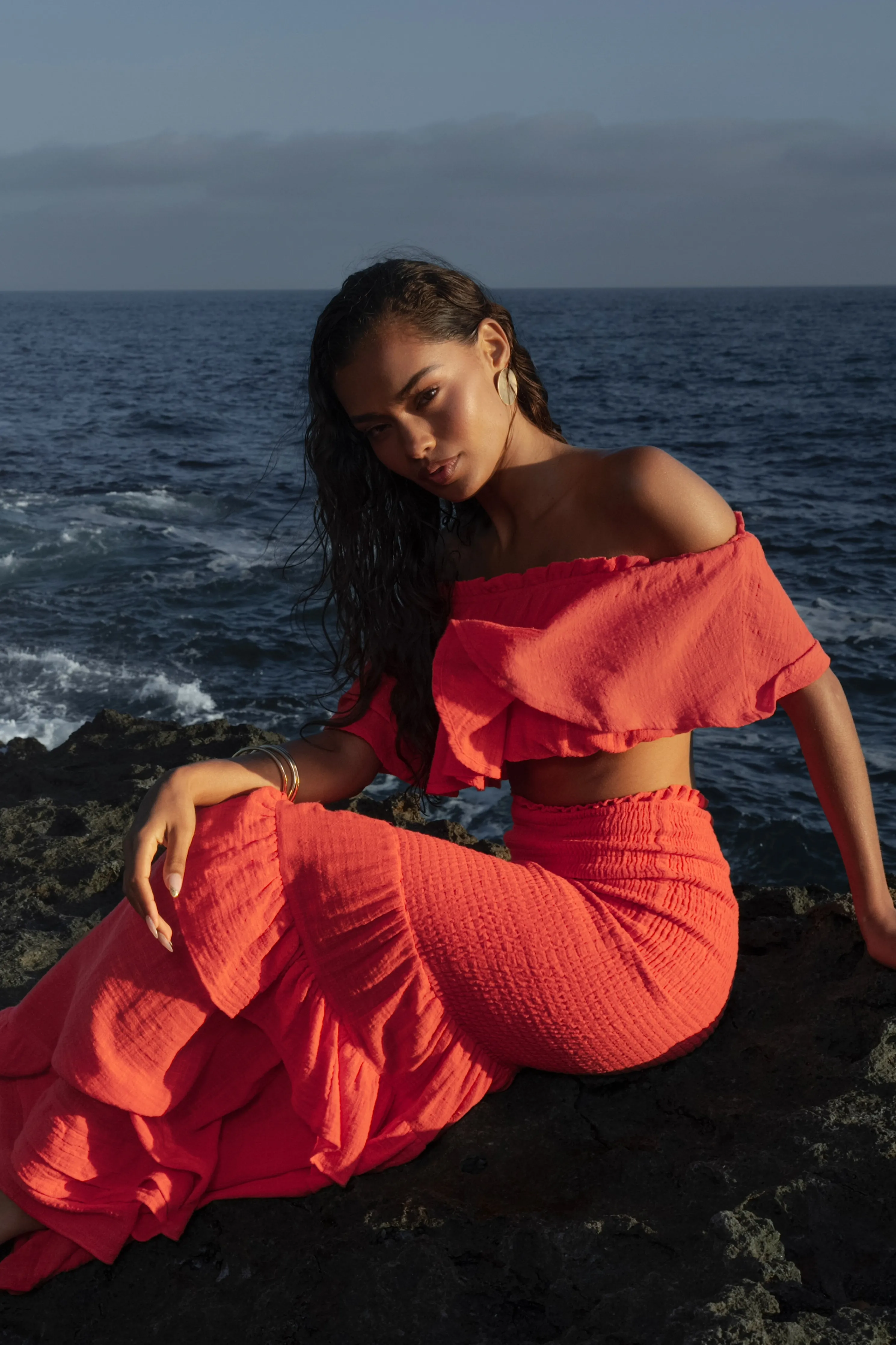 The perfect vacation look starts in our Coral Sienna Ruffled Skirt Set. This beautiful two piece skirt set is designed with lightweight Cotton fabric for a breathable feel. Featuring a sweet ruffle top with off the shoulder neckline and a cropped hem. Complete with interior lining and elastic hem for extra stretch. The matching maxi skirt features a flattering smocked design leading to ruffled tiers that complete the look. Stretchy. Sold as set.