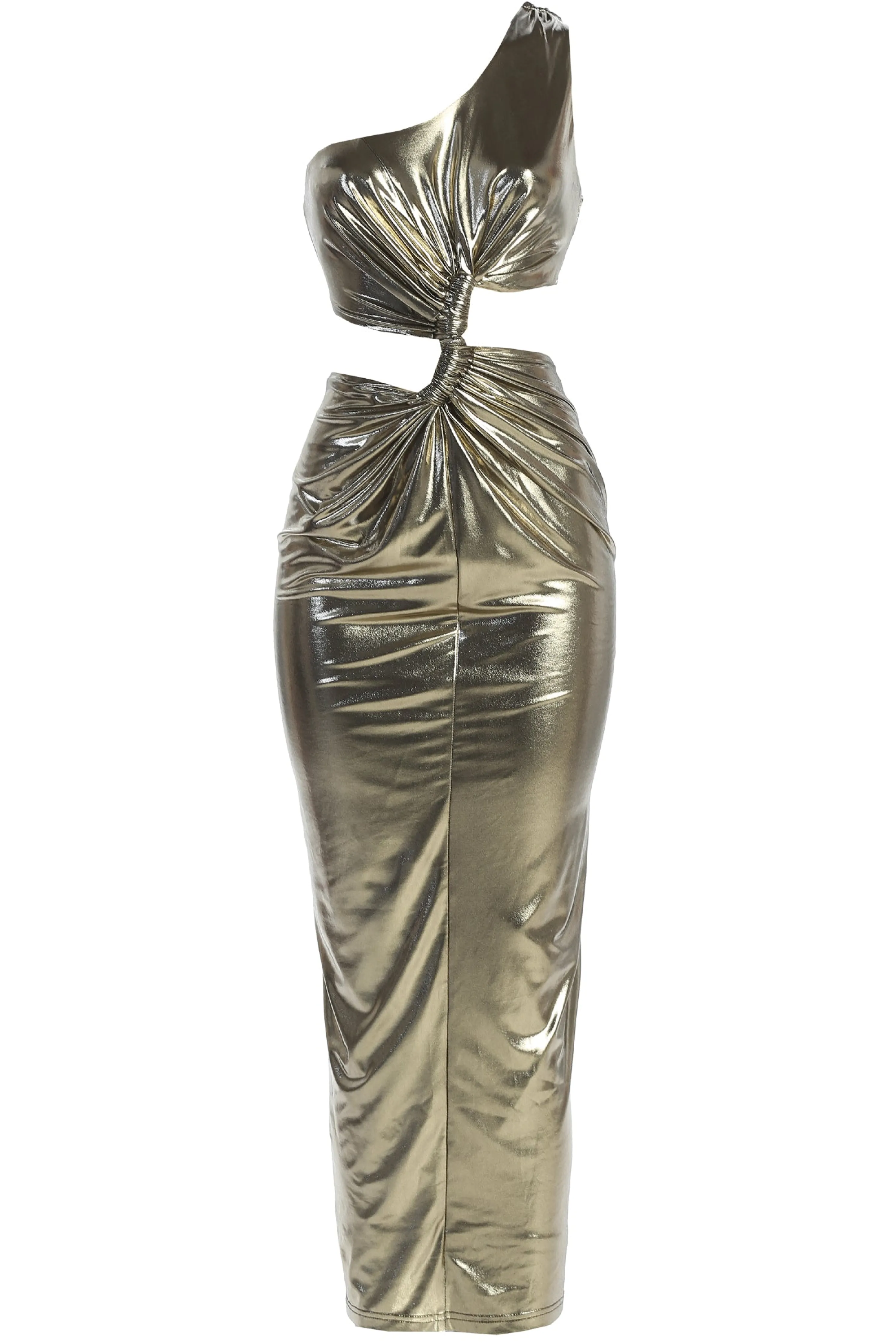 The Gold Joce One Shoulder Maxi Dress is a striking embodiment of modern elegance. This stylish one-shoulder maxi dress features an asymmetric neckline with waist cutouts in a fitted silhouette with back slit hem. Crafted in a luxurious double lined metallic fabric for superior fit and quality. Stretchy.