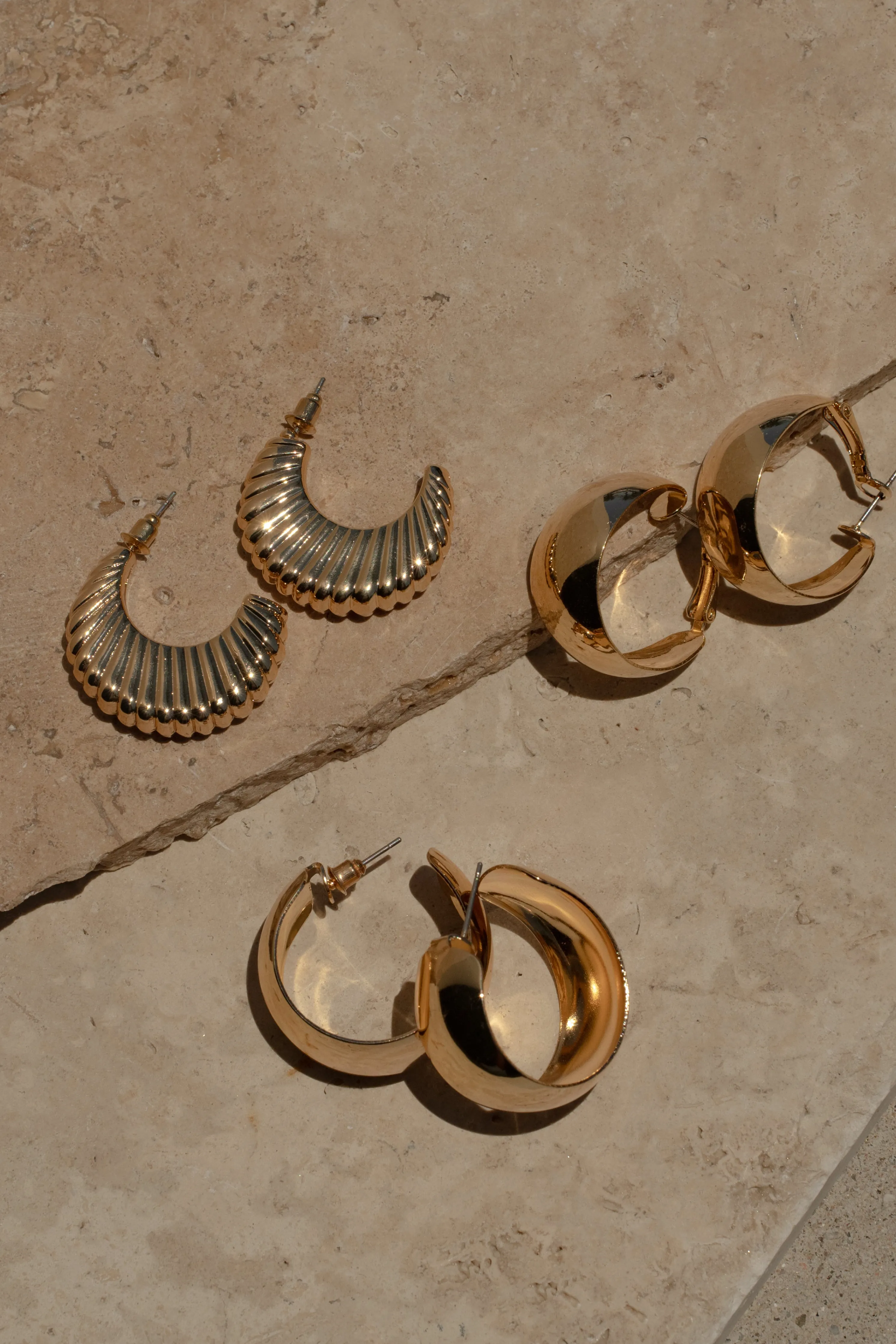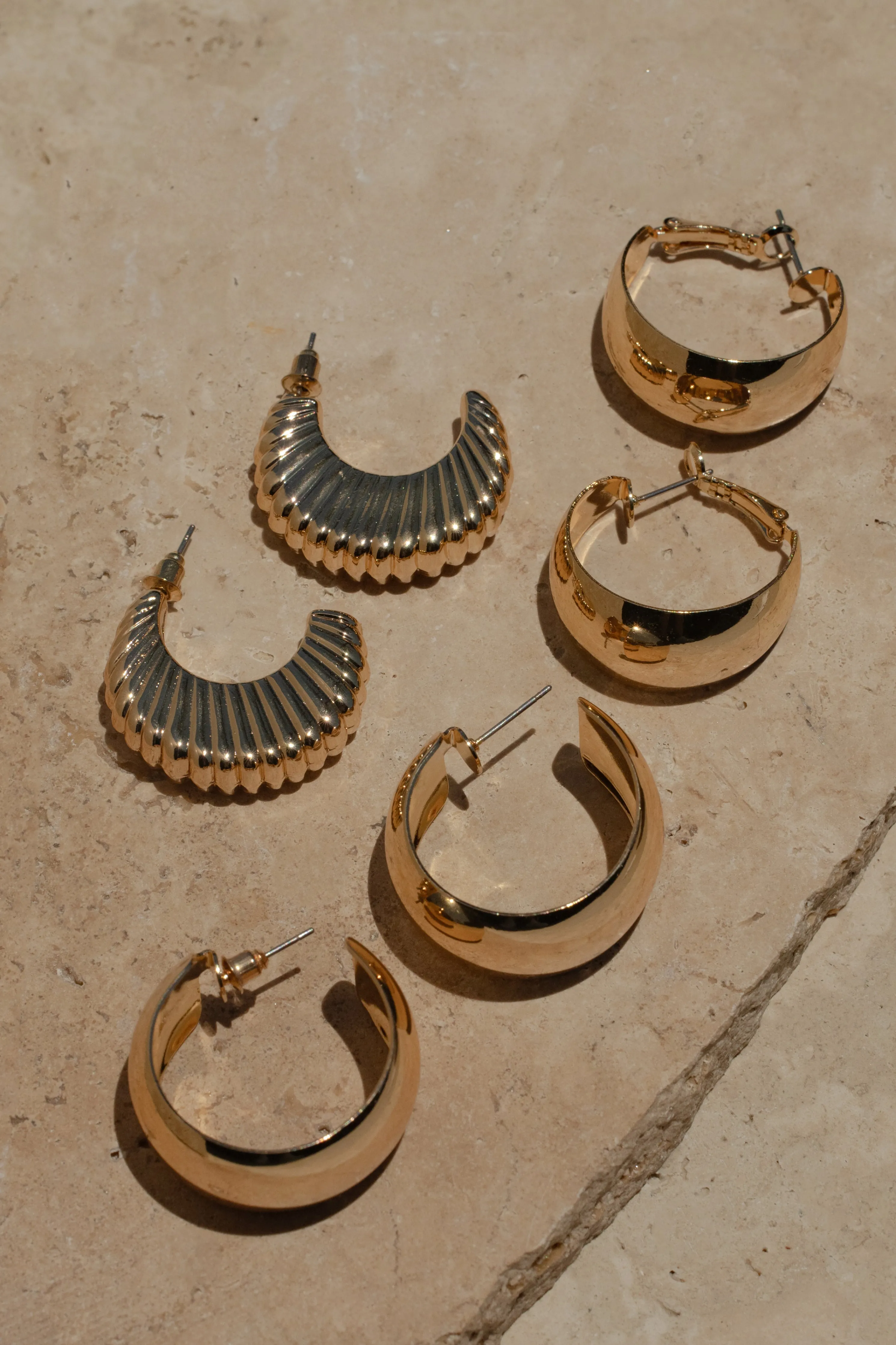 Shimmer all Summer with our Gold Natti Earrings Set. This modern earring set features 3 different hoop designs all in a stunning gold-tone finish. Latch back closure. Sold as set.