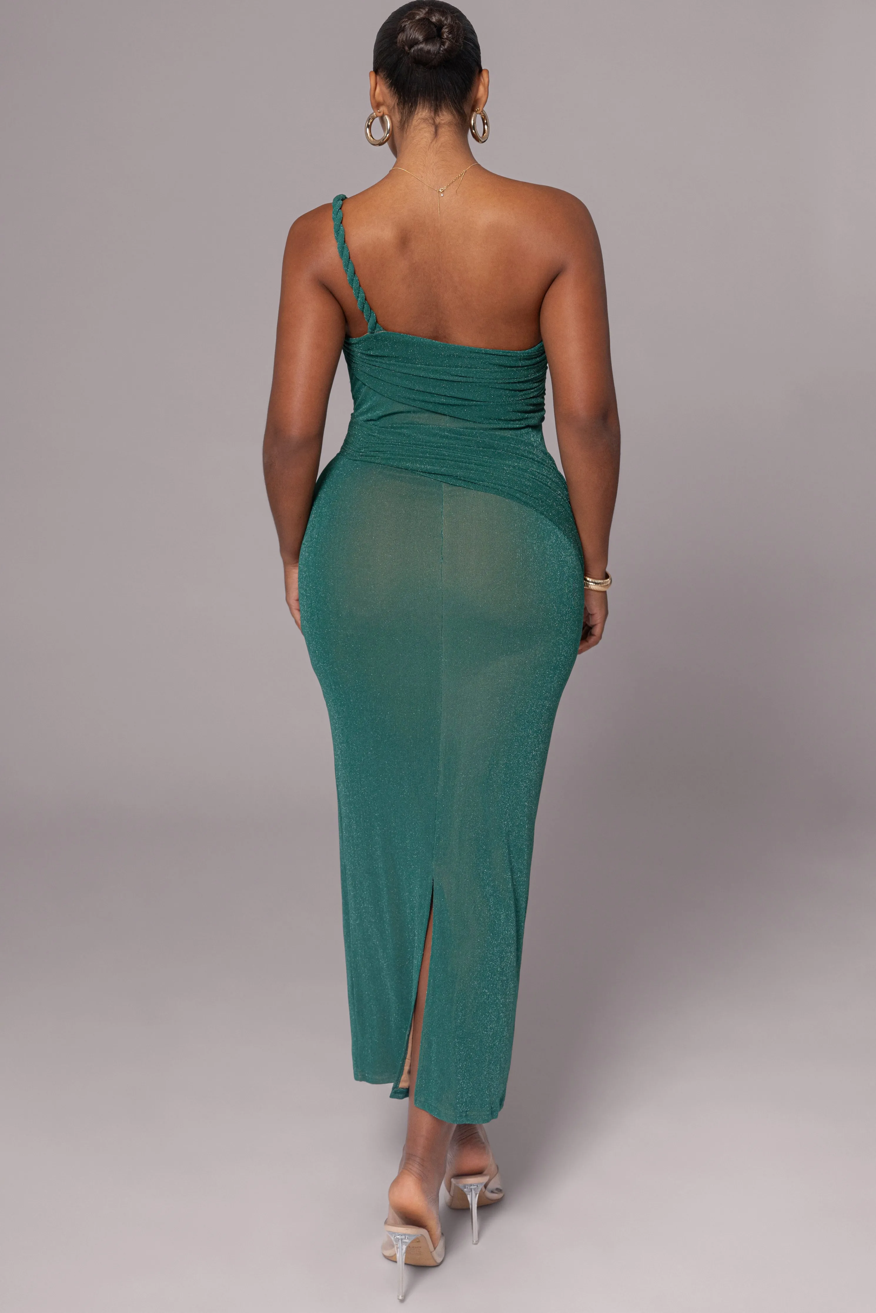 Radiate Holiday charm with our Green Alari One-Shoulder Maxi Dress. Expertly fashioned from lurex mesh fabric for a radiant finish, featuring a twisted shoulder strap and elegantly draped shirring for a contemporary flair. Perfect for soirées, this dress comes with nude underlining for added comfort and coverage. Back slit hem. Stretchy.