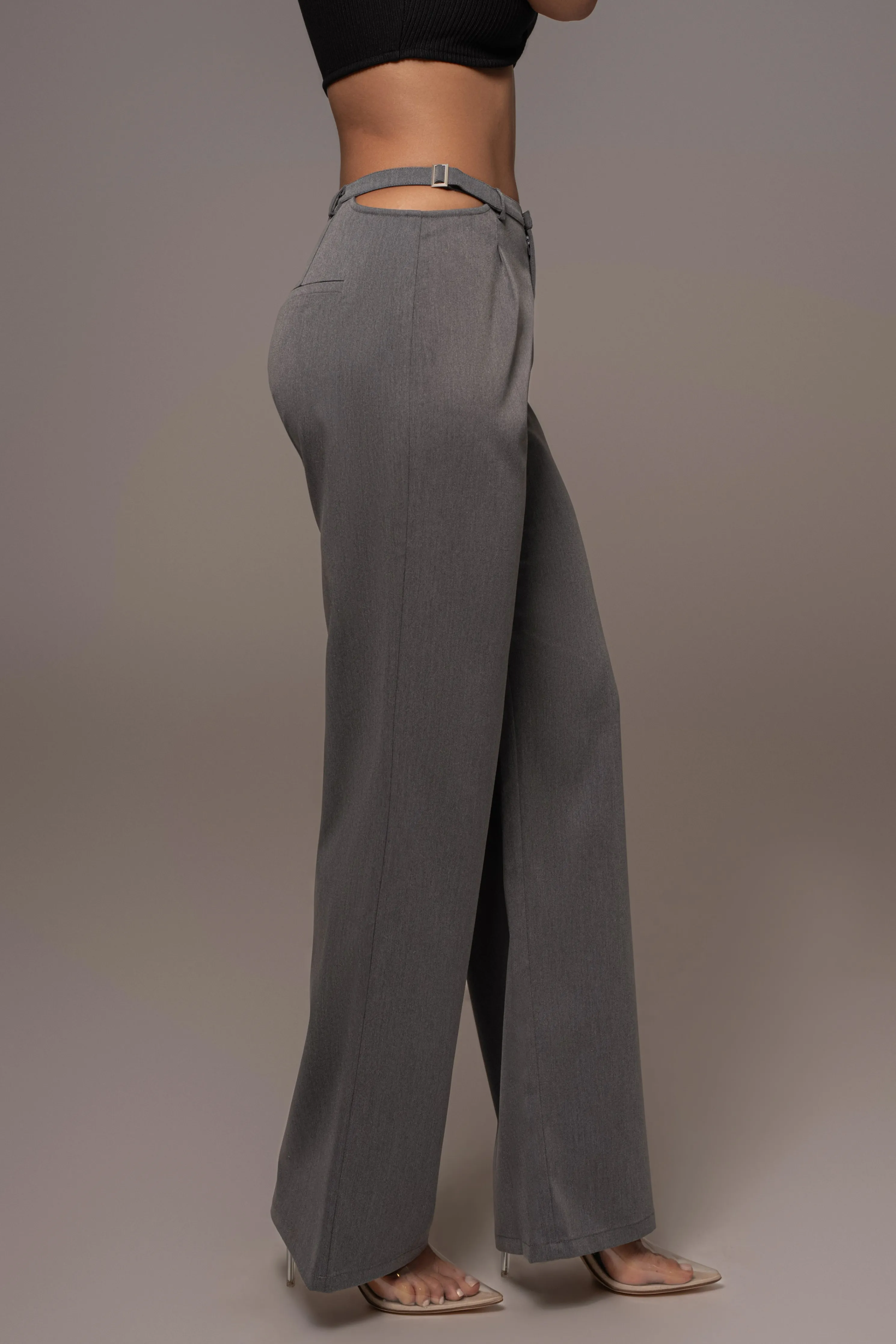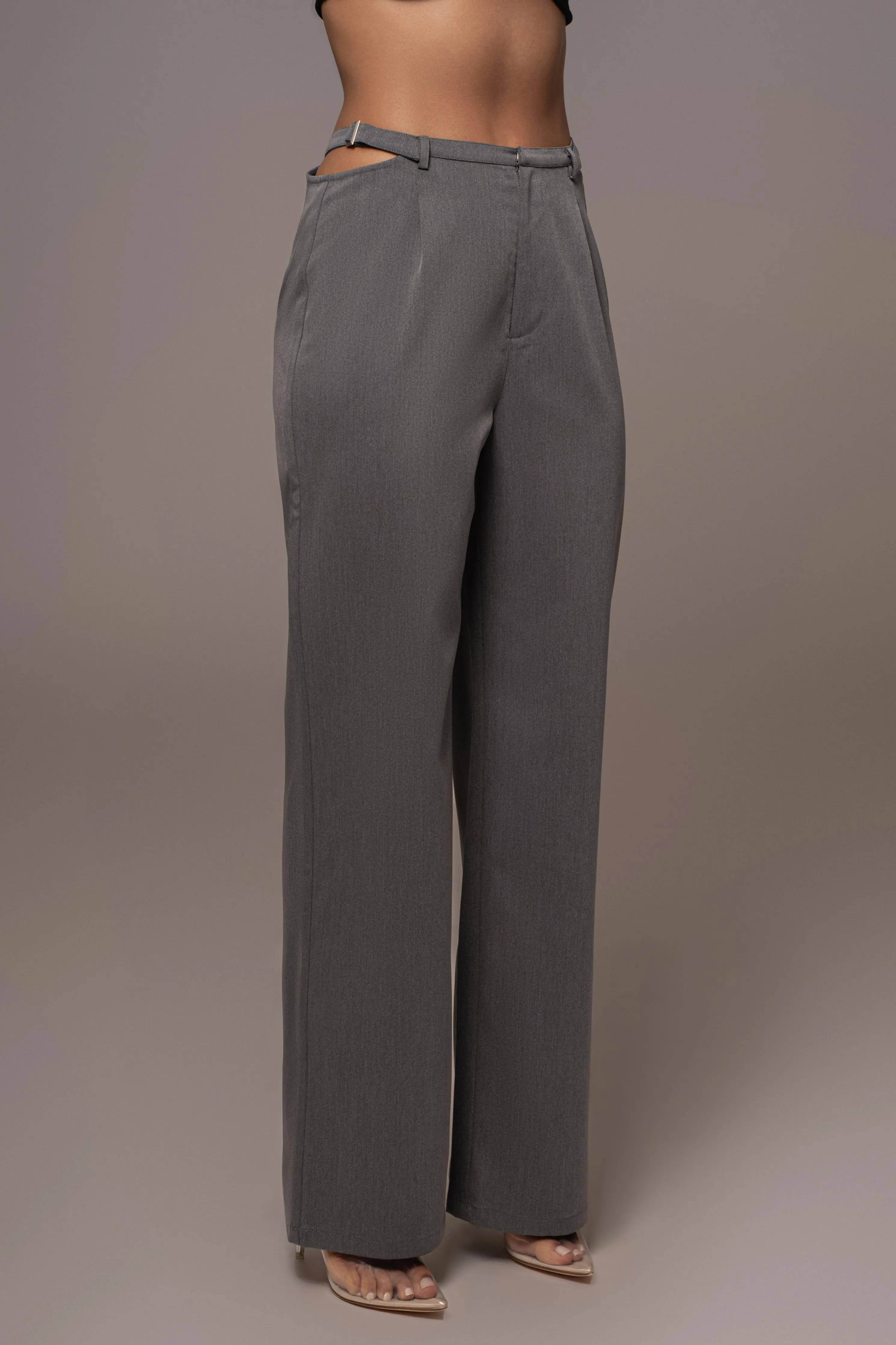 Our Grey Symone Cutout Pants offer timeless elegance and sophistication. Boasting a darted front detail, edgy cutout waist, faux back pockets, and straight leg hems. These trousers bring modern style to any look with a hidden clasp/zipper closure and metal hardware embellishment. No stretch. Single lined.