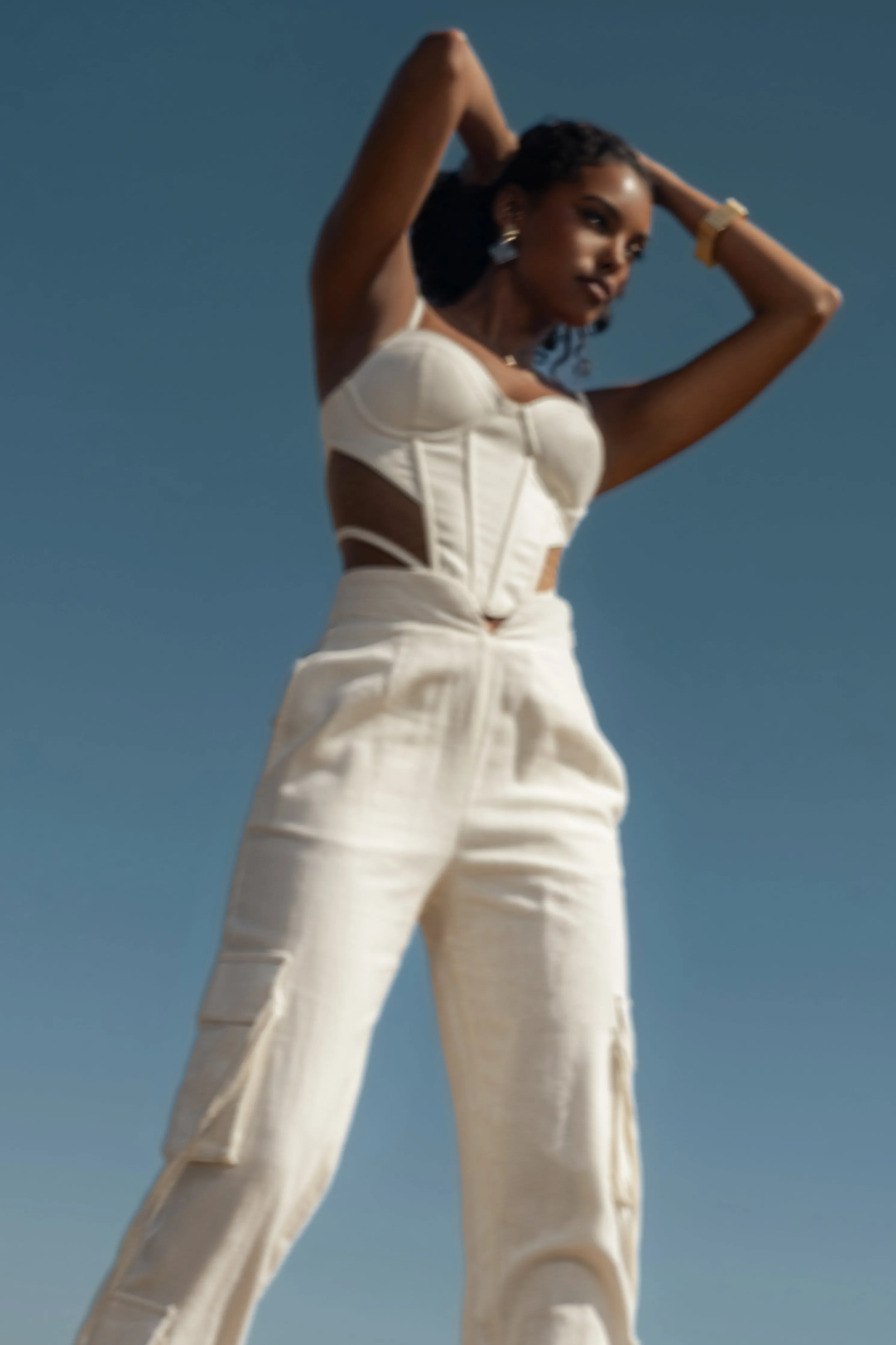 Introducing the Ivory Horizon Linen Corset – the perfect blend of style and support. Crafted from fresh linen fabric, this corset top features adjustable shoulder straps and padded bra cups. The lace-up closures, along with front and back boning, provide a flawless fit, while contrasting mesh panels add a unique touch of elegance. Pair with our Better Half Linen Utility Pants for the full look. Minimal stretch. Minimal stretch. Double lined.