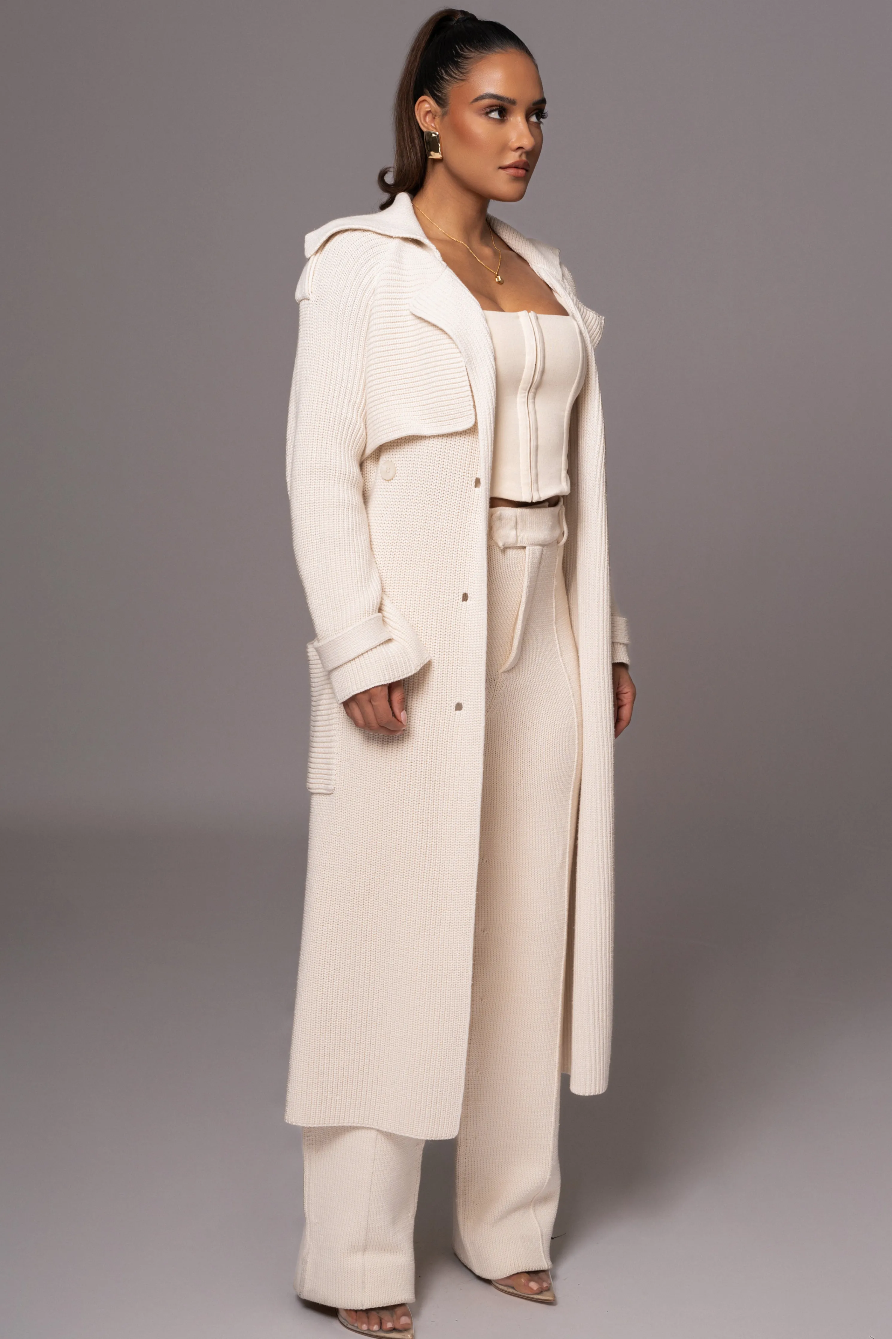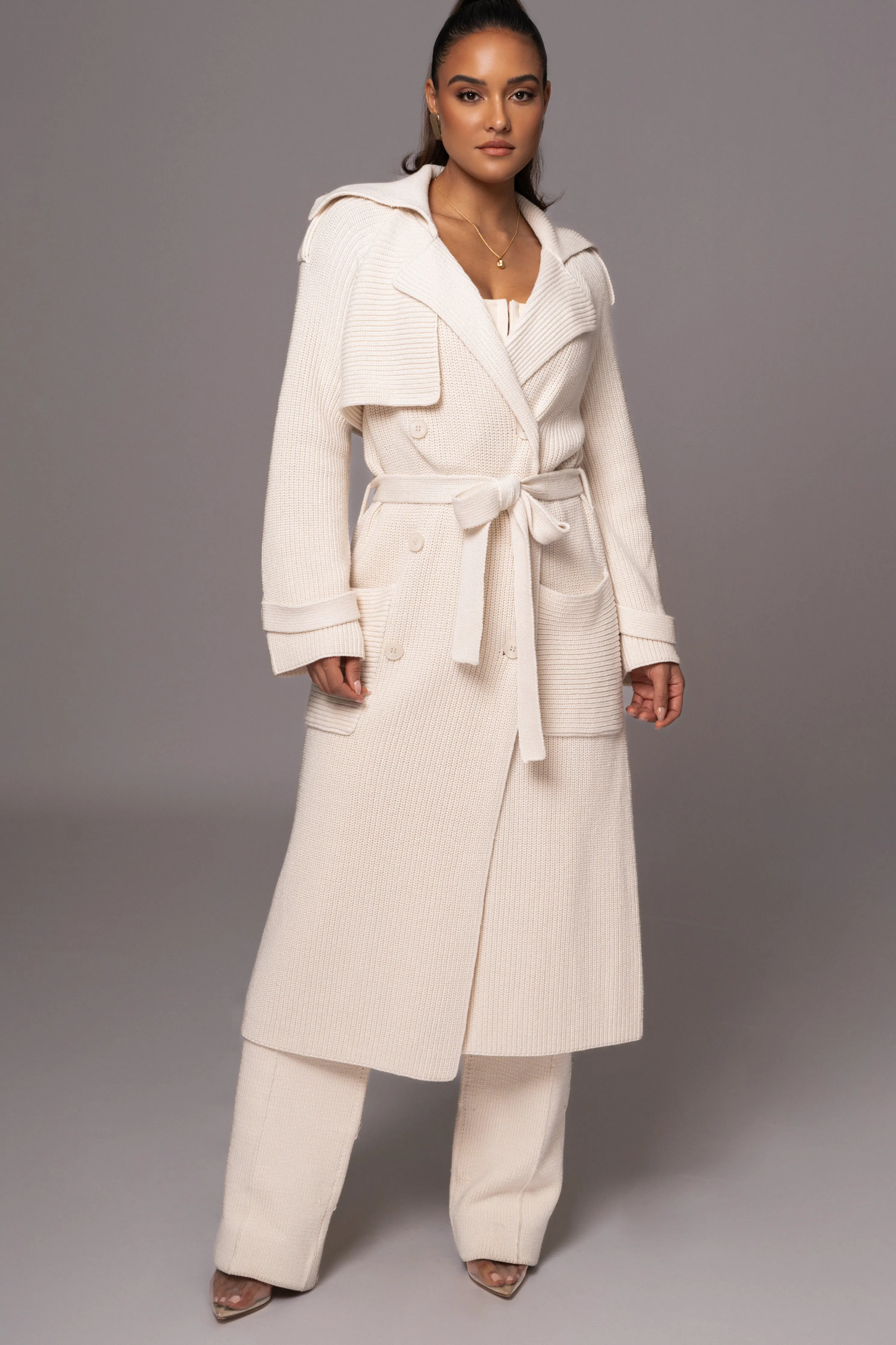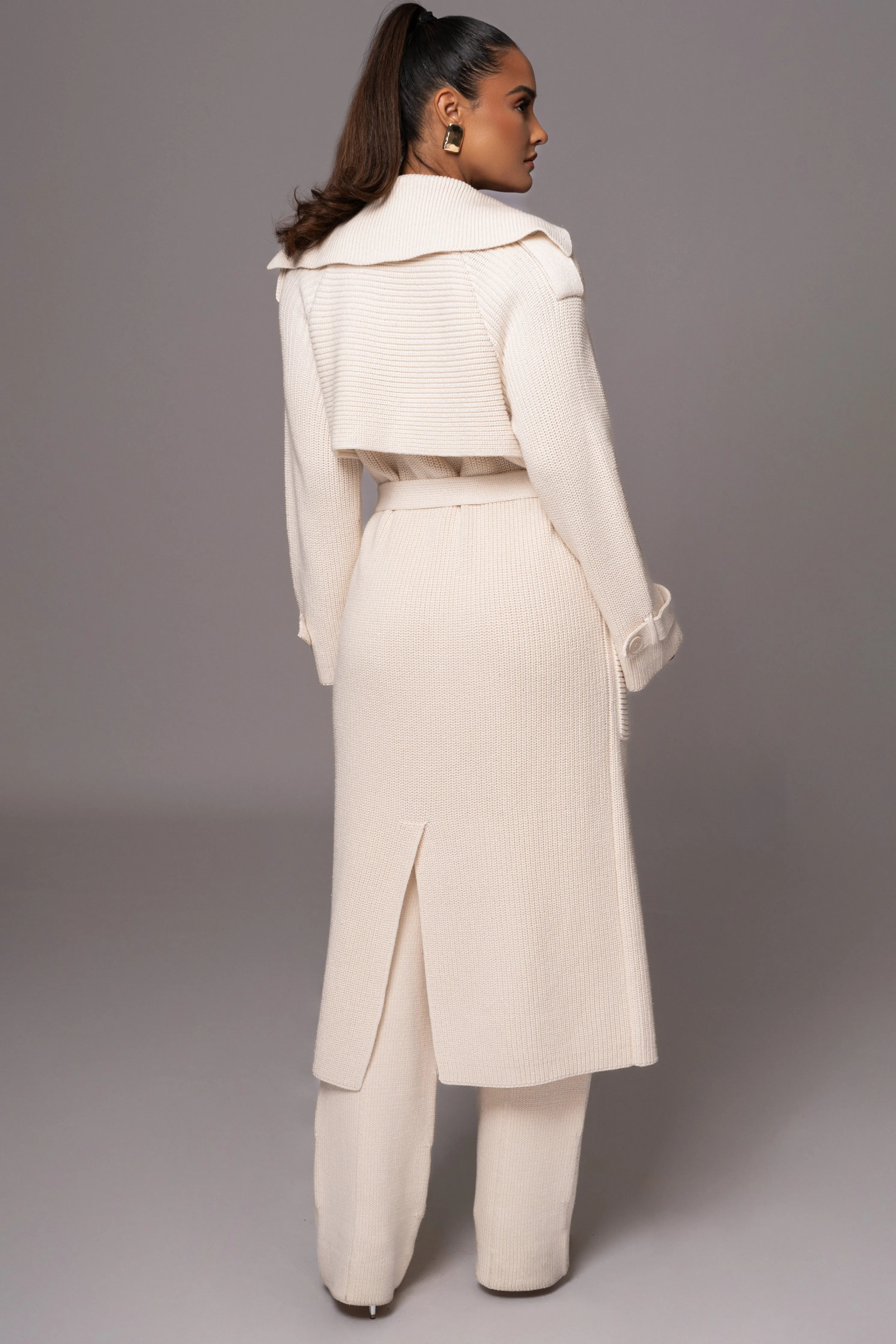 Stay warm in our Ivory Maxinne Knit Coat. This sophisticated piece features a double-breasted front, classic notch lapels, two welt pockets, and a self-tie belt for a polished look. Accented with button tab shoulders and cuffs, this coat is completed with a back slit hem for added flair. Crafted in a ultra soft knit fabric perfect for the season. Pair with our Back In Business Knit Trousers for the full look. Single lined. Stretchy.