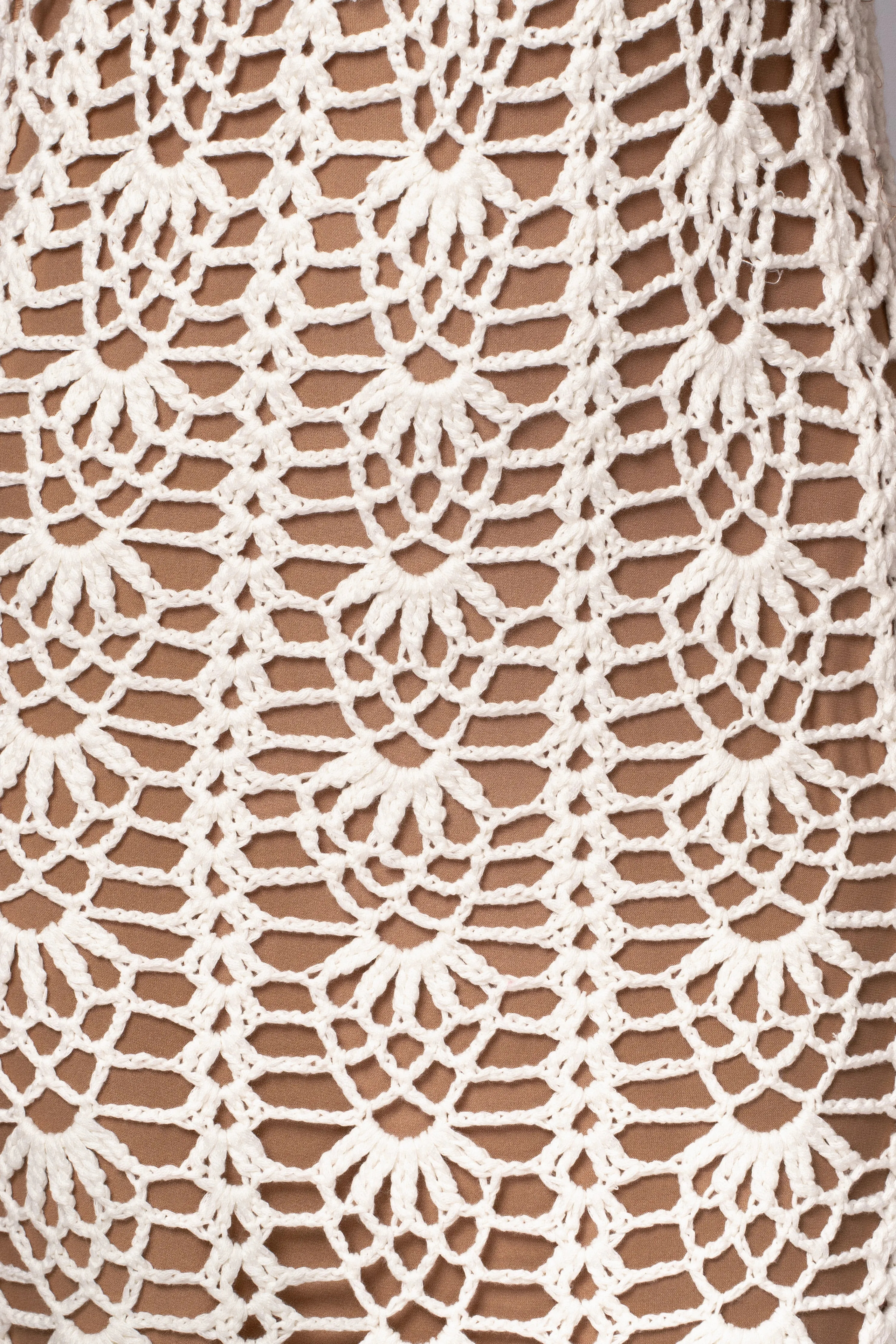 Add a touch of artistic charm to your summer wardrobe with our Ivory Odyssey Maxi Dress. Crafted from a crochet knit fabric in a handmade pattern, this maxi dress features a low neckline with seashell-inspired bra cups, adjustable shoulder straps, and lace up back ties. Complete with padded bra cups and nude underlining for added coverage and comfort. Stretchy.